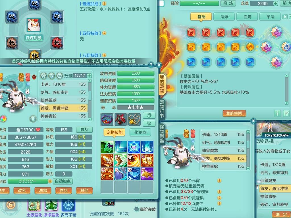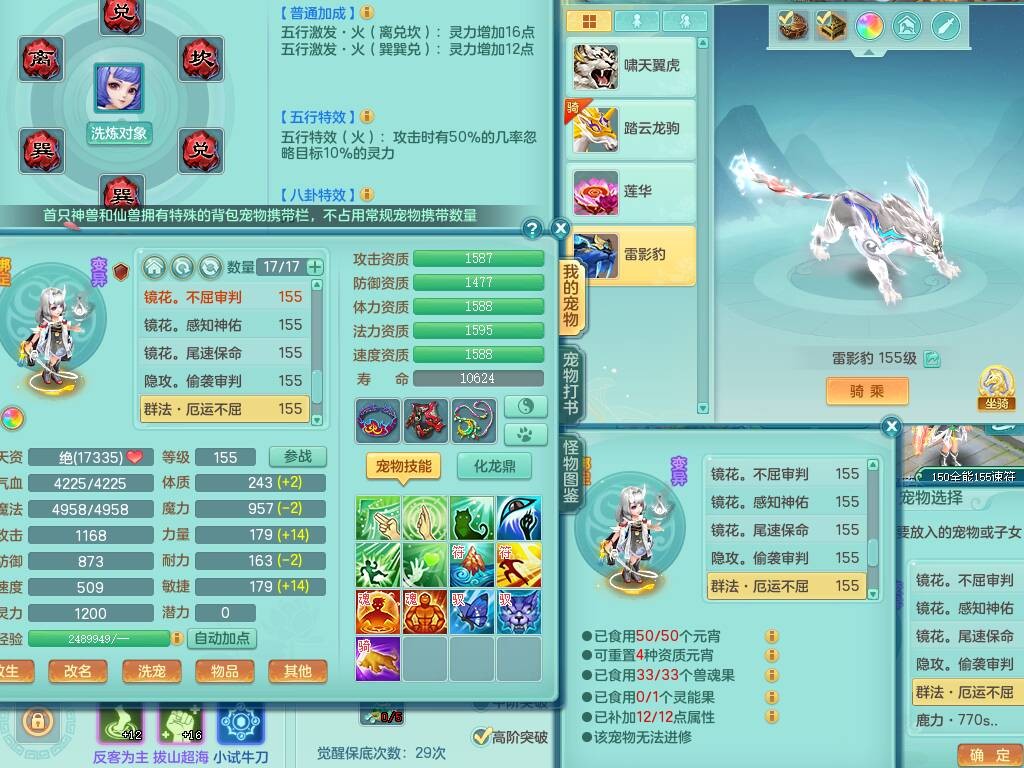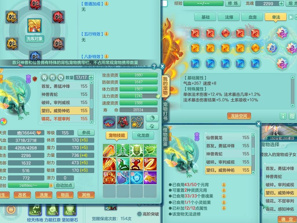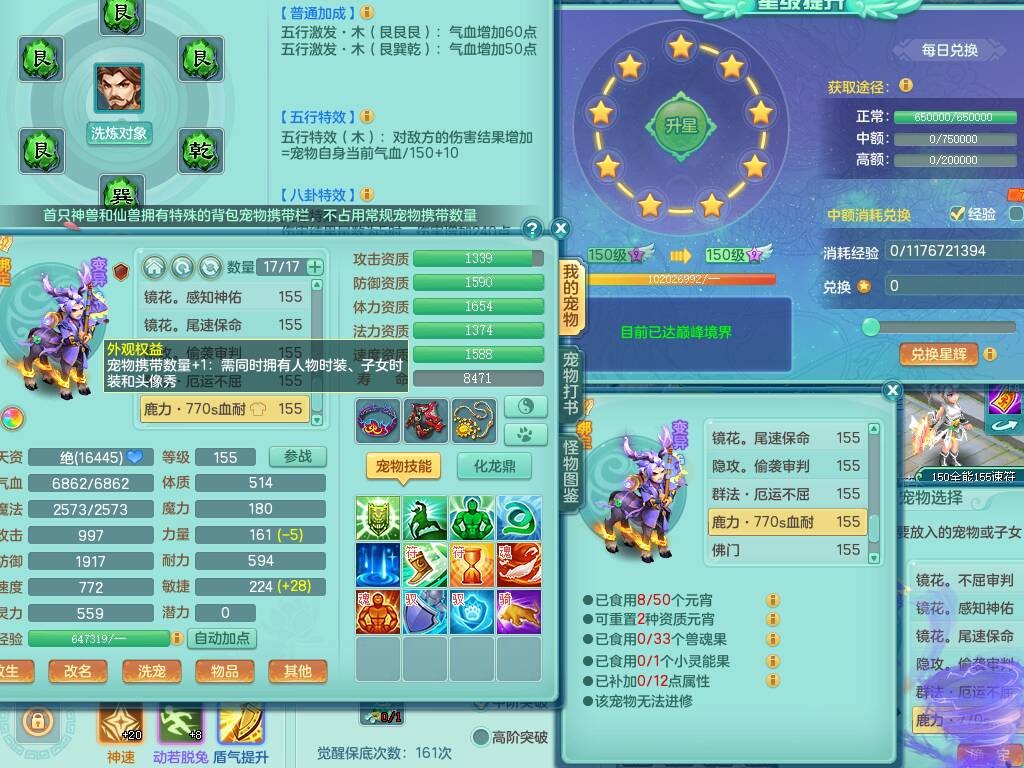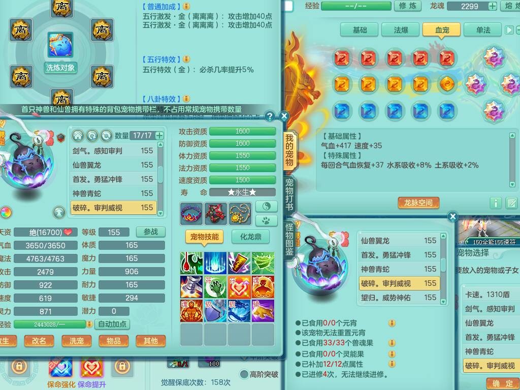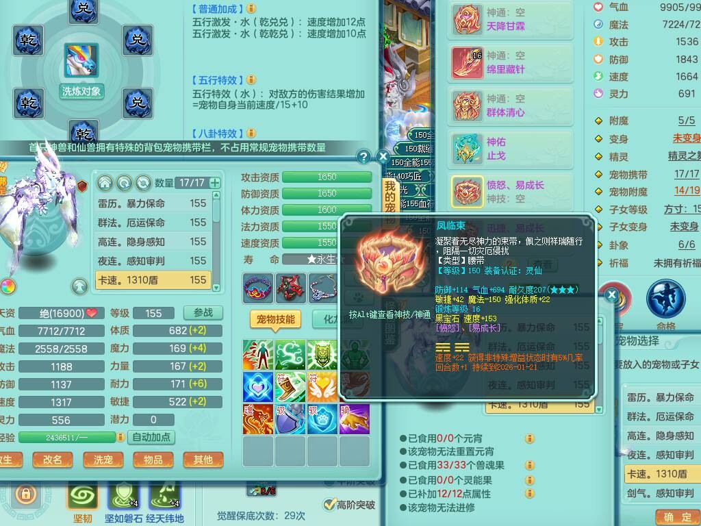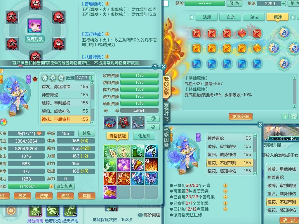 qq8925 七窍玲珑159男方寸,精灵舞,7龙(1龙无内),3内胆神,5只觉醒(潜龙条件符石满足,化龙鼎差1个厚土龙纹,宠物5只满足),3只6技能镜花灵,4位靓号,1只6技能龙姬,愤怒易单加腰带,迅捷易鞋子,有个934崩山裂地单加56武器,5.5基础鼎+70攻,14个格子,7个纯六字,1个5字,20只满果子,4只坐骑,背包带2个天马之心,永久称谓,月卡还有50天 2980邮箱