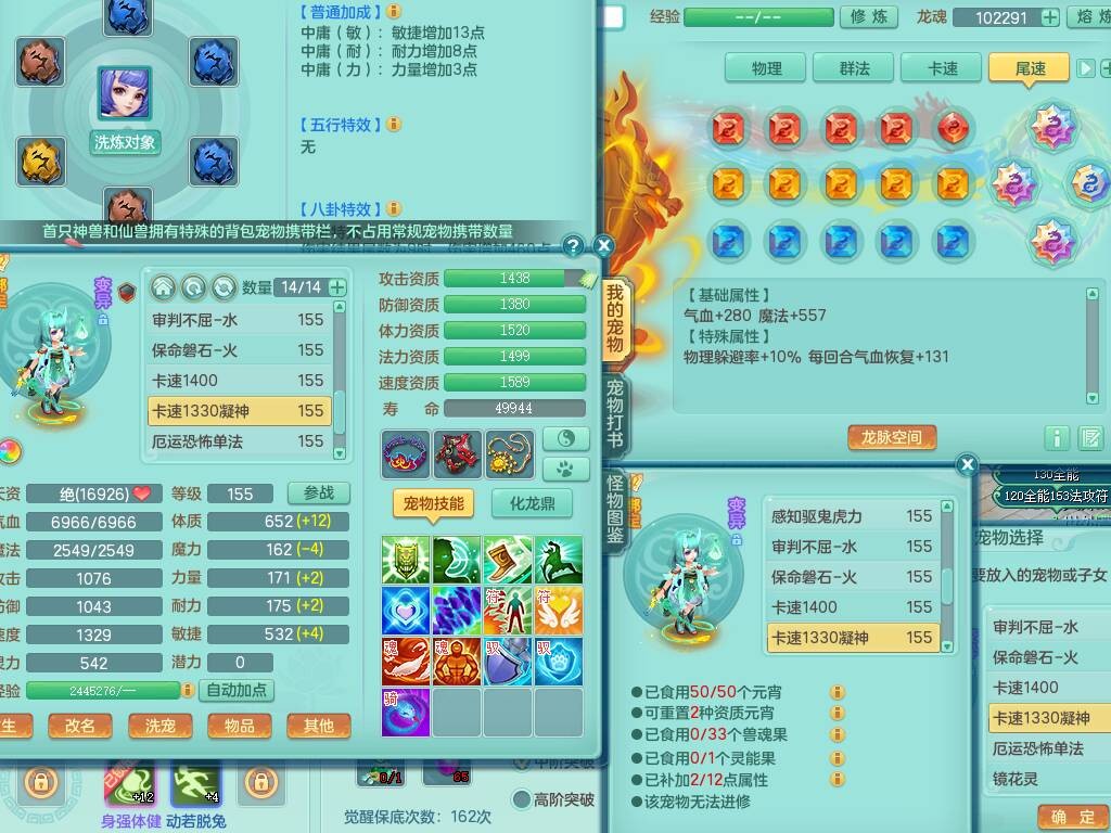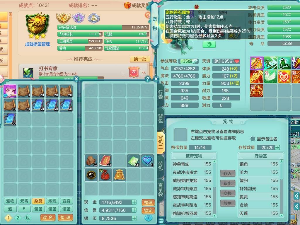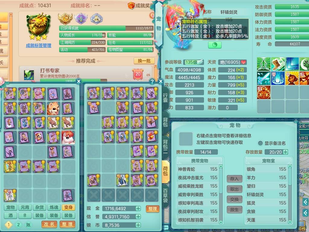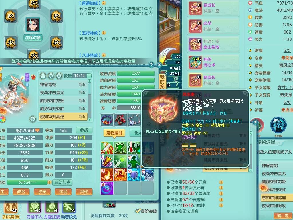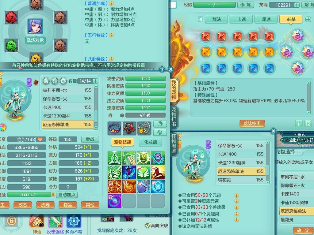 fc8971 风驰电掣159男万兽,精灵歌,1内胆神,1破镜,【8只觉醒,已潜龙】,2宠皮,3特殊(羽袭,藕断,禁锢),3只6技能镜花灵,1只6技能龙姬,918必杀单加武器,崩山单加衣服,神佑清心术单加链子,破甲鞋子,5.5基础鼎+70攻,280血,物理躲避10%,7个纯六字,综合16只满果子,双人坐骑,月卡还有91天。2980邮箱