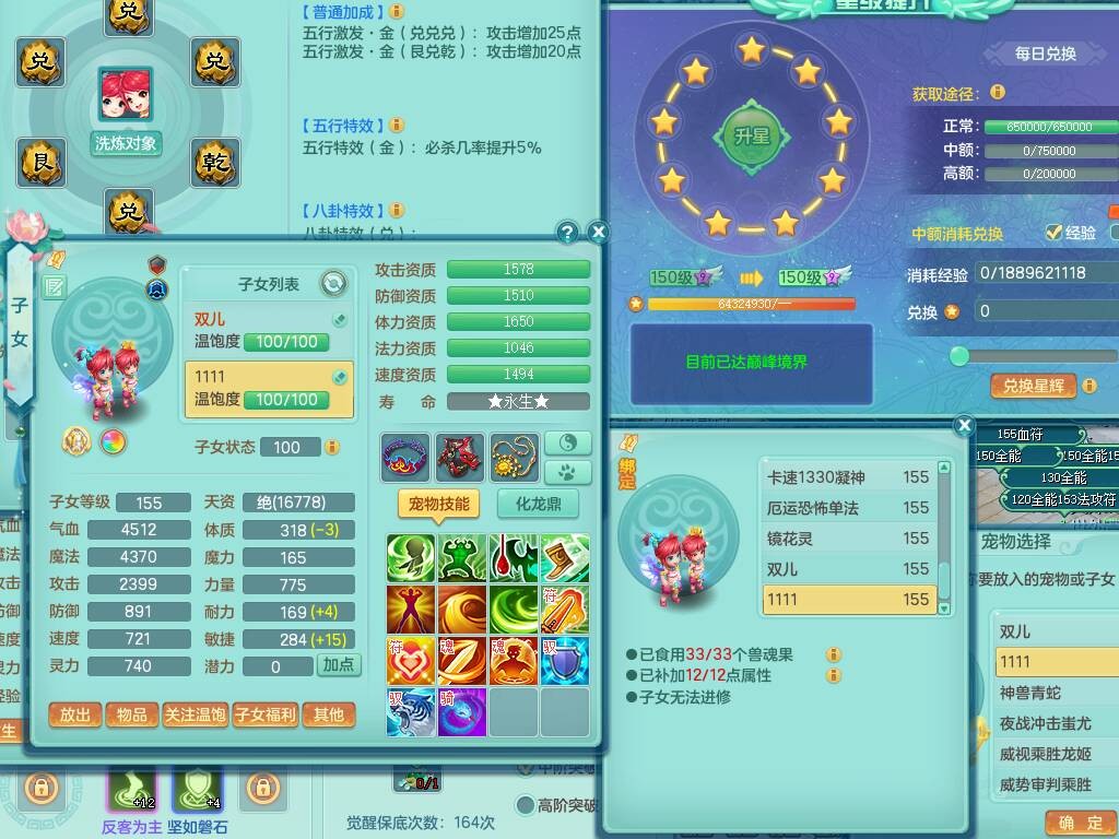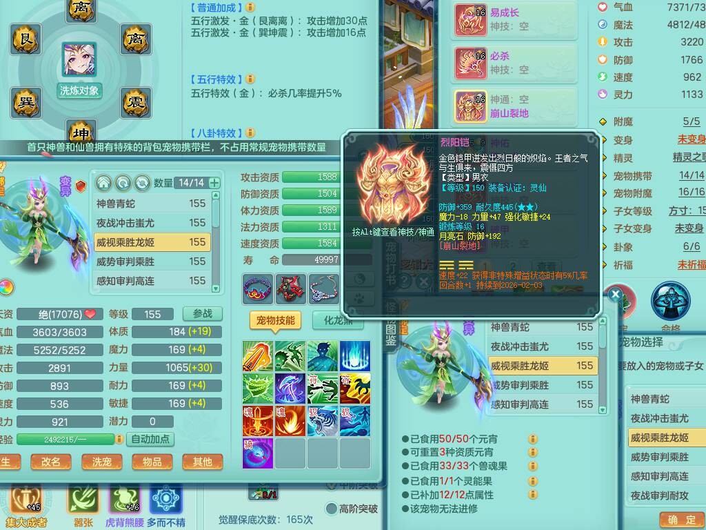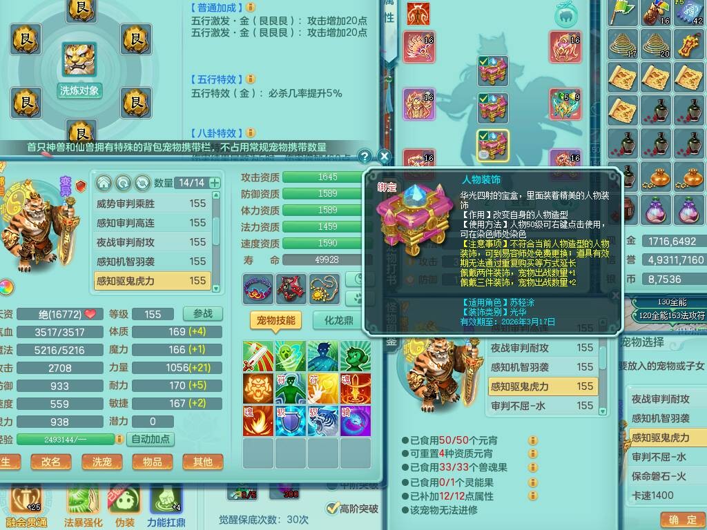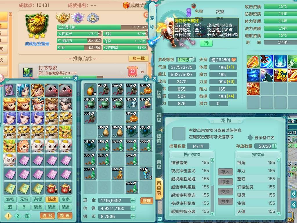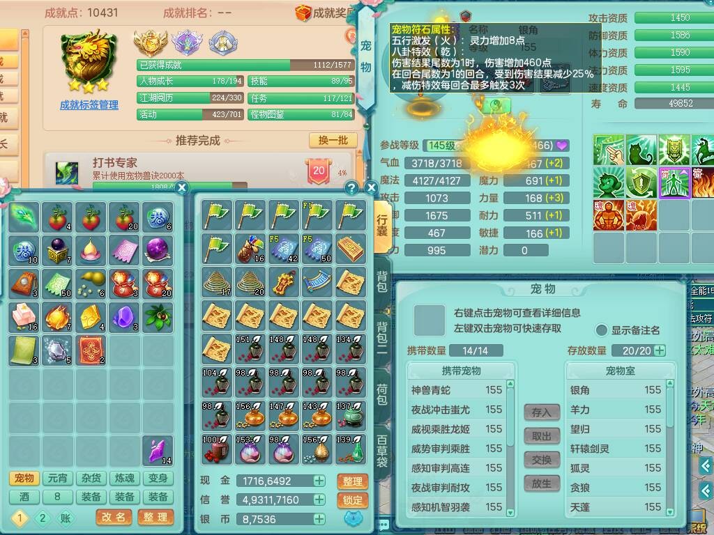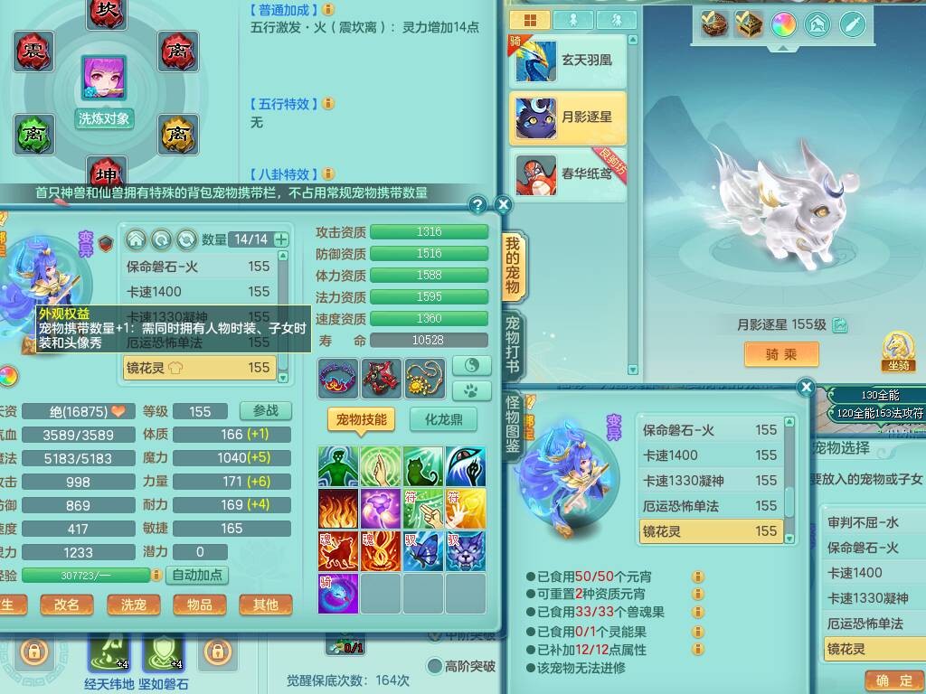 fc8971 风驰电掣159男万兽,精灵歌,1内胆神,1破镜,【8只觉醒,已潜龙】,2宠皮,3特殊(羽袭,藕断,禁锢),3只6技能镜花灵,1只6技能龙姬,918必杀单加武器,崩山单加衣服,神佑清心术单加链子,破甲鞋子,5.5基础鼎+70攻,280血,物理躲避10%,7个纯六字,综合16只满果子,双人坐骑,月卡还有91天。2980邮箱