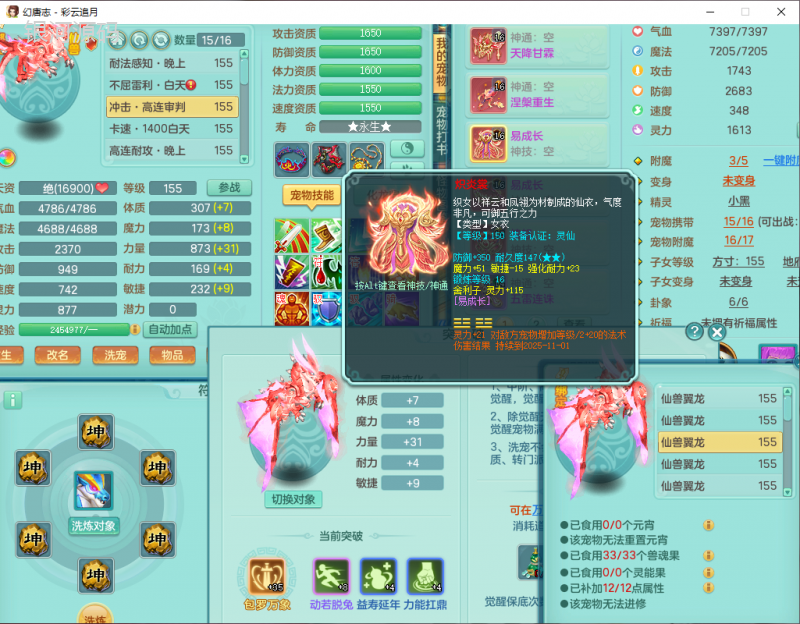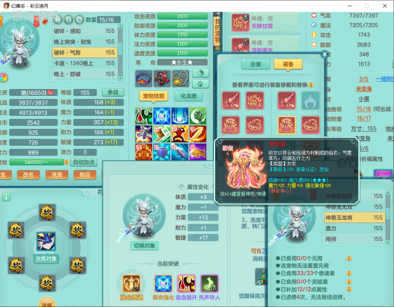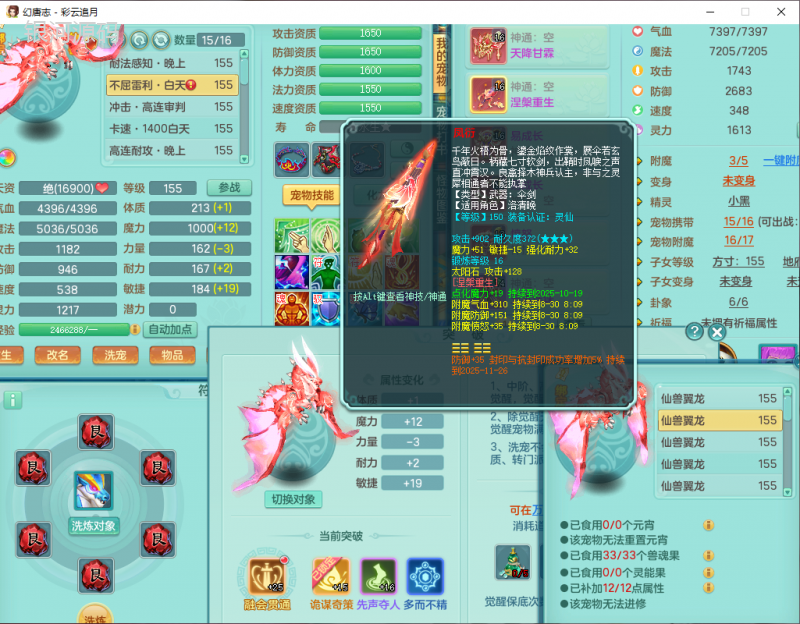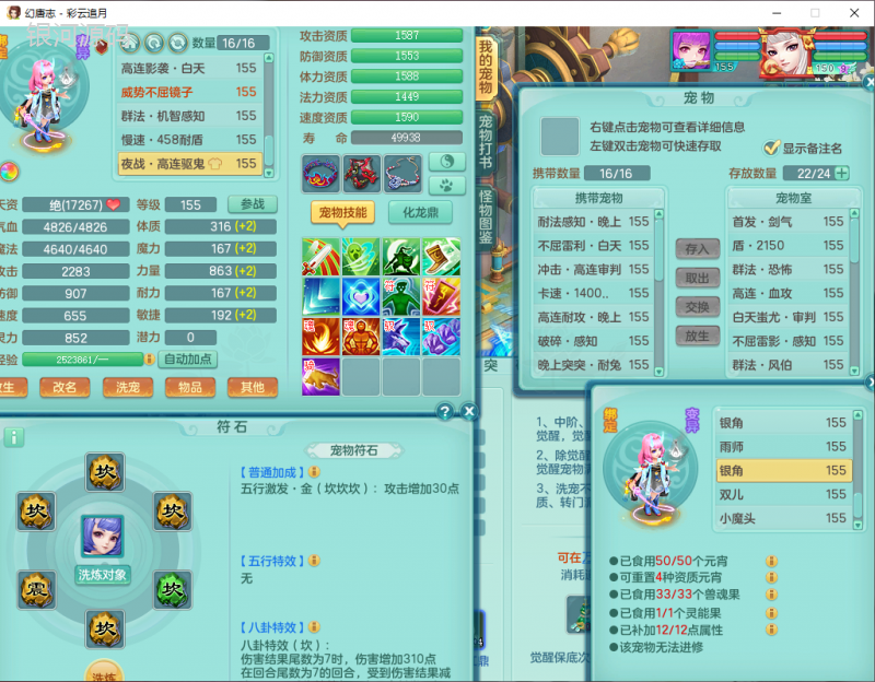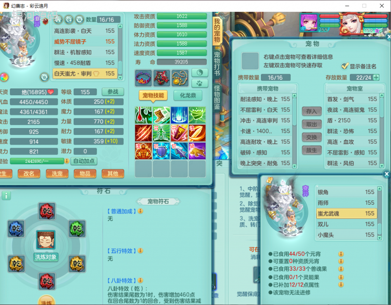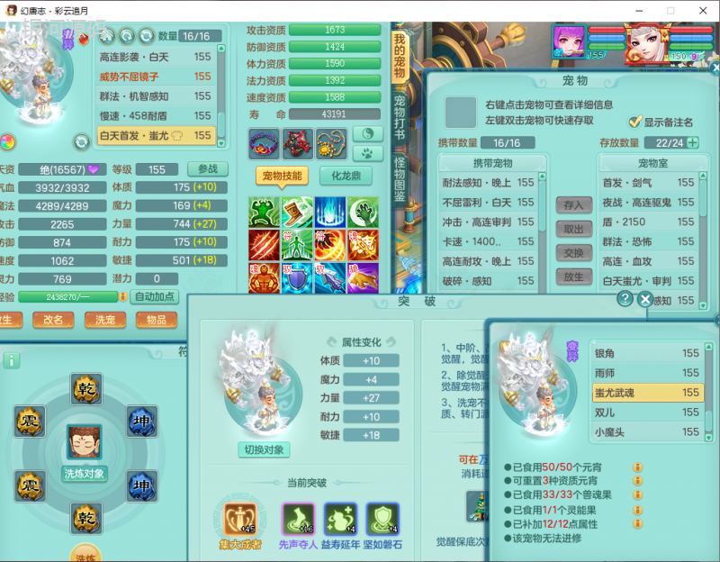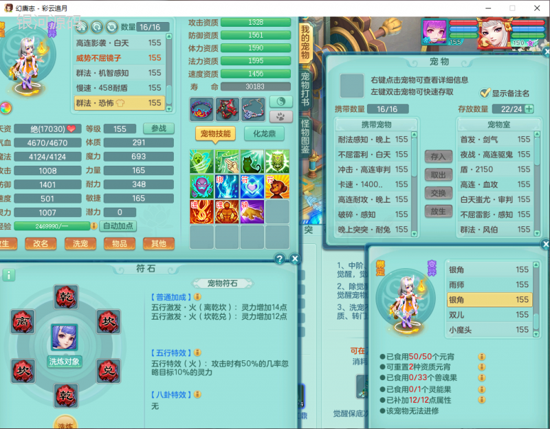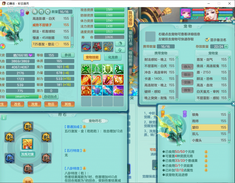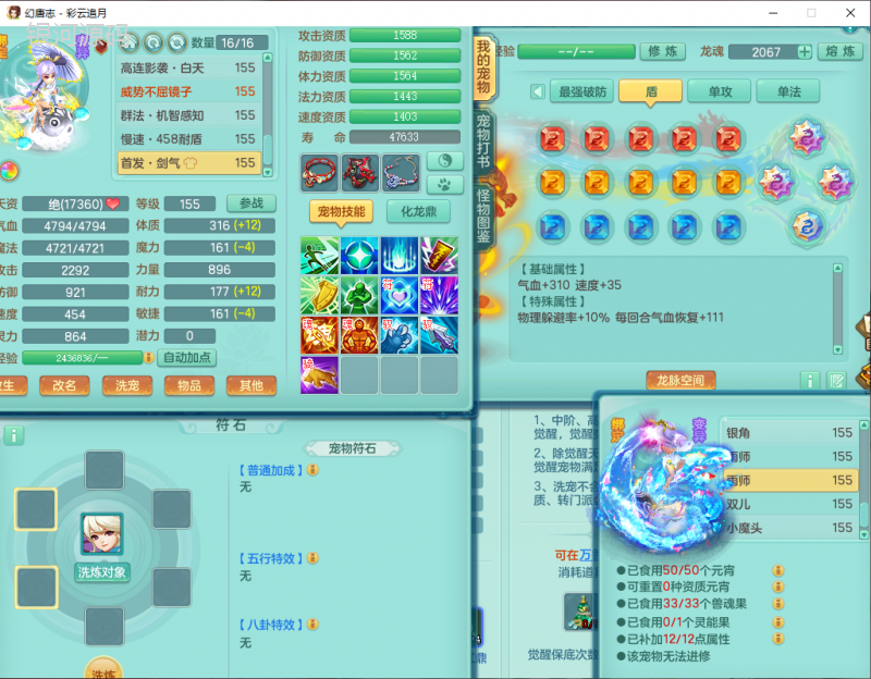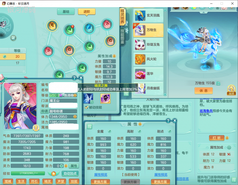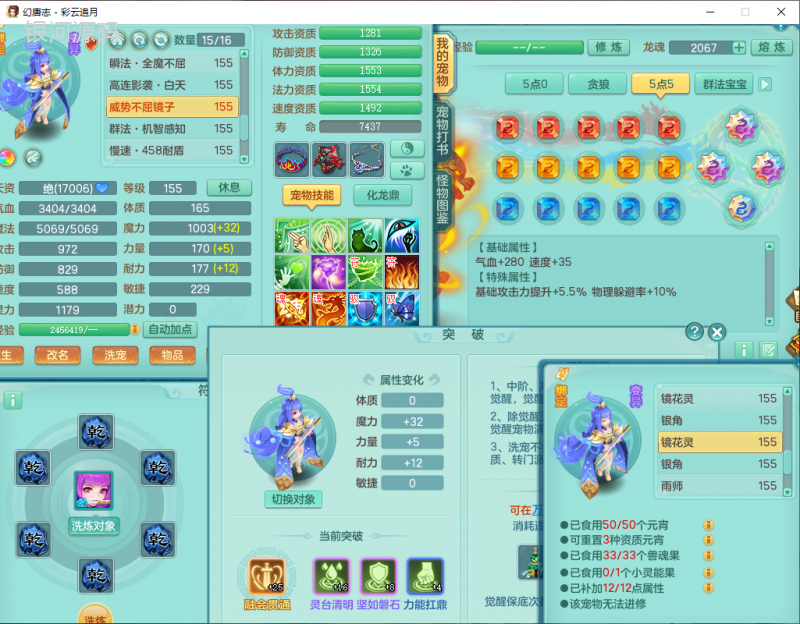 cy9040 【潜龙在渊】 彩云追月159女魔王【潜龙号】精灵舞,4位靓号,5龙(换)4内7特殊(怒破、影袭,祈雨、风卷、剑胆、月光、以战兽决)3六技能镜花(1胚子),9觉醒5宠皮,7六字1五字13四字24只满果子,16格子,全单加装备,269Y项链,五雷鞋子,有物理装,坚毅群体迟滞项链,破甲鞋子,鼎5.5+70+280,3套符石,2传说1精良法宝,40天月卡,庭院152房屋183,永久外观饰物、精灵皮肤, 3双人坐骑(1飞行),带3个150奶粉 2980邮箱