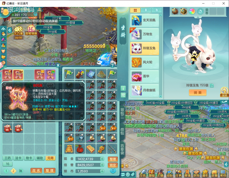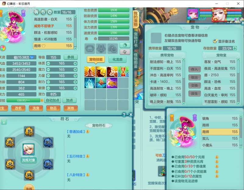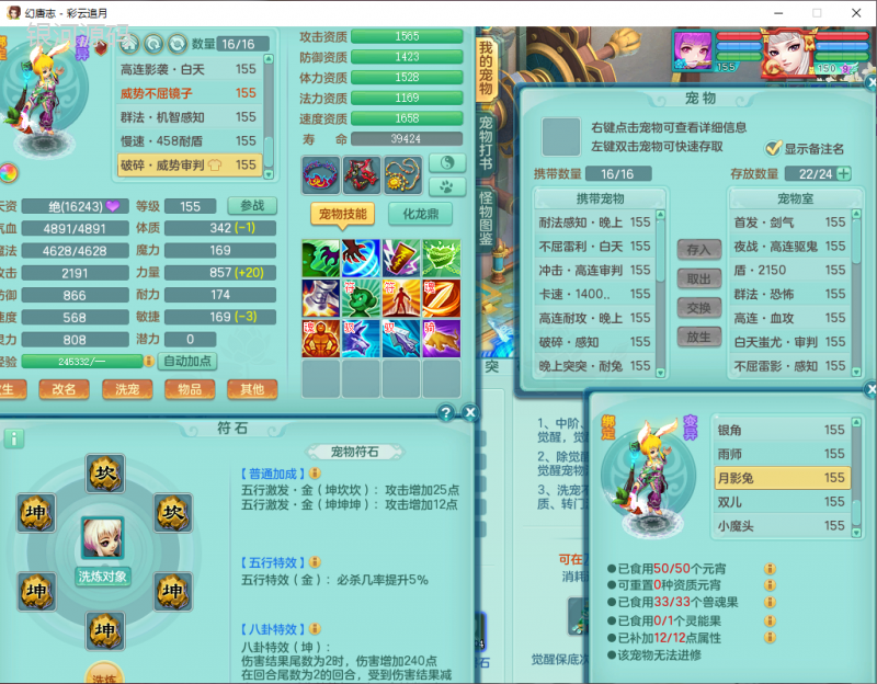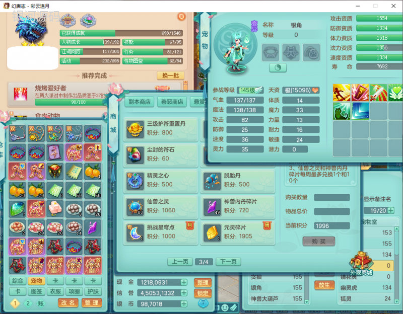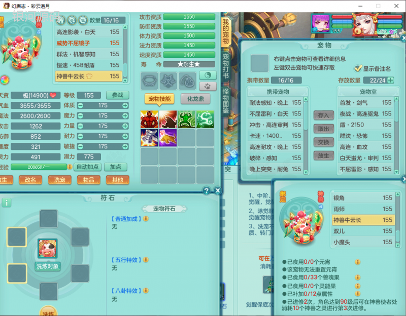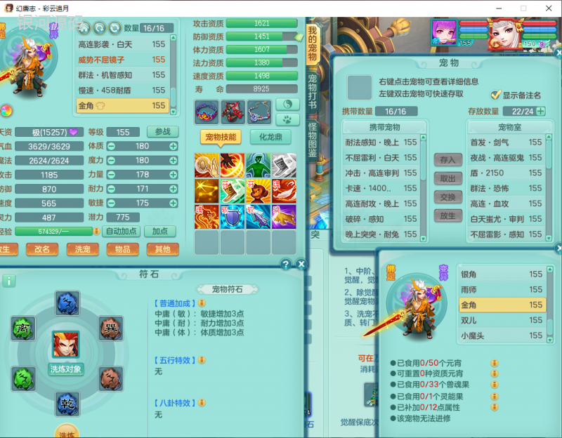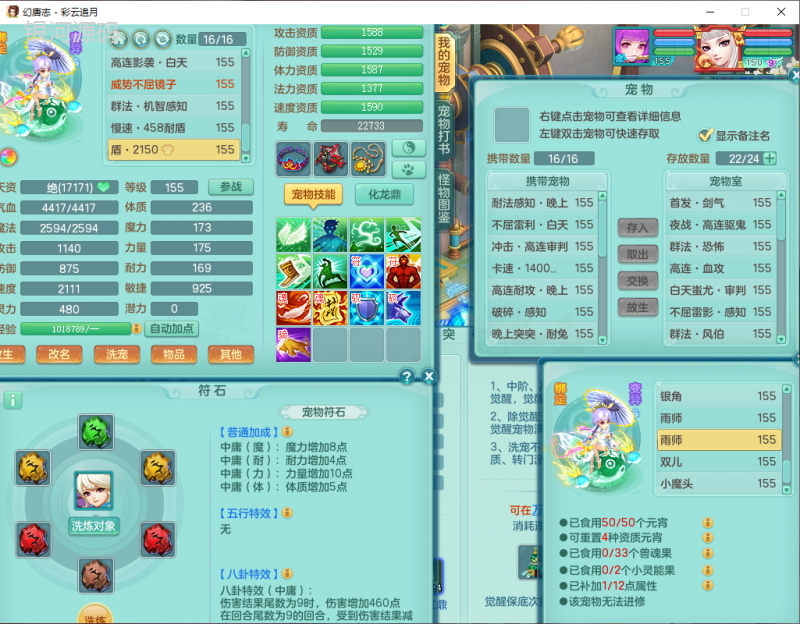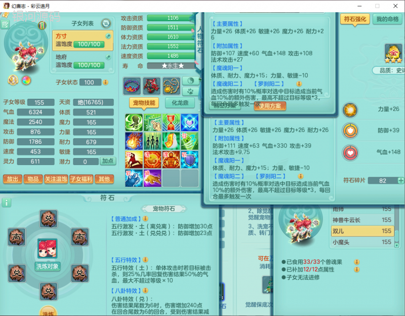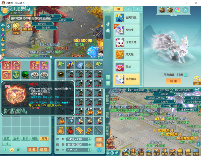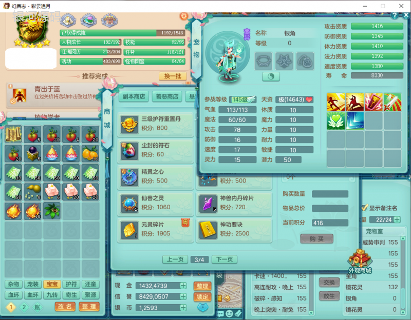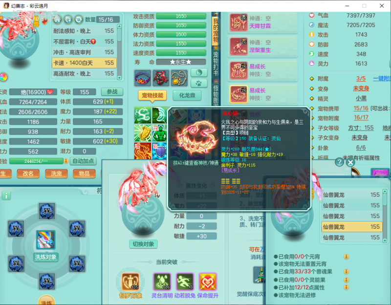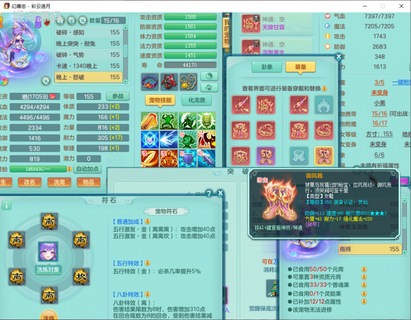 cy9040 【潜龙在渊】 彩云追月159女魔王【潜龙号】精灵舞,4位靓号,5龙(换)4内7特殊(怒破、影袭,祈雨、风卷、剑胆、月光、以战兽决)3六技能镜花(1胚子),9觉醒5宠皮,7六字1五字13四字24只满果子,16格子,全单加装备,269Y项链,五雷鞋子,有物理装,坚毅群体迟滞项链,破甲鞋子,鼎5.5+70+280,3套符石,2传说1精良法宝,40天月卡,庭院152房屋183,永久外观饰物、精灵皮肤, 3双人坐骑(1飞行),带3个150奶粉 2980邮箱