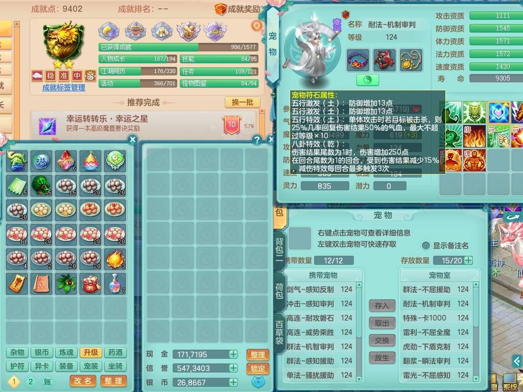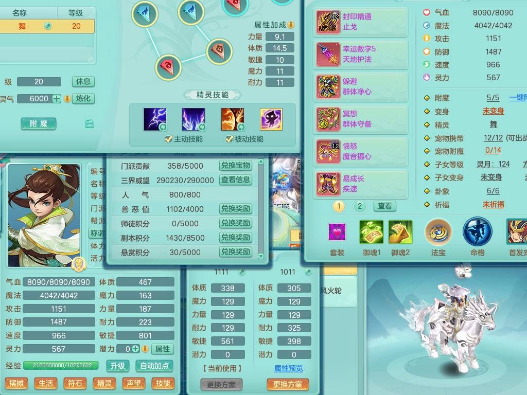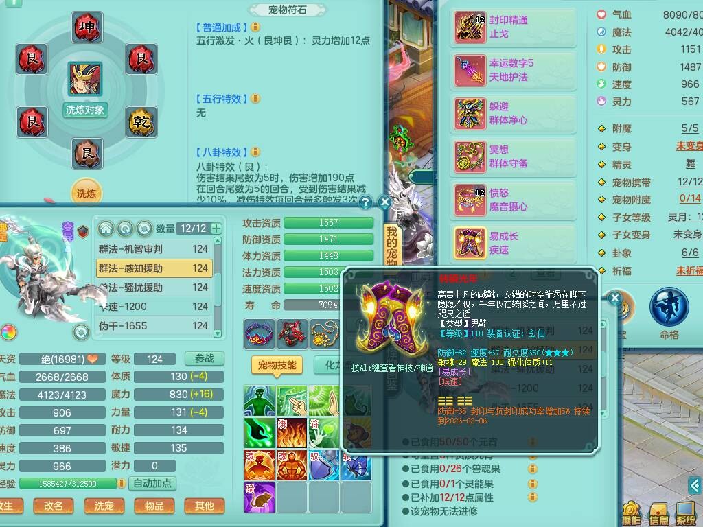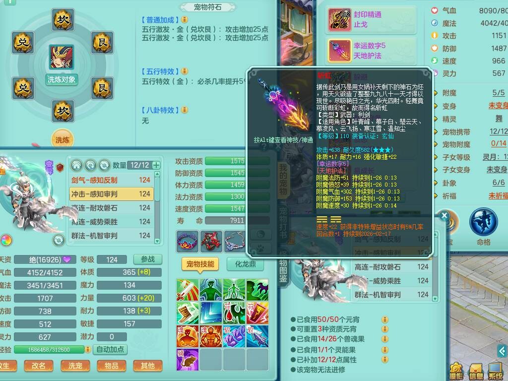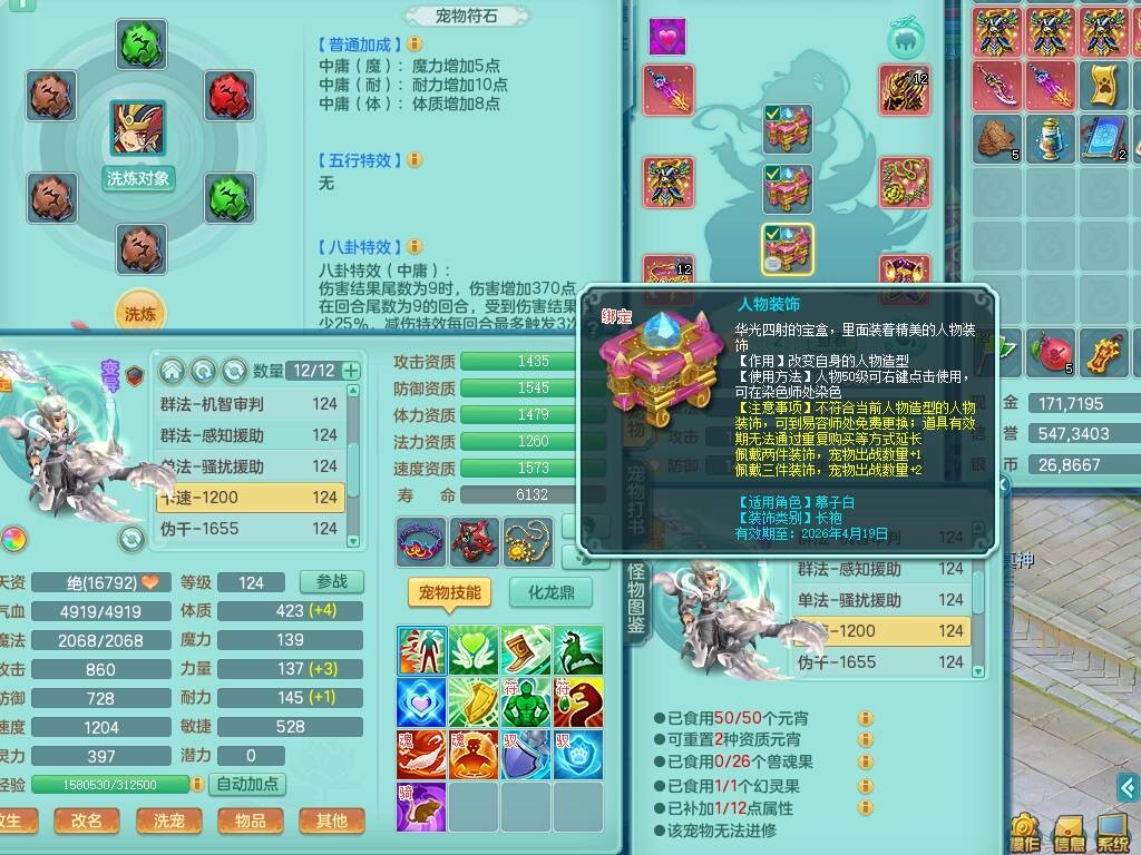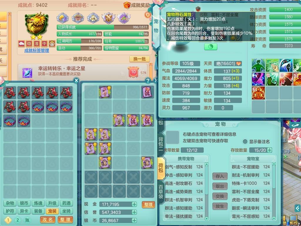 p20719少年游119男方寸,精灵舞,1神兽+背包39神兽内丹碎片,带22仙兽灵,13纯白宠皮,星辰之拥,封印精通止戈单加头,愤怒6特,双红迅捷单加鞋子,3.5基础鼎,5只满果子,宠排在榜,双人坐骑,月卡还有191天。