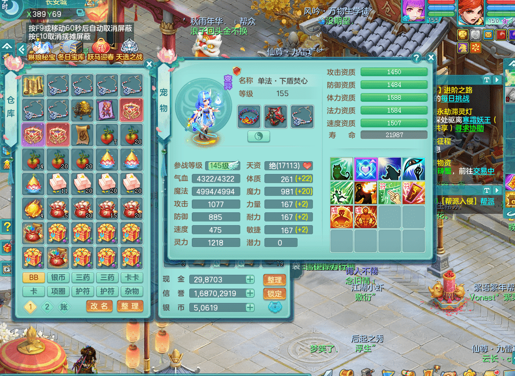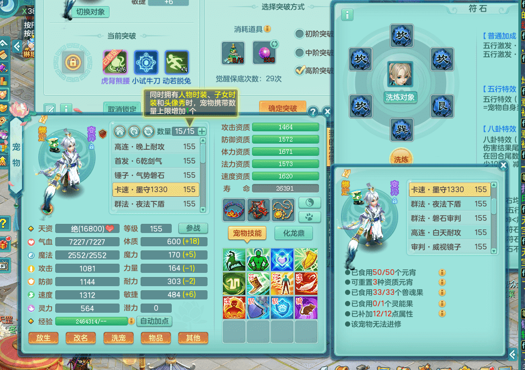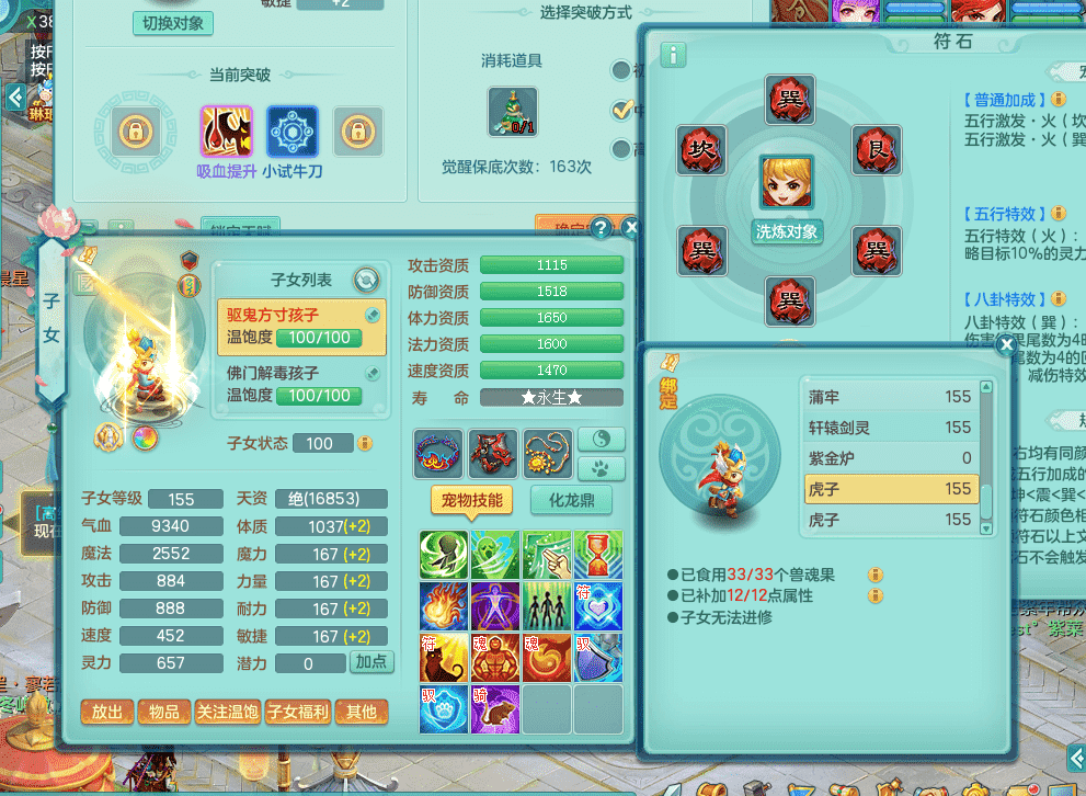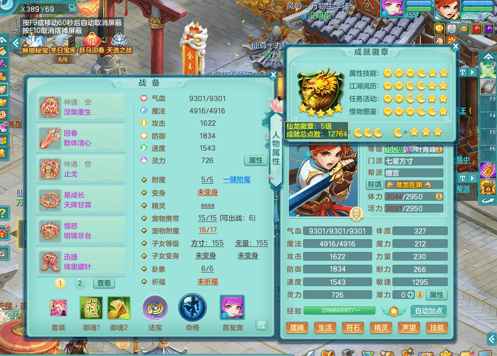 fh9312风华绝代【潜龙在渊】159男方寸精灵舞,2龙1内胆神,【8只觉醒,已潜龙】,1宠皮,2特殊(焚心,登云),1只六技能龙姬,4只六技能镜花灵,10红愤怒回春迅捷六特,5.5基础鼎+70攻+280血,13个格子,马上 14 格子, 7个纯六字,2个五字,21只满果子,仓库还有 95 个果子,宠排在榜,经验修炼成就在榜,3个坐骑,暴龙洪荒,带170 天月卡。➕159女万兽,精灵歌,2只六技能镜花灵,2特殊(雷光,枪出),928易成长单加55武器,崩山单加56衣服,易成长罗汉单加53腰带,5.0基础鼎+70攻+280血。➕159男无量,精灵歌,1只觉醒,3只六技能镜花灵,1特殊(噬风),4.5基础鼎。➕159女五庄,精灵舞,1只觉醒,2只六技能镜花灵,愤怒玉清单加腰带,4.5基础鼎。