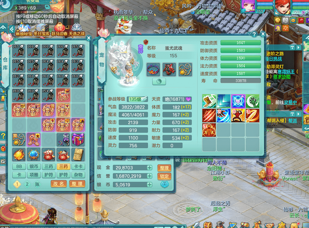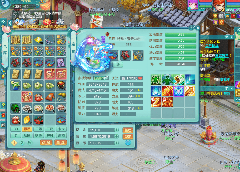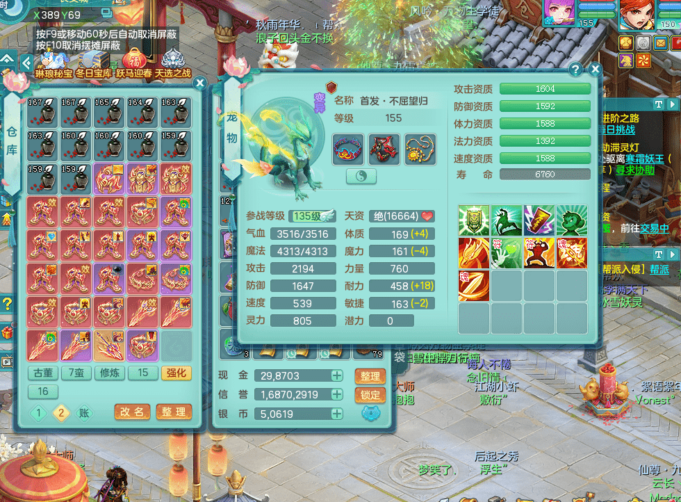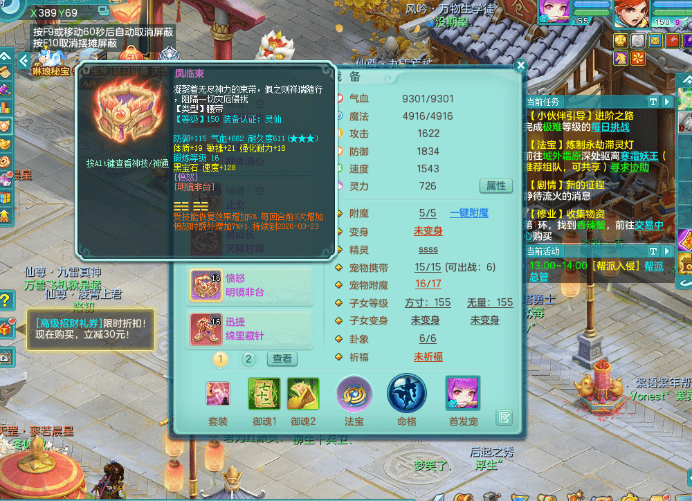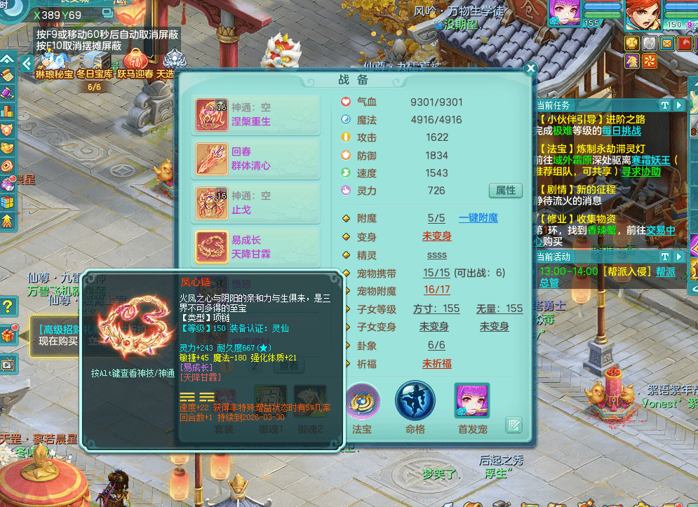 fh9312风华绝代【潜龙在渊】159男方寸精灵舞,2龙1内胆神,【8只觉醒,已潜龙】,1宠皮,2特殊(焚心,登云),1只六技能龙姬,4只六技能镜花灵,10红愤怒回春迅捷六特,5.5基础鼎+70攻+280血,13个格子,马上 14 格子, 7个纯六字,2个五字,21只满果子,仓库还有 95 个果子,宠排在榜,经验修炼成就在榜,3个坐骑,暴龙洪荒,带170 天月卡。➕159女万兽,精灵歌,2只六技能镜花灵,2特殊(雷光,枪出),928易成长单加55武器,崩山单加56衣服,易成长罗汉单加53腰带,5.0基础鼎+70攻+280血。➕159男无量,精灵歌,1只觉醒,3只六技能镜花灵,1特殊(噬风),4.5基础鼎。➕159女五庄,精灵舞,1只觉醒,2只六技能镜花灵,愤怒玉清单加腰带,4.5基础鼎。