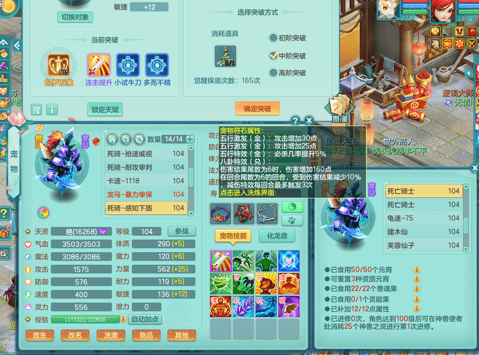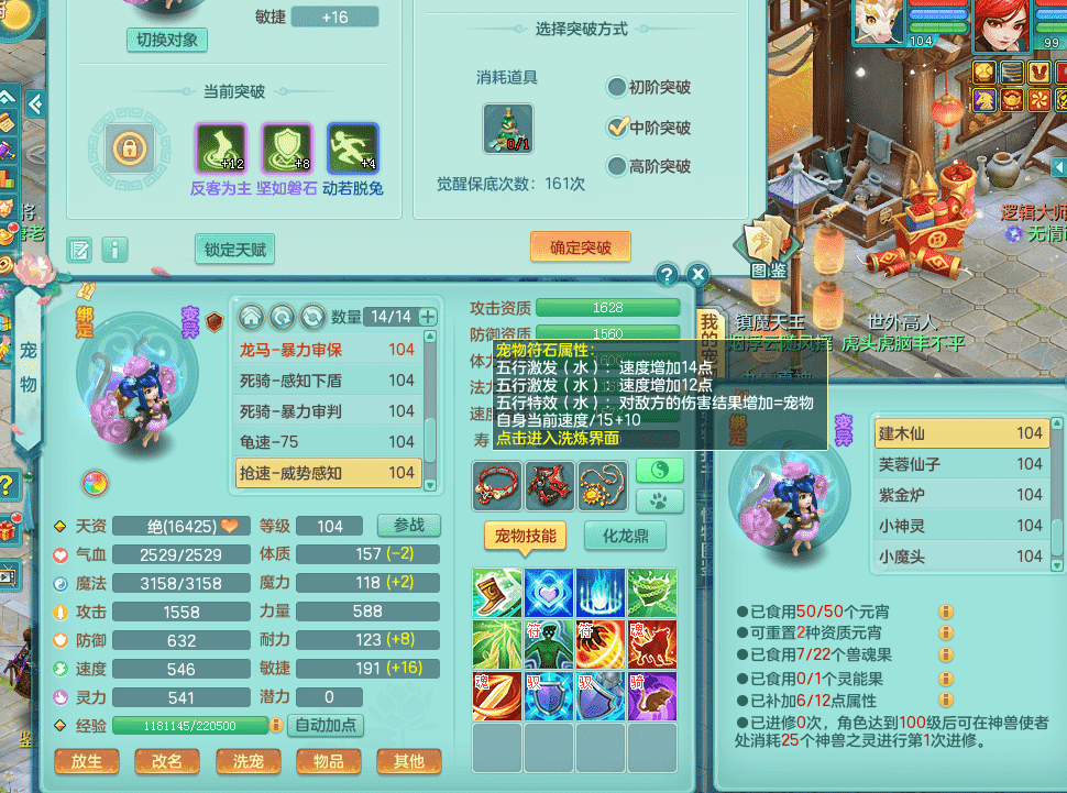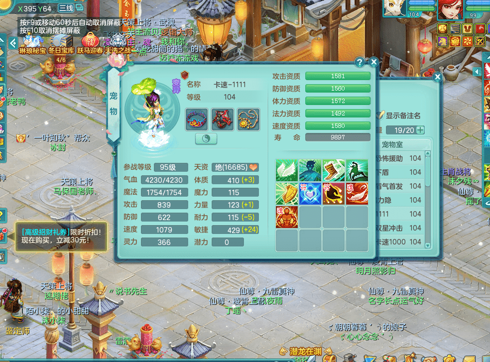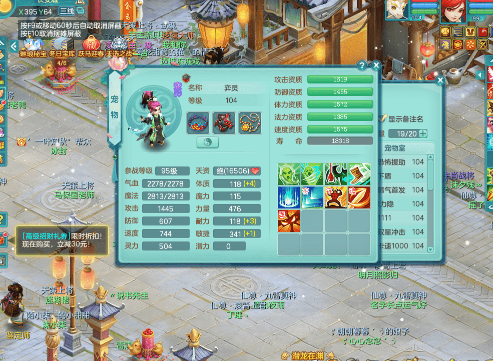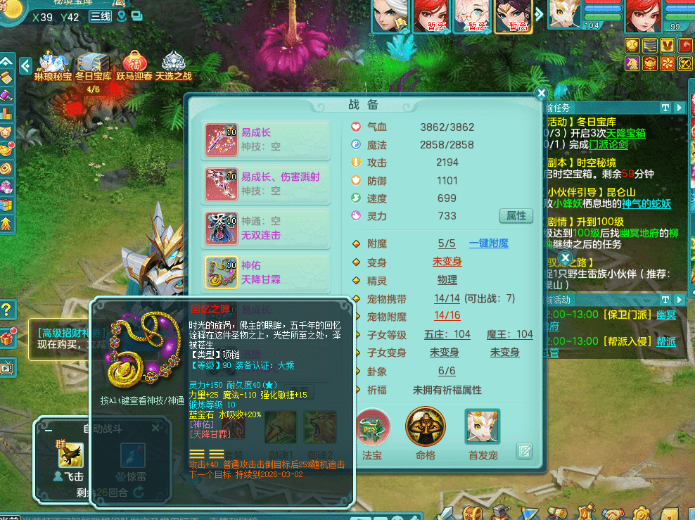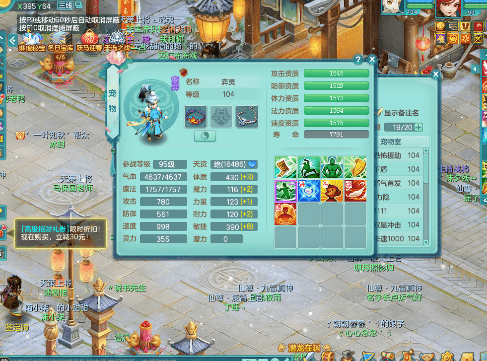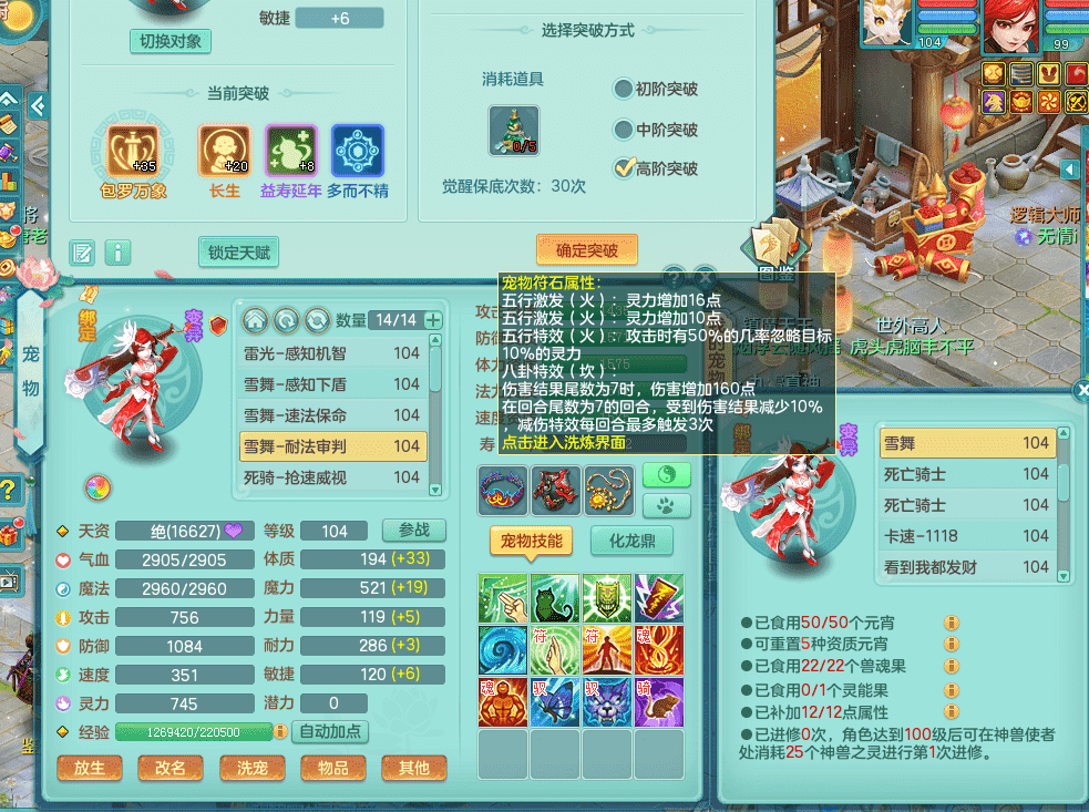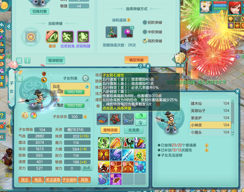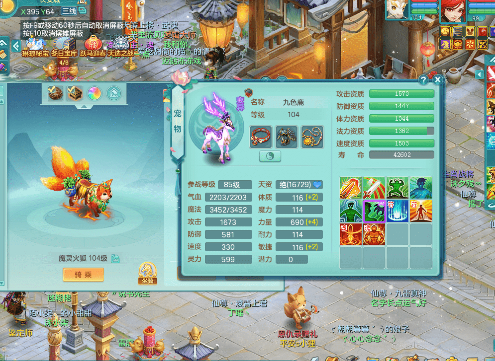tx9326天下无双 99女万兽,双飞坐骑,2.5基础+42攻击化龙鼎 天上人间庭院,1龙无内,1内神(龙马),8觉醒5真6字13+满果子,三精灵(物,法,辅)有配套装备 可玩三系