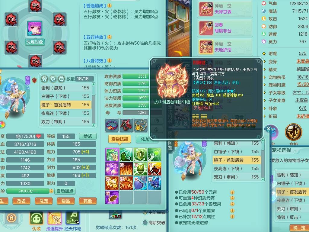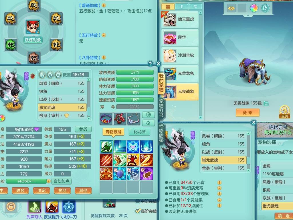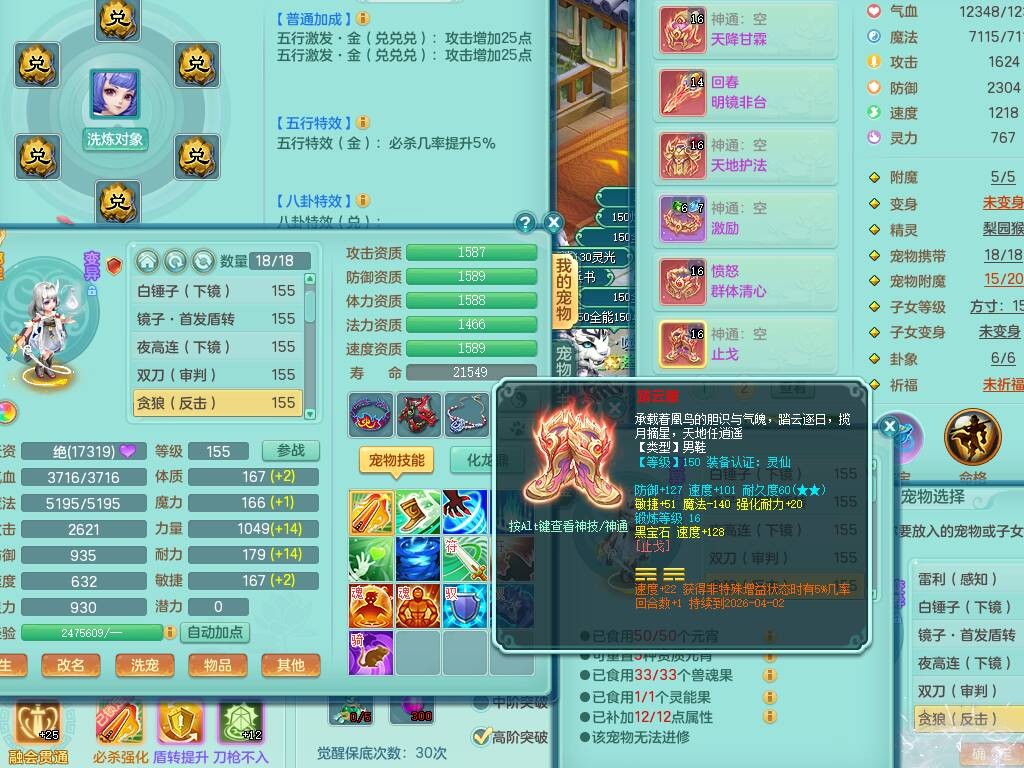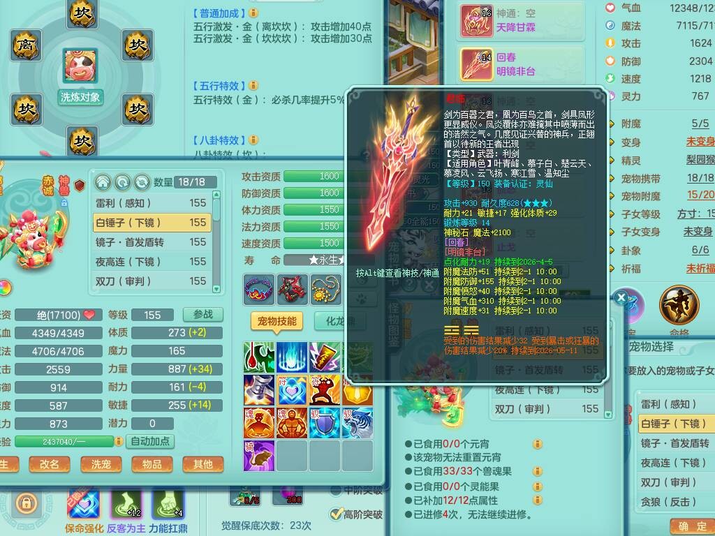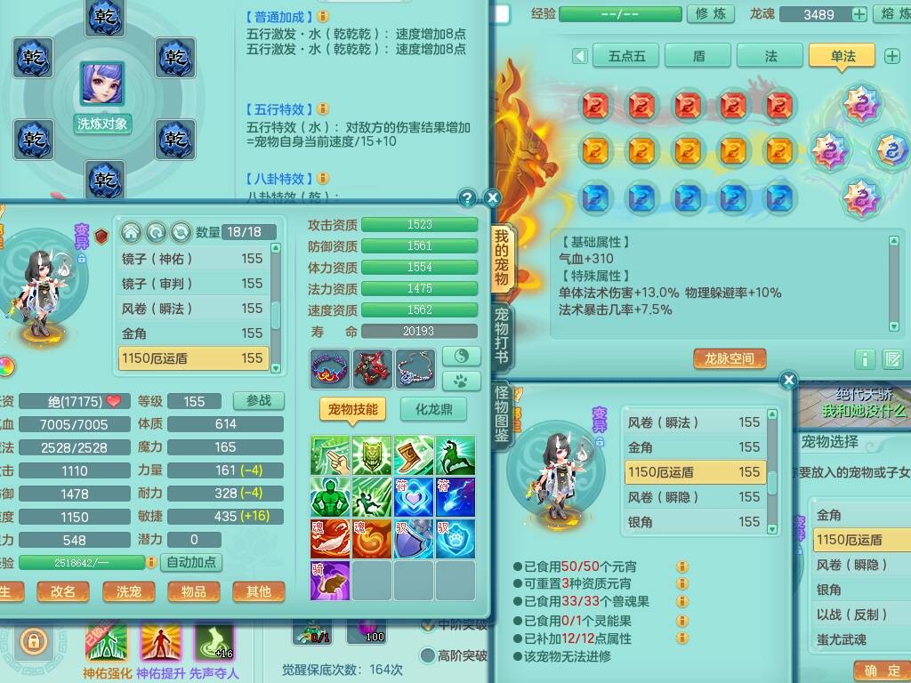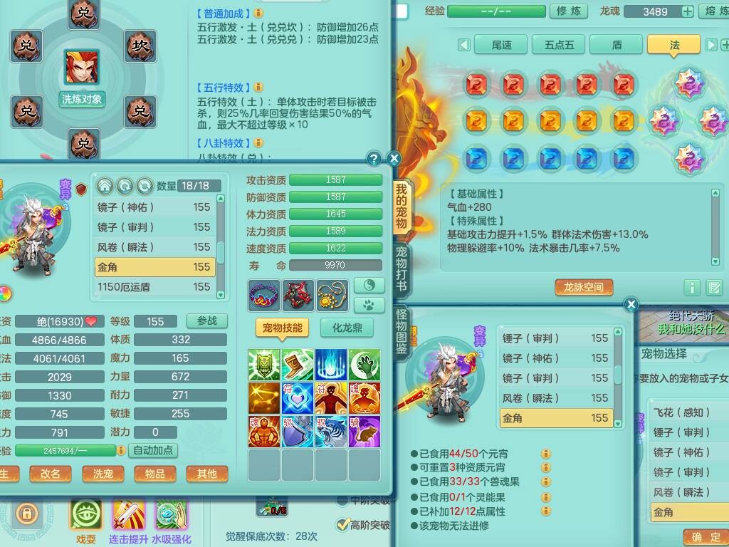fc9370风驰电掣159男无量,精灵舞,1龙1内胆神,2破镜,【9只觉醒,已潜龙】,1宠皮,3只六技能镜花灵,1只6技能龙姬,8特殊(青霜,锤子,舍身,噬风,飞花,以战,号角,守护),回春愤怒6特,5.5基础鼎+70攻、280血,物理躲避10%,15个格子,13个纯六字,4个五字,23只满果子,宠排在榜,经验修炼在榜,黑白老虎,月卡还有34天