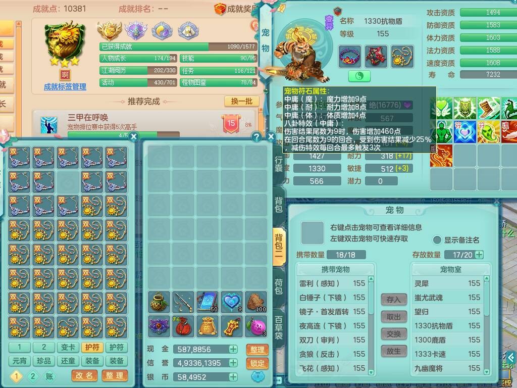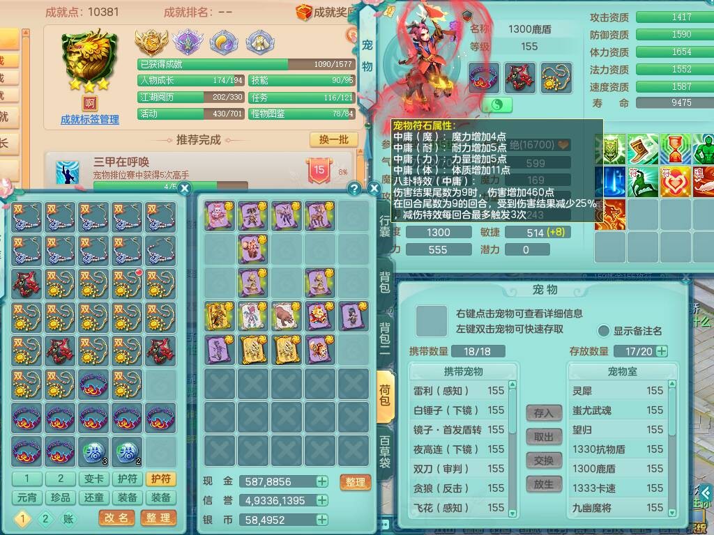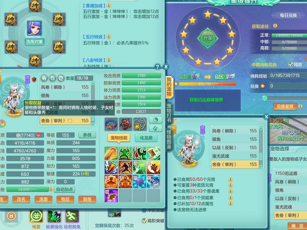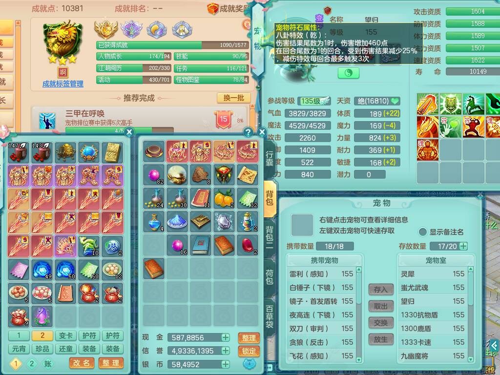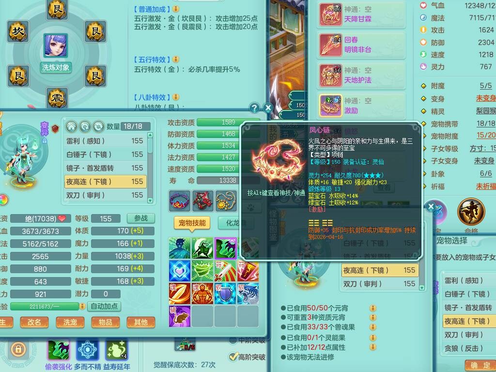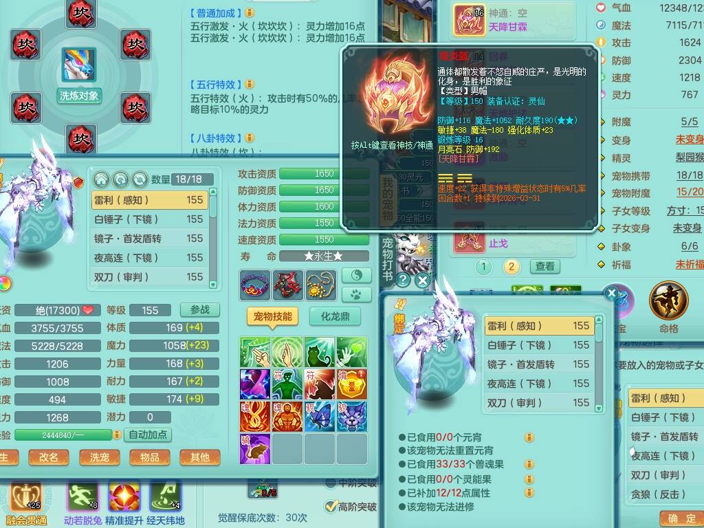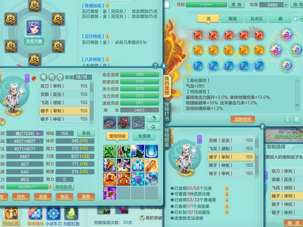 fc9370风驰电掣159男无量,精灵舞,1龙1内胆神,2破镜,【9只觉醒,已潜龙】,1宠皮,3只六技能镜花灵,1只6技能龙姬,8特殊(青霜,锤子,舍身,噬风,飞花,以战,号角,守护),回春愤怒6特,5.5基础鼎+70攻、280血,物理躲避10%,15个格子,13个纯六字,4个五字,23只满果子,宠排在榜,经验修炼在榜,黑白老虎,月卡还有34天