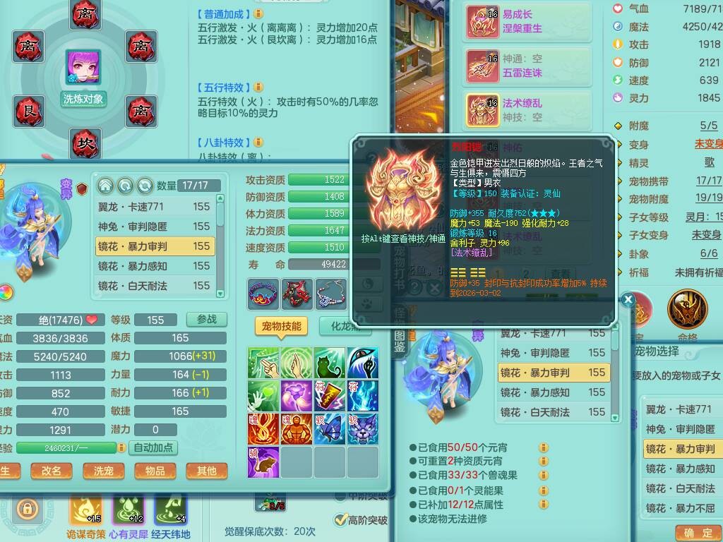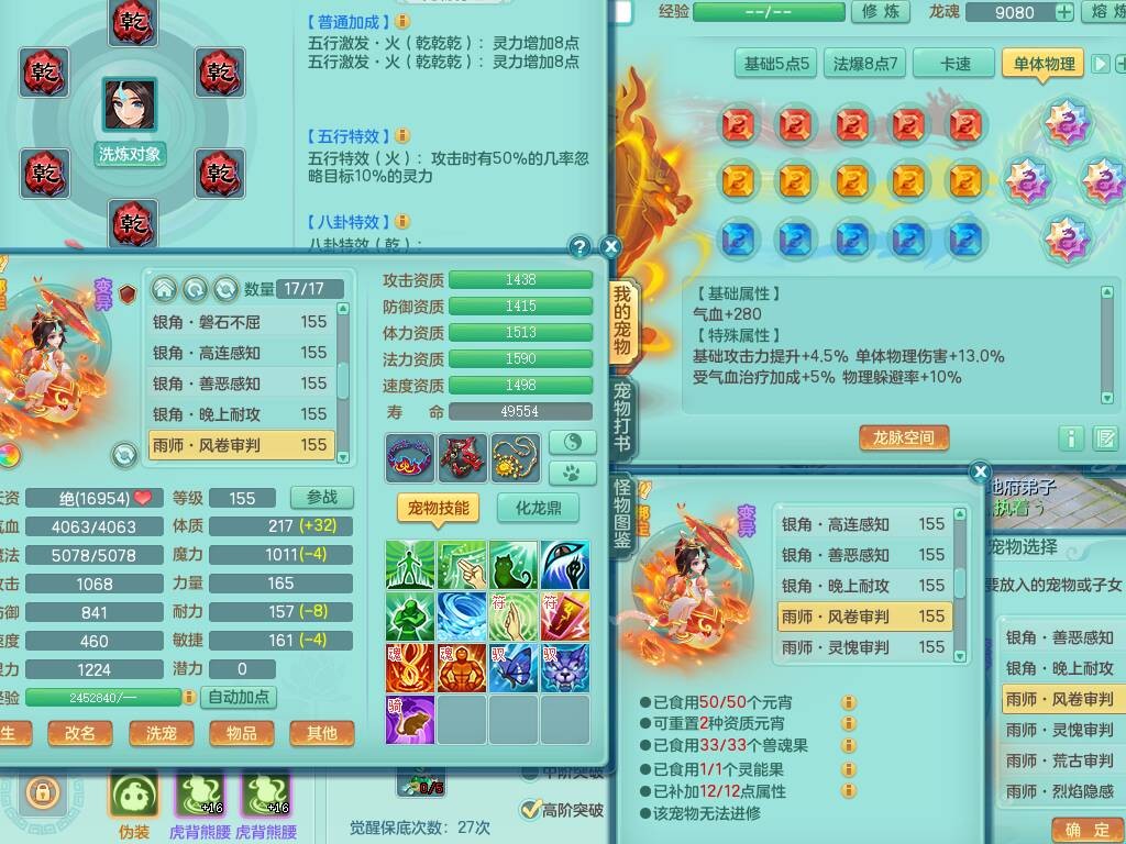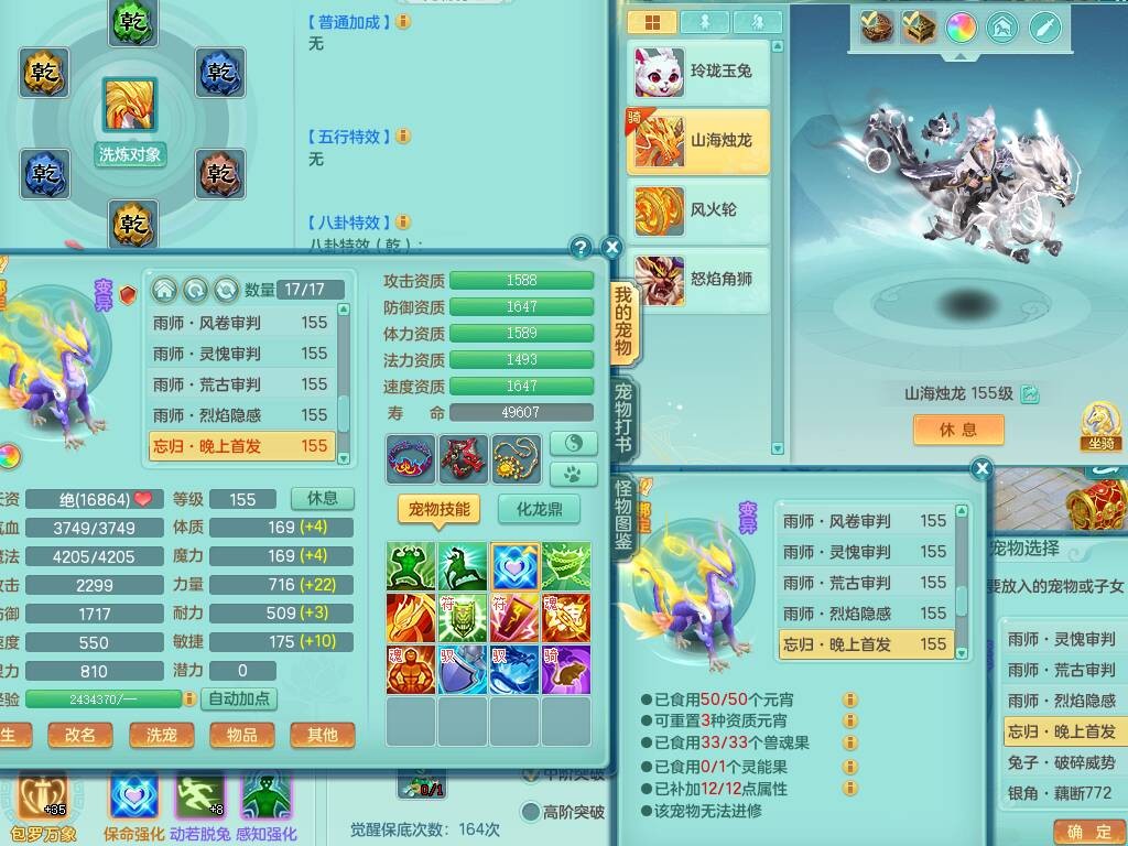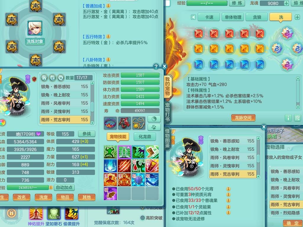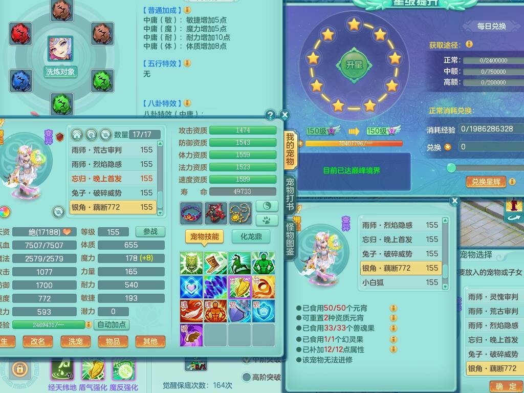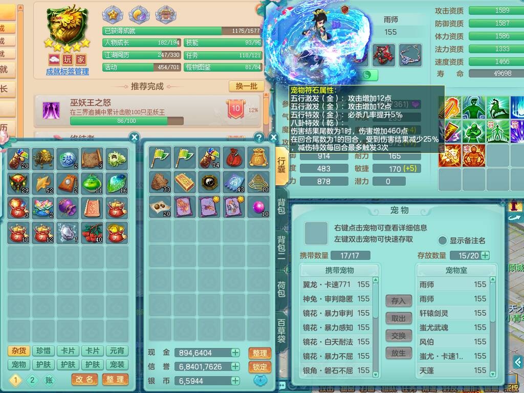 rj9382任剑逍遥159男魔王,精灵歌,1龙无内,1内胆神,6只觉醒(潜龙条件化龙鼎满足,符石差3个主要属性,宠物1只满足),7宠皮,6特殊(风卷,灵傀,荒古,藕断,烈焰,善恶),4只6技能镜花灵,1只6技能龙姬,法缭单加53衣服,272神佑单加54链子,五雷单加武器,愤怒单加53腰带,法缭单加53鞋子,5.5基础鼎+70攻+280血,15个格子,7个纯六字,3个5字,24只满果子,宠排在榜,经验修炼成就在榜,2只坐骑,月卡还有143天!!!