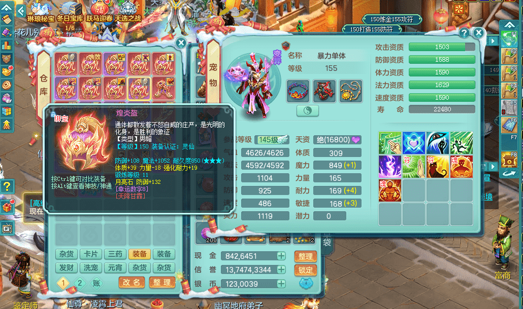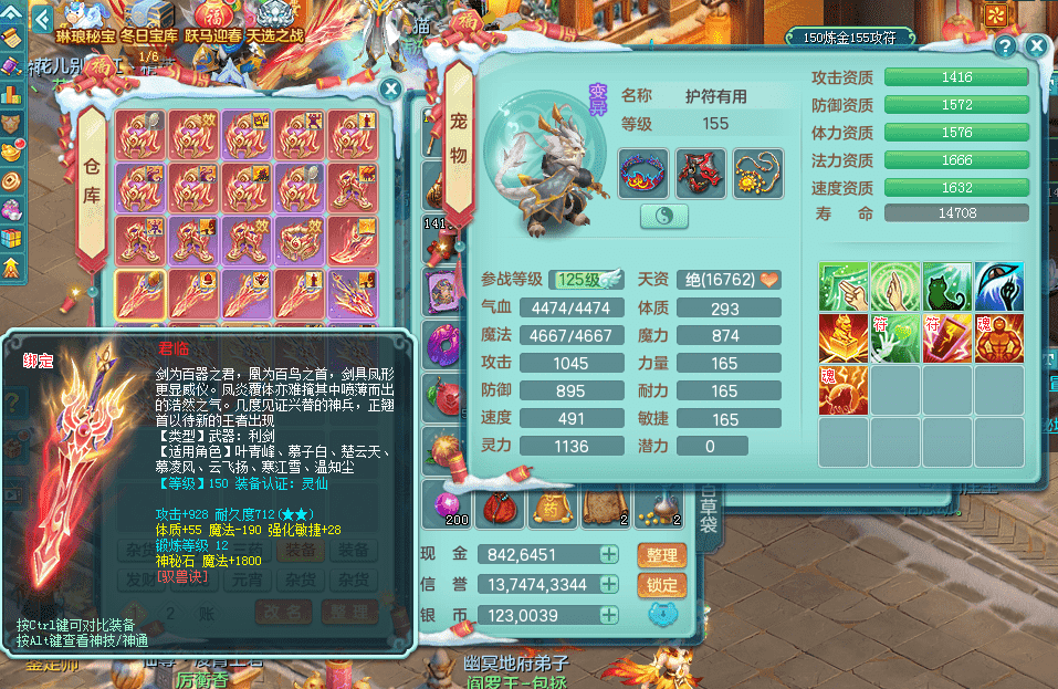 tx9391天下无双159五庄 精灵歌 云麾铁骑双飞葫芦 有双红回春武器可以转辅助 满星穹 5.0化龙鼎 64仙兽灵 1内神蛇 2镜花1龙姬 1金角皮肤 特殊(雷利,影袭,噬风斩,勇猛,夺命) 6觉醒 10左右满果子 2980邮箱