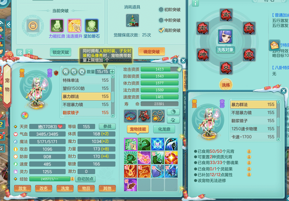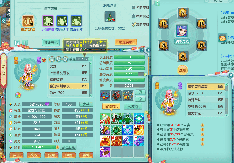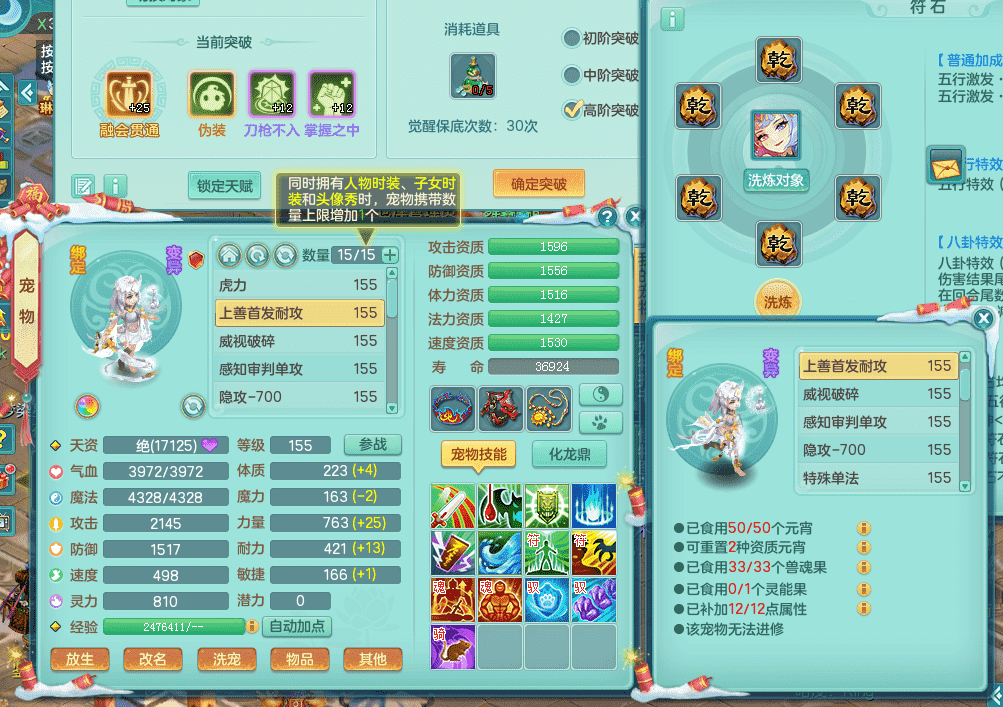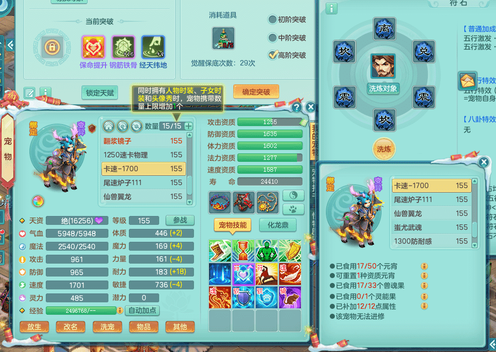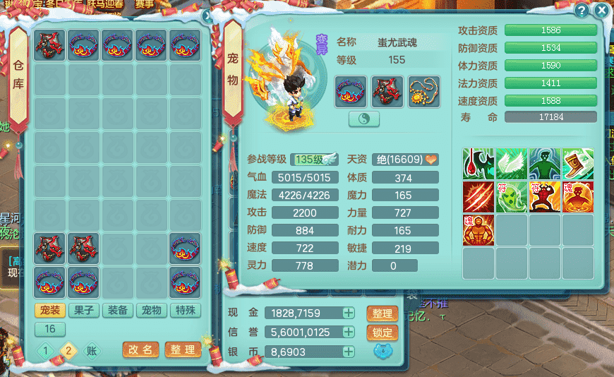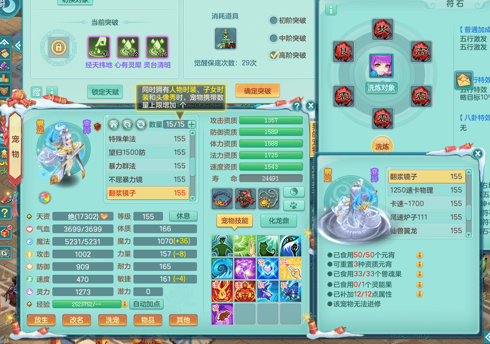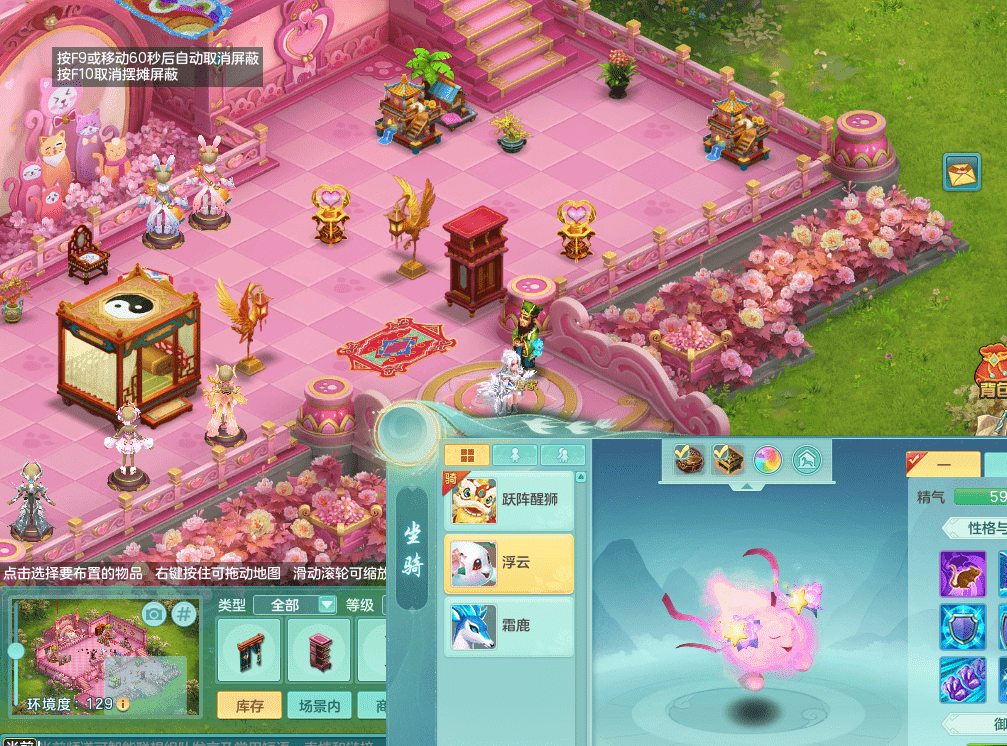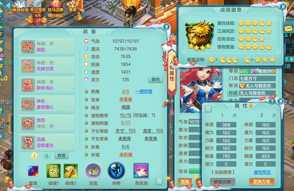 jt9403九天揽月 159女方寸 5.0化龙鼎(70攻击,280气血)精灵舞 神佑魔音项链 迅捷慈航鞋子 一线装备毕业 1内神 1龙无内 5觉醒 10个左右满果子 1宠皮还有1源生 宠物孩子齐全 3只坐骑 粉色豪宅 154庭院