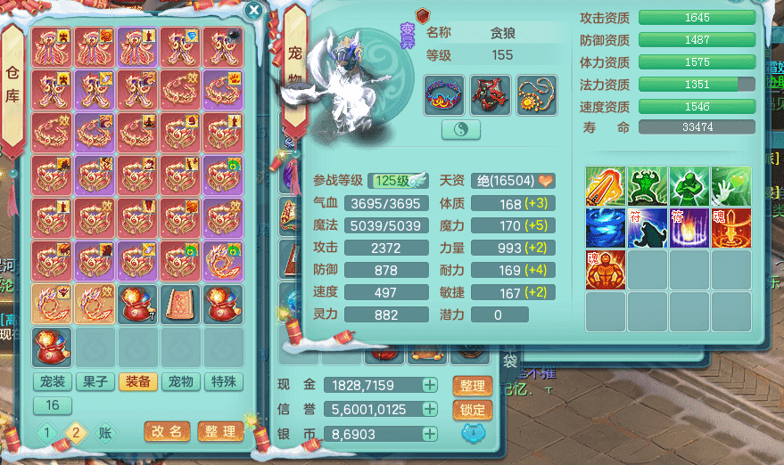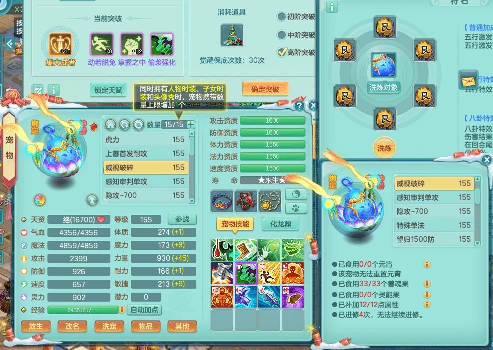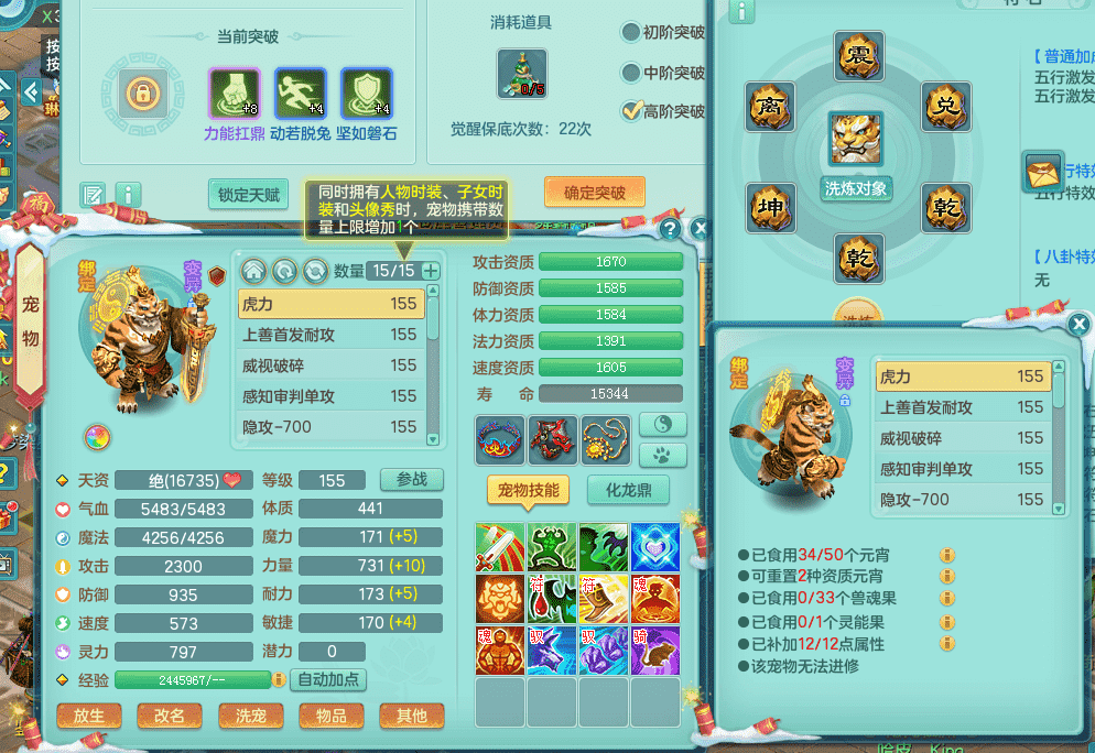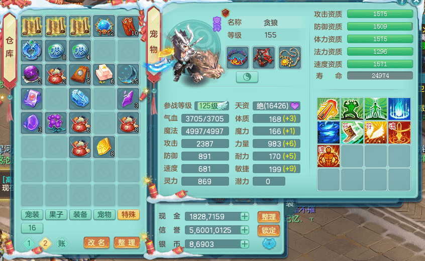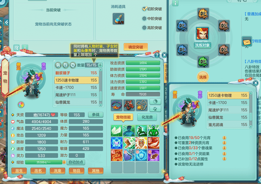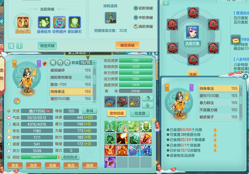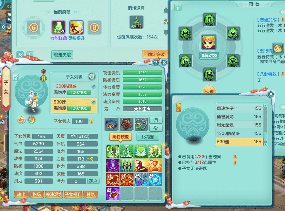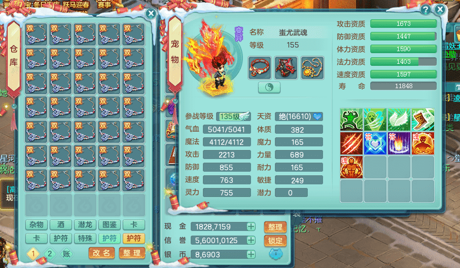 jt9403九天揽月 159女方寸 5.0化龙鼎(70攻击,280气血)精灵舞 神佑魔音项链 迅捷慈航鞋子 一线装备毕业 1内神 1龙无内 5觉醒 10个左右满果子 1宠皮还有1源生 宠物孩子齐全 3只坐骑 粉色豪宅 154庭院