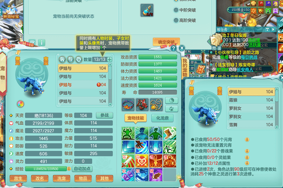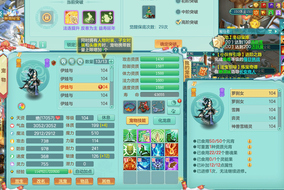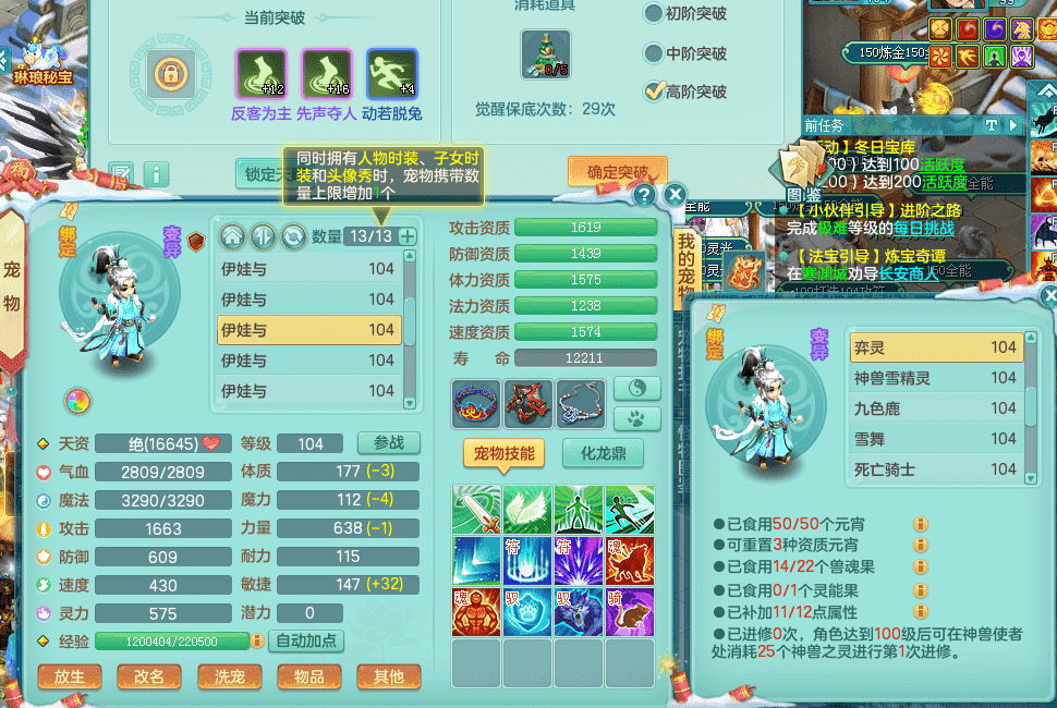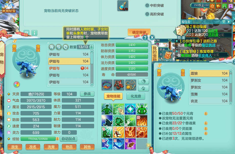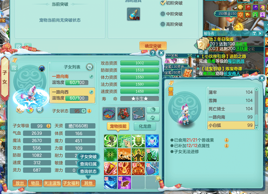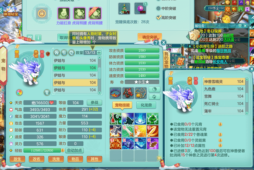 yc9412阳春白雪 99女魔王 3.0基础化龙鼎(42攻击,168气血) 白色大老虎坐骑 染色皮肤精灵 1内神锤子 1觉醒 15+满果子 有几只炼妖宠物 装备兼顾辅助 宠物齐全 154美观庭院 113海洋豪宅