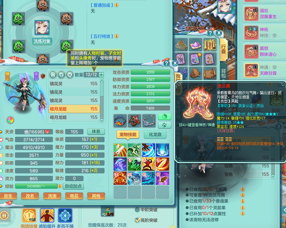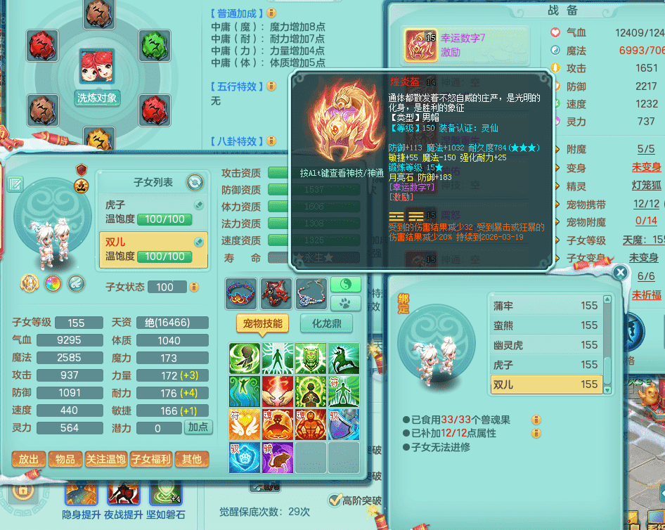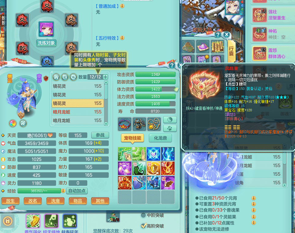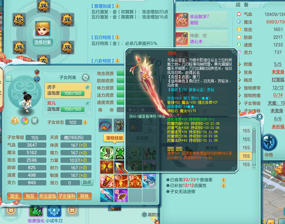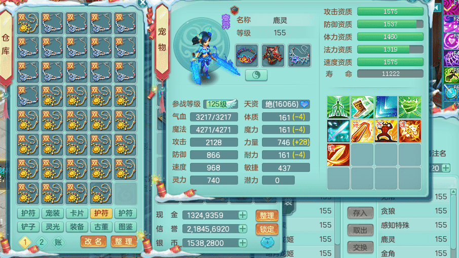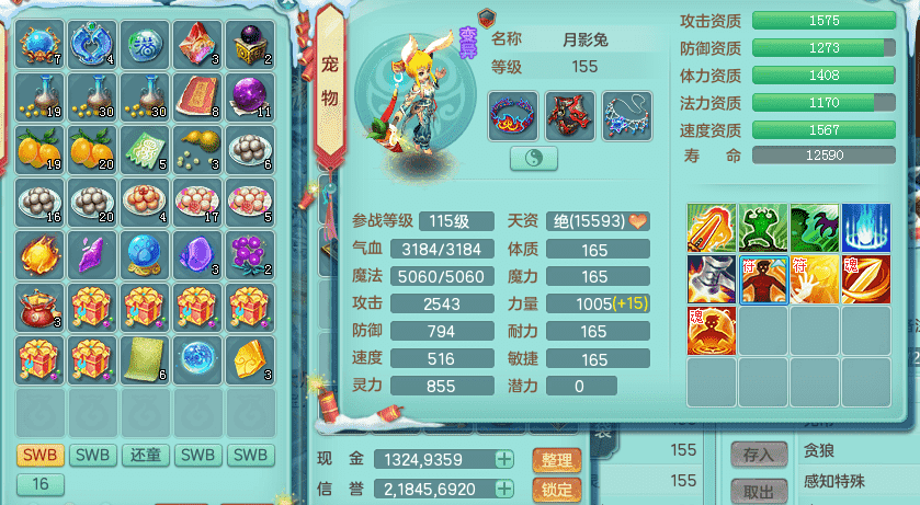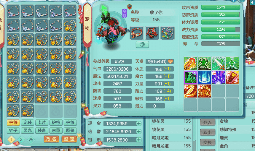 tx9417天下无双 159男盘丝 精灵舞 5.5化龙鼎 特殊风卷兽决 一千五百万神武币 数字激励头 强壮慈航衣服 震怒群体清心腰带 辅助装备不错,还有多件特技可切换 3镜花2龙姬 宠物齐全 综合4个满果子