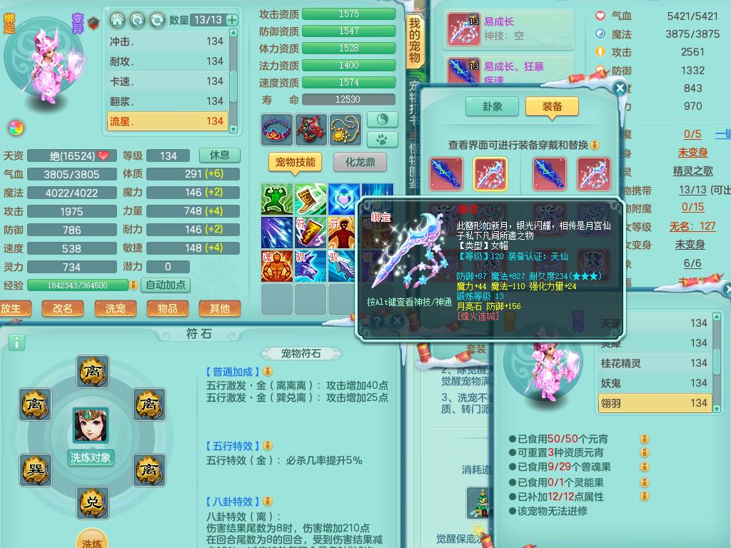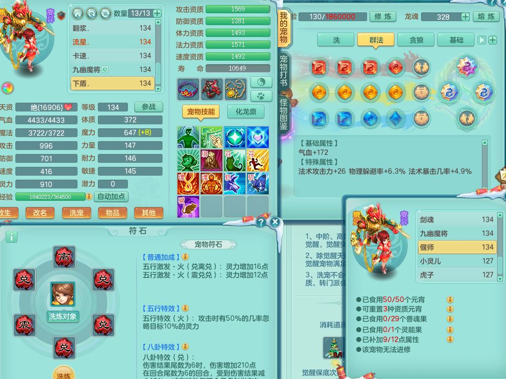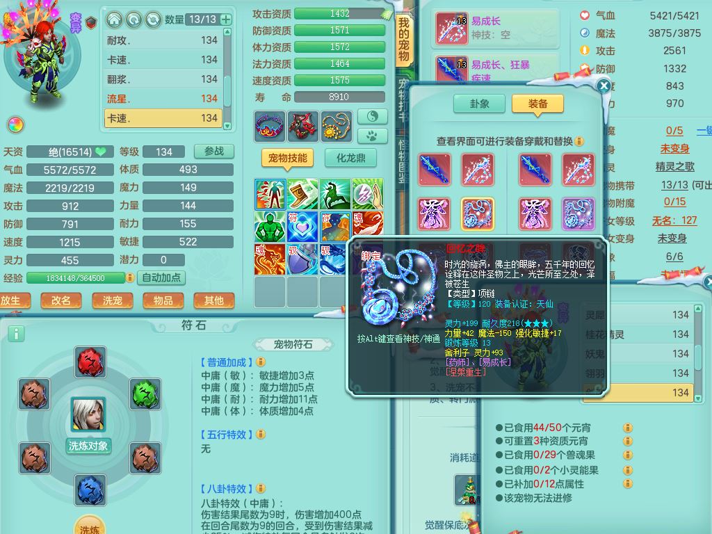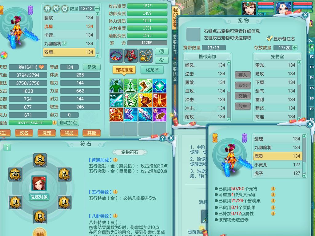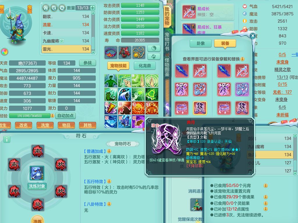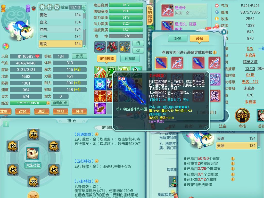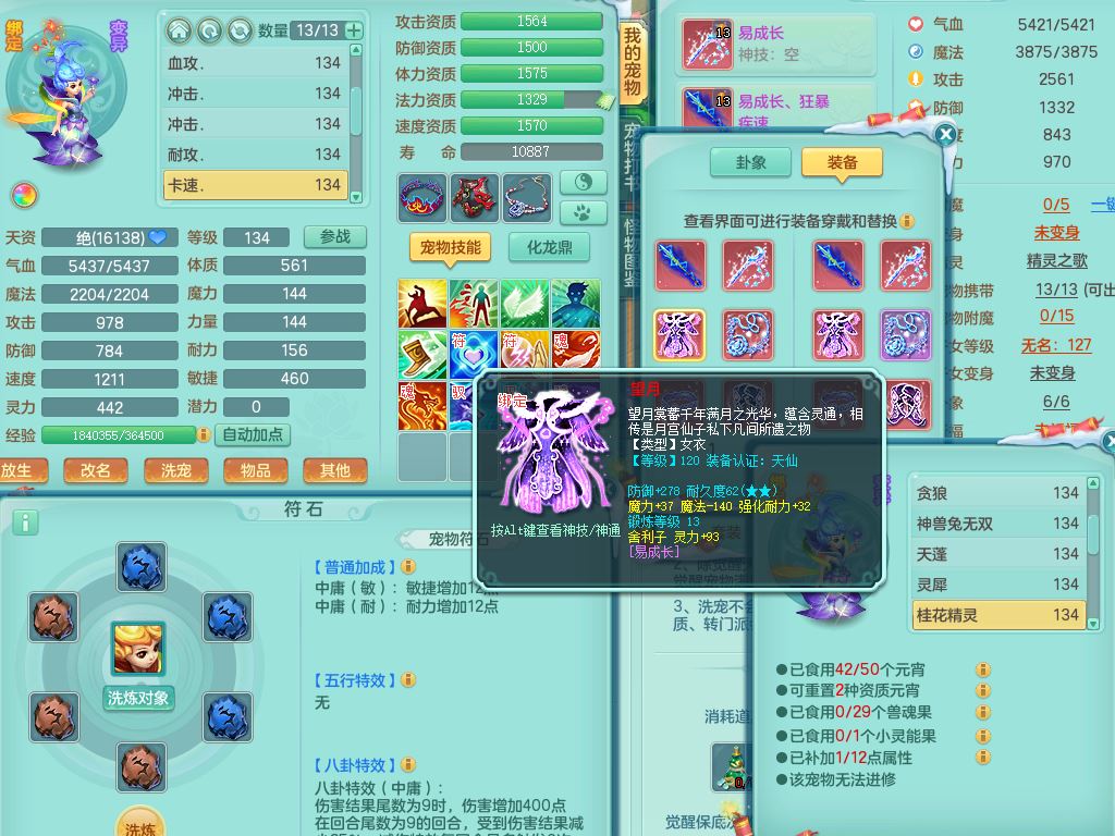 tx9456天下无双129女五庄精灵歌,满级共鸣,1内丹神5只炼妖多技能宠,8只满果子1觉醒15个4字3个5字(1洗练珠),8红,706单加Y狂暴流云武器,单加迅捷鞋,法系199单加Y药师慈航项链,单加Y衣服,鼎3.5,2套符石,永久头饰精灵皮肤,162W神武币,飞行双人坐骑