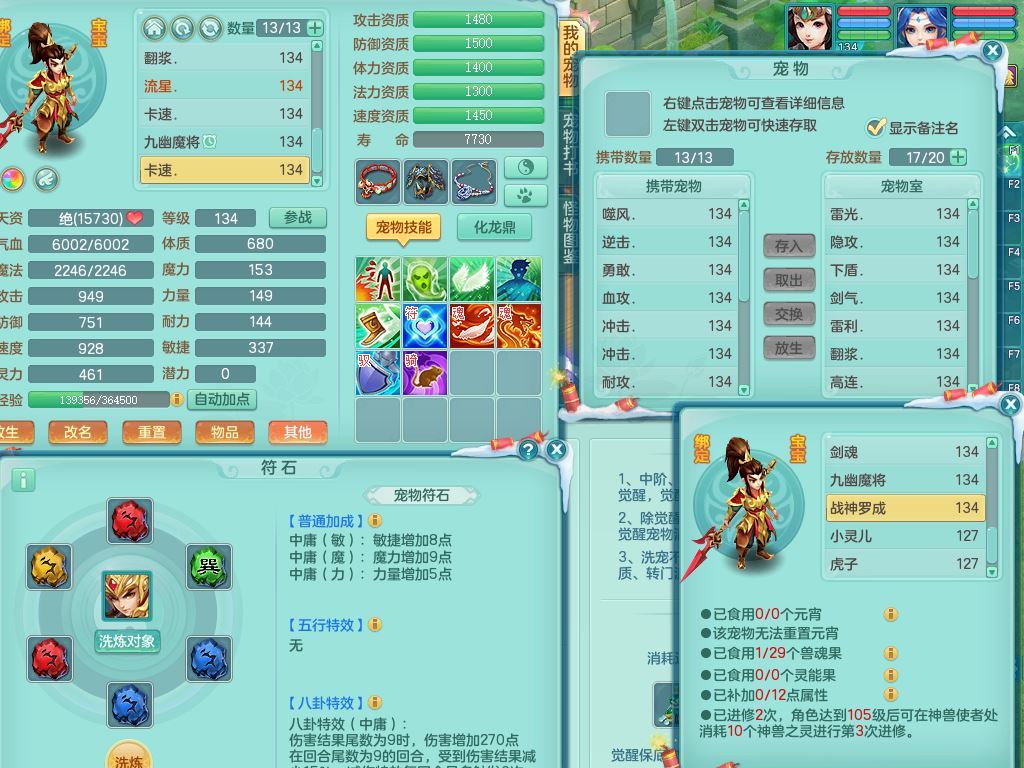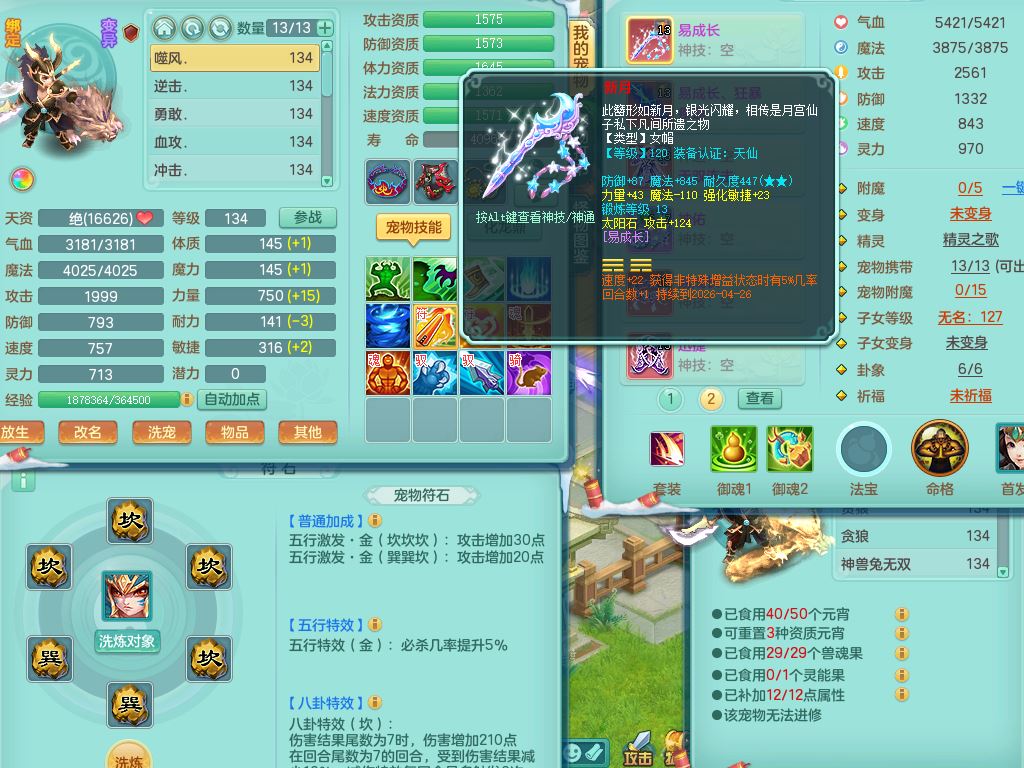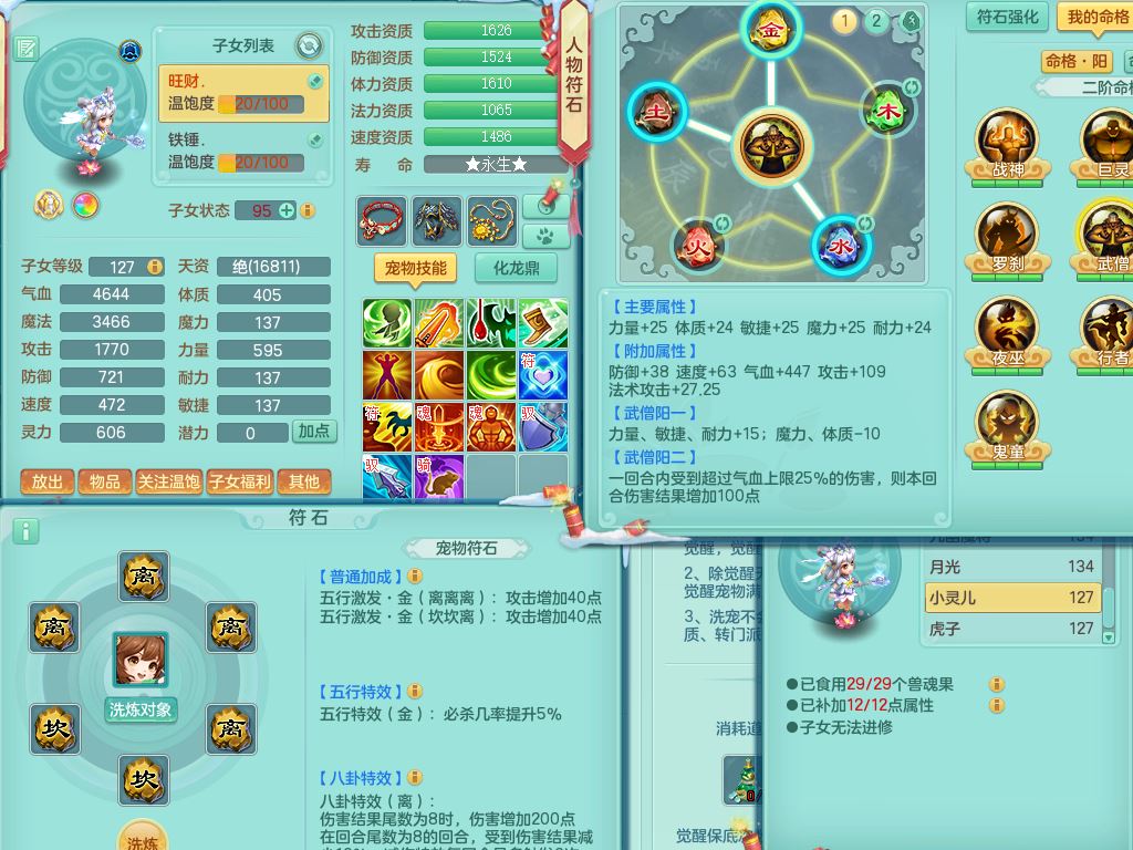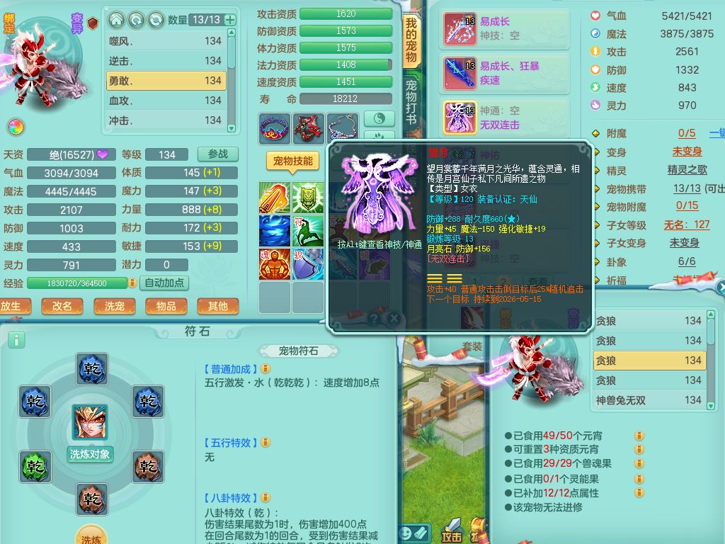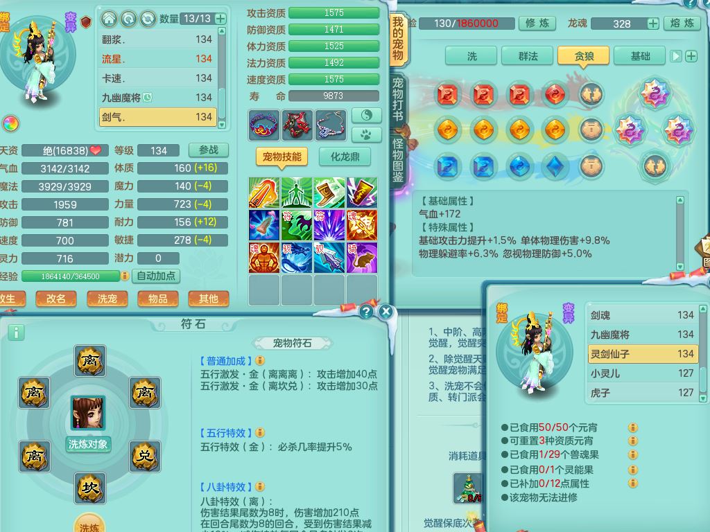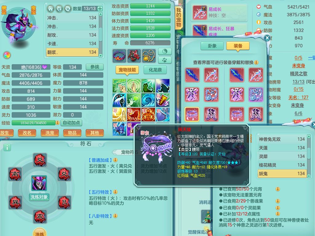tx9456天下无双129女五庄精灵歌,满级共鸣,1内丹神5只炼妖多技能宠,8只满果子1觉醒15个4字3个5字(1洗练珠),8红,706单加Y狂暴流云武器,单加迅捷鞋,法系199单加Y药师慈航项链,单加Y衣服,鼎3.5,2套符石,永久头饰精灵皮肤,162W神武币,飞行双人坐骑