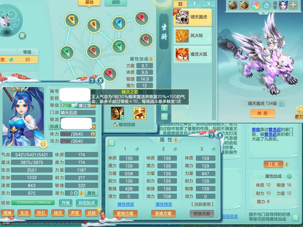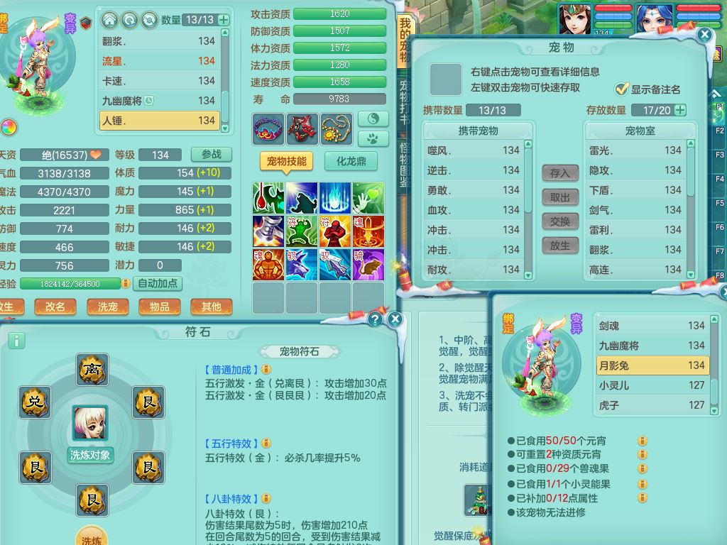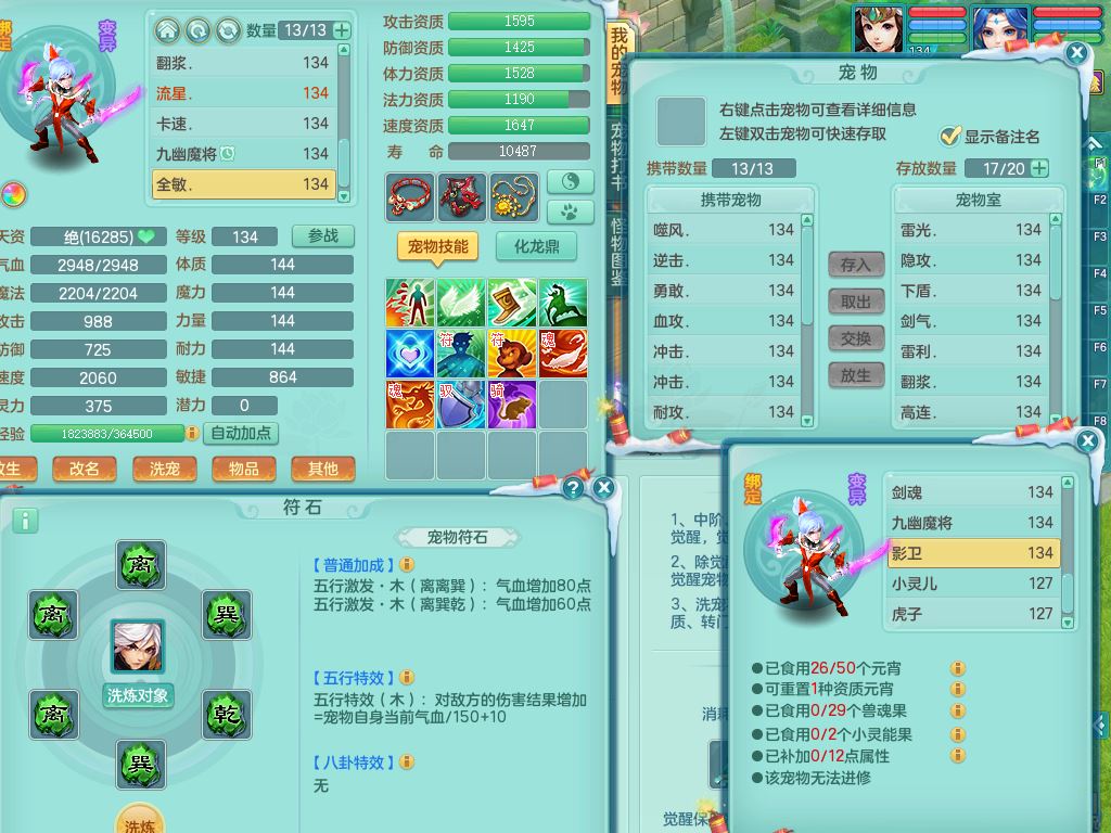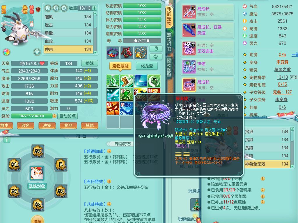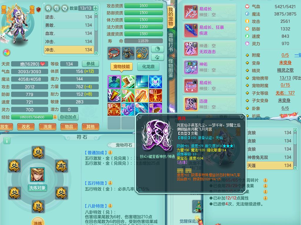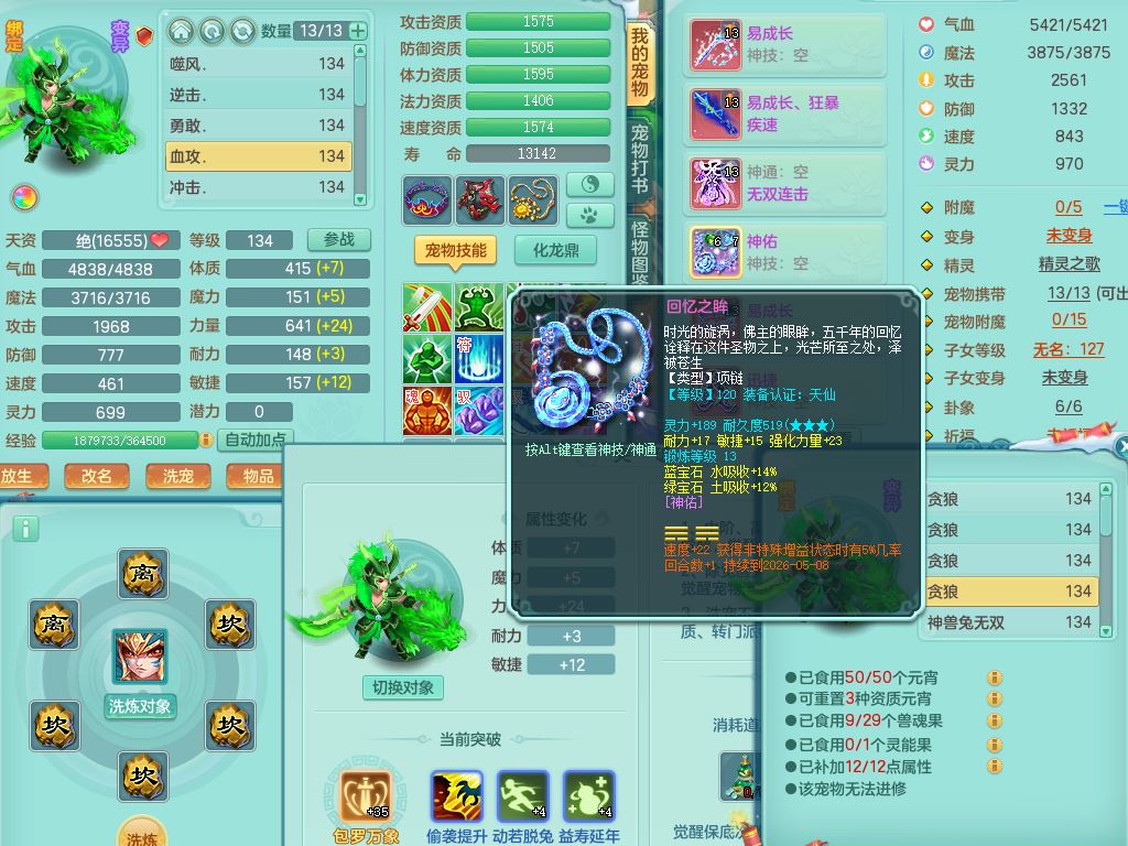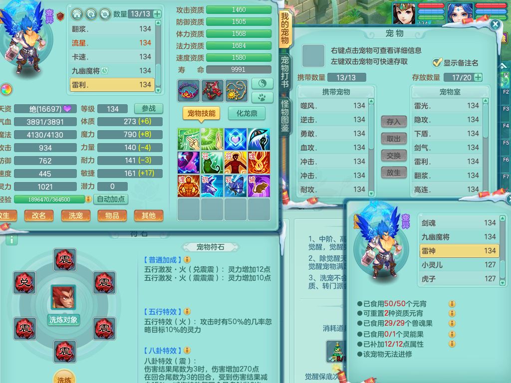 tx9456天下无双129女五庄精灵歌,满级共鸣,1内丹神5只炼妖多技能宠,8只满果子1觉醒15个4字3个5字(1洗练珠),8红,706单加Y狂暴流云武器,单加迅捷鞋,法系199单加Y药师慈航项链,单加Y衣服,鼎3.5,2套符石,永久头饰精灵皮肤,162W神武币,飞行双人坐骑