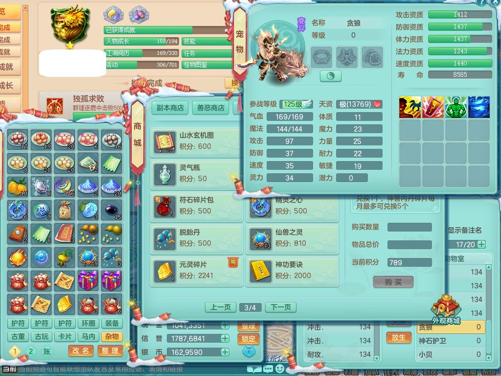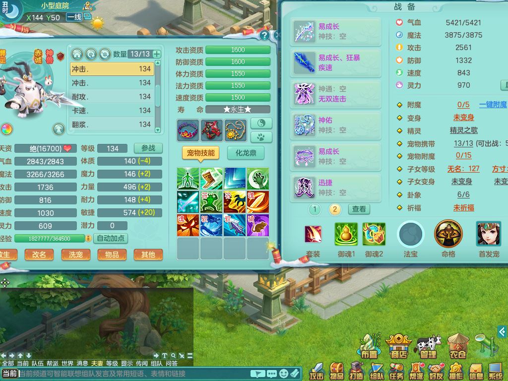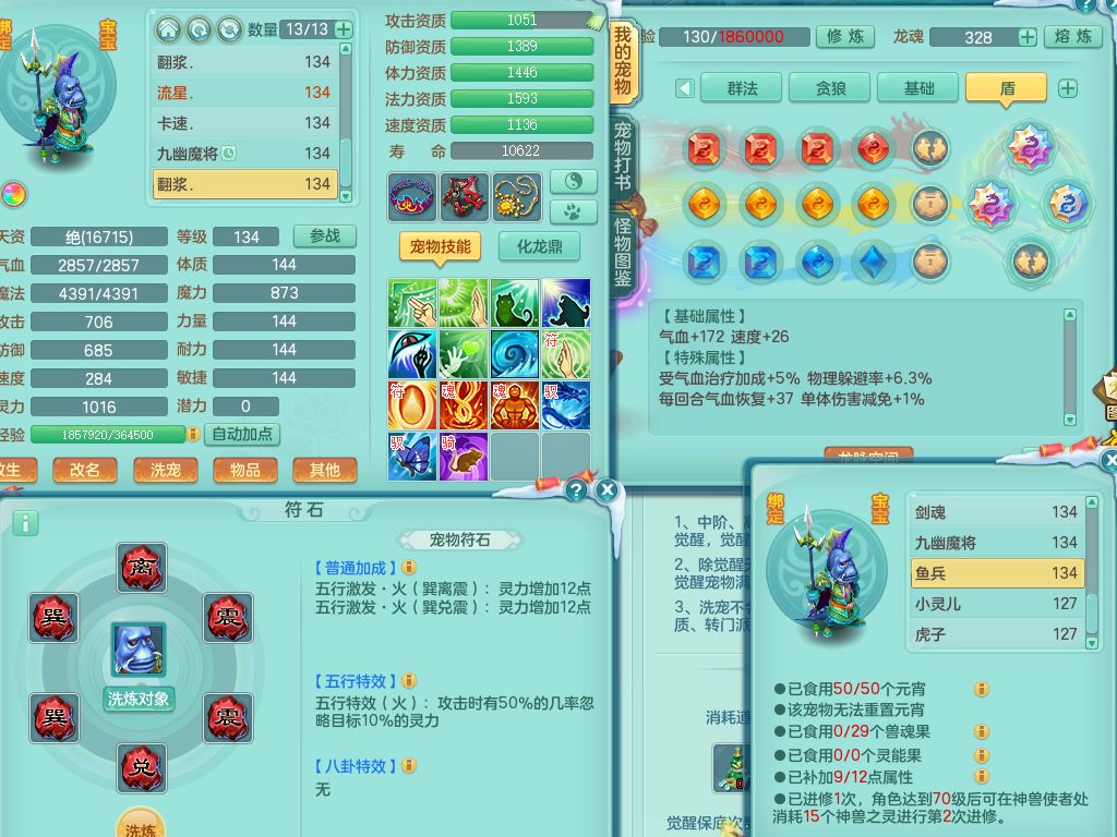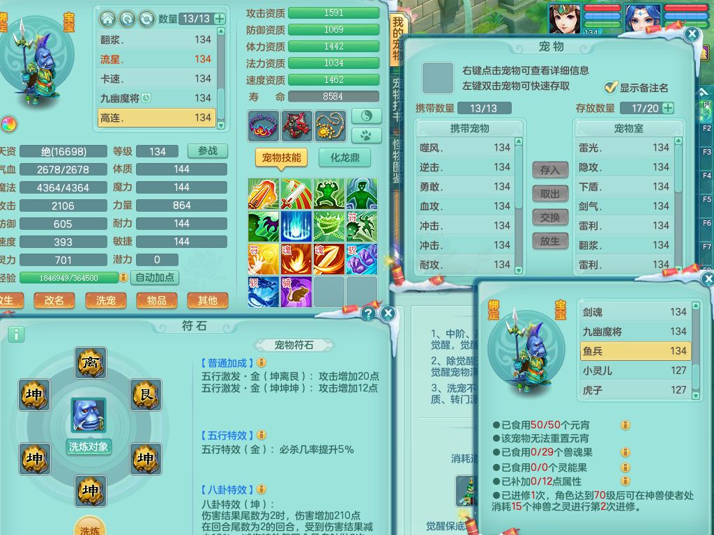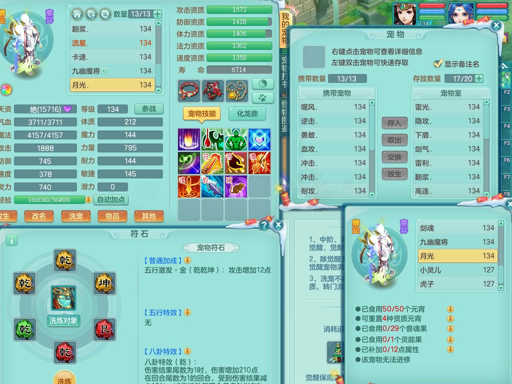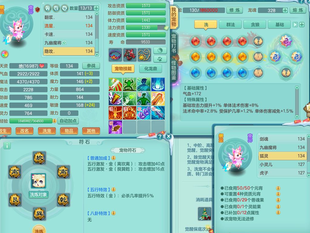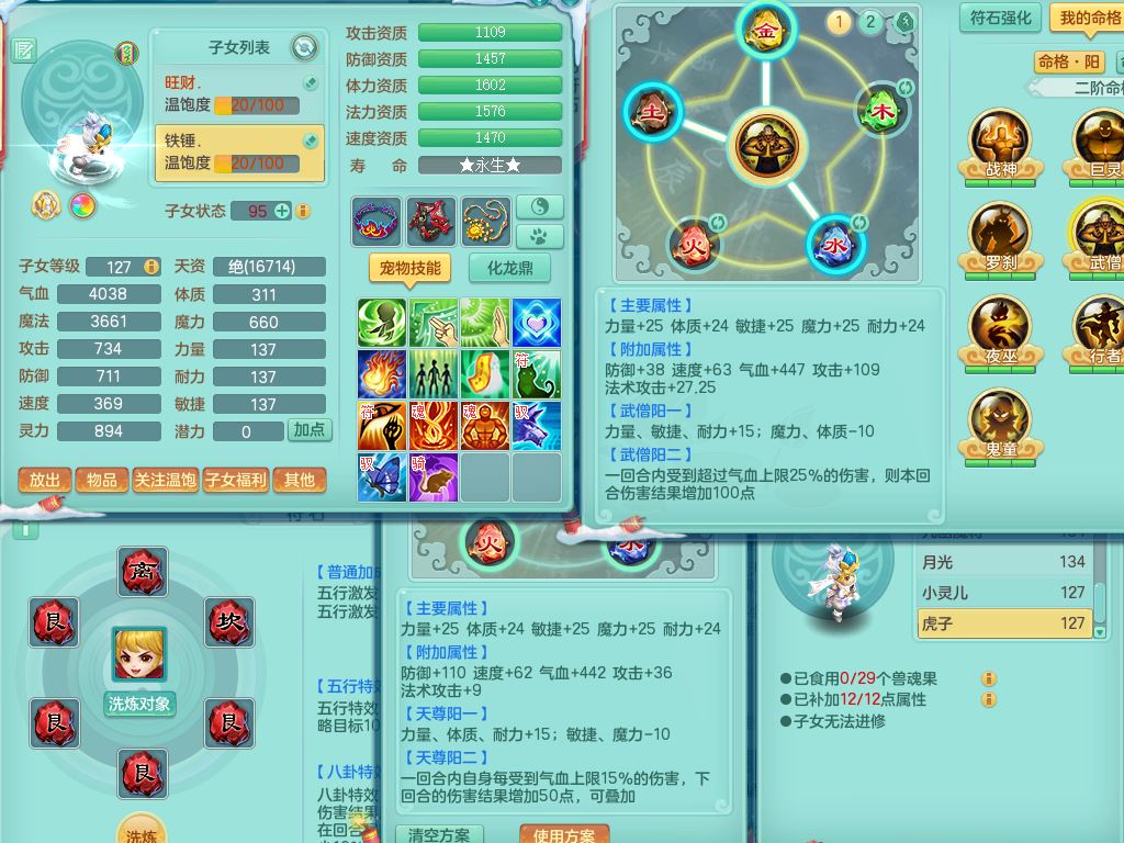 tx9456天下无双129女五庄精灵歌,满级共鸣,1内丹神5只炼妖多技能宠,8只满果子1觉醒15个4字3个5字(1洗练珠),8红,706单加Y狂暴流云武器,单加迅捷鞋,法系199单加Y药师慈航项链,单加Y衣服,鼎3.5,2套符石,永久头饰精灵皮肤,162W神武币,飞行双人坐骑