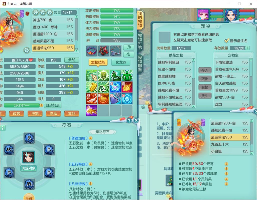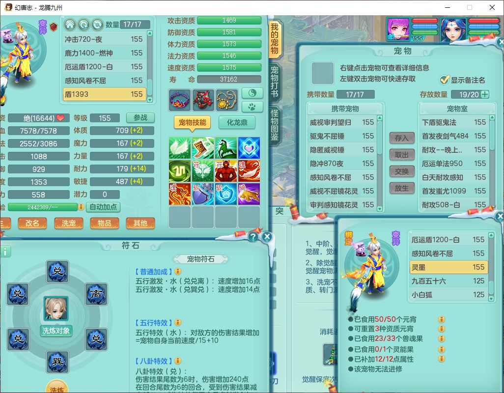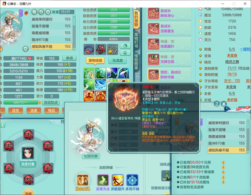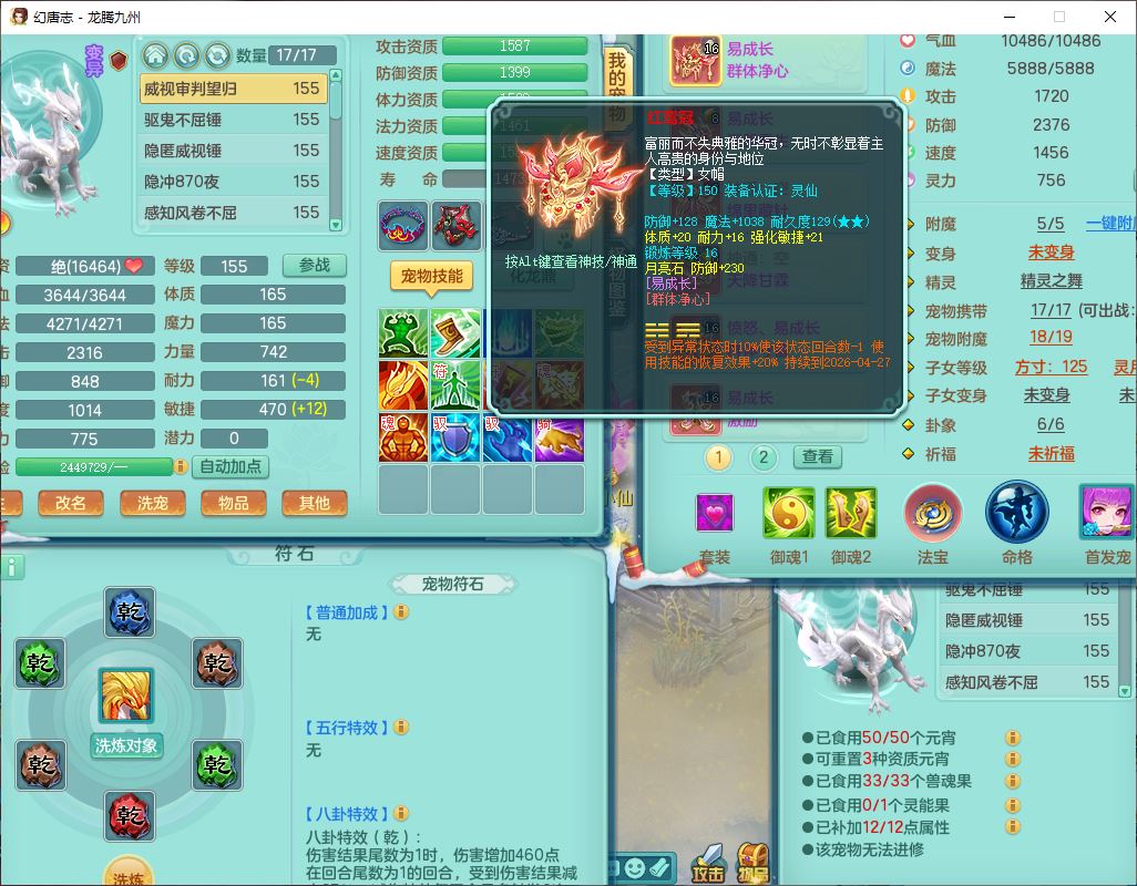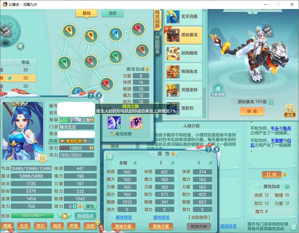 lt9469龙腾九州159女五庄【潜龙+暴龙逍客+西瓜冰】精灵舞、悟、歌,3龙(换)3内(1青蛇)5六技能镜花(1胚子)4特殊(风卷、雷利、烈焰,琴音兽决),16觉醒9宠皮14六字5五字10四字(1洗练珠)综合27只满果子,11红装备,Y晶清帽子,Y慈航武器,愤怒Y群体守备腰带,Y激励鞋子,一套七红输出装,Y止戈武器,Y驭兽鞋子,有法系装,法缭水清鞋子,鼎6.0+70+280,冰晶庭院233房屋173,永久外观、精灵皮肤,615W神武币,4双人坐骑(1飞行),带两个150奶粉