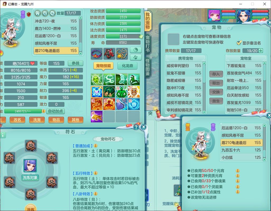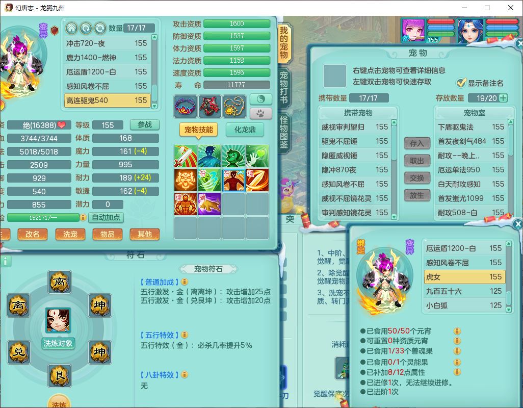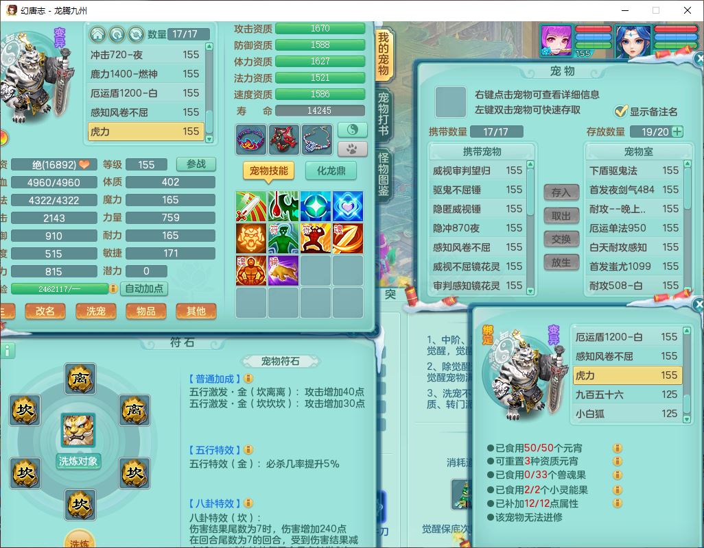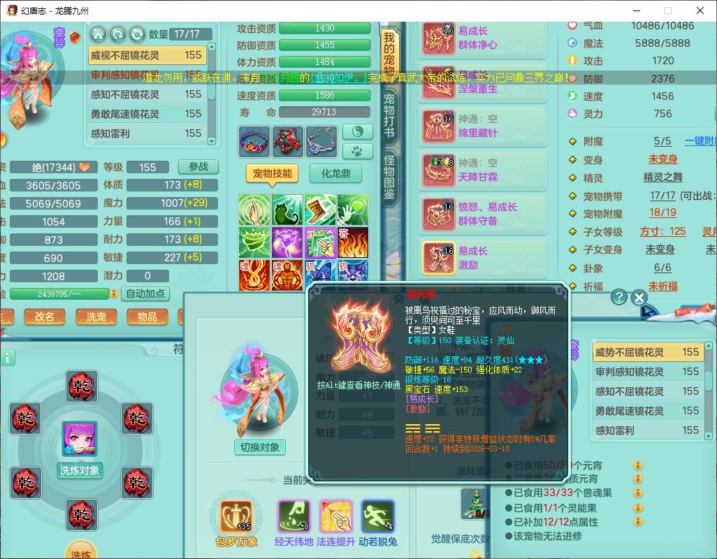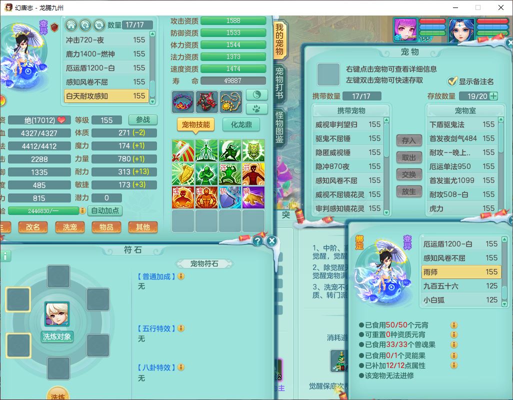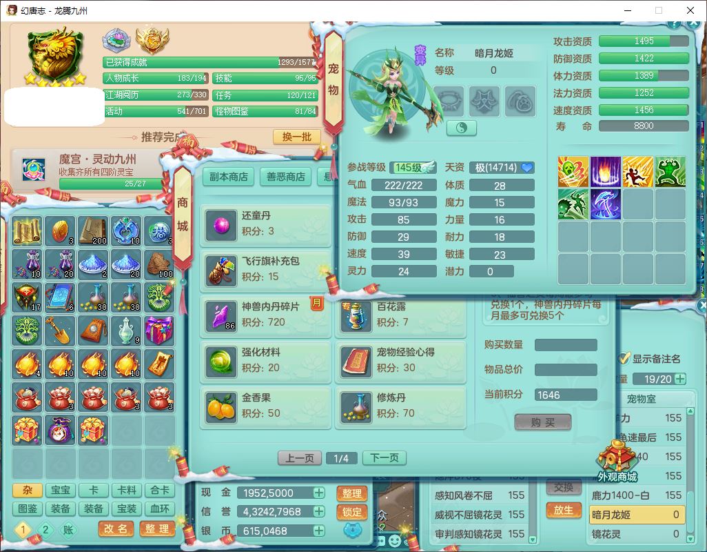 lt9469龙腾九州159女五庄【潜龙+暴龙逍客+西瓜冰】精灵舞、悟、歌,3龙(换)3内(1青蛇)5六技能镜花(1胚子)4特殊(风卷、雷利、烈焰,琴音兽决),16觉醒9宠皮14六字5五字10四字(1洗练珠)综合27只满果子,11红装备,Y晶清帽子,Y慈航武器,愤怒Y群体守备腰带,Y激励鞋子,一套七红输出装,Y止戈武器,Y驭兽鞋子,有法系装,法缭水清鞋子,鼎6.0+70+280,冰晶庭院233房屋173,永久外观、精灵皮肤,615W神武币,4双人坐骑(1飞行),带两个150奶粉