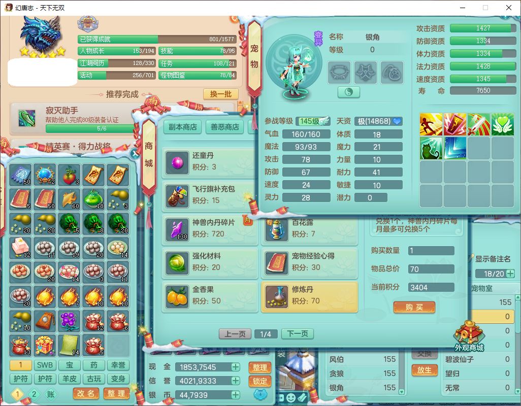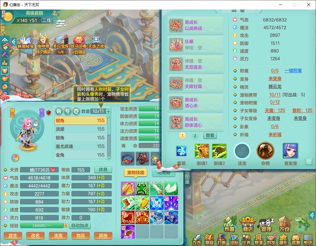 tx9473天下无双159女万兽准精灵歌,1神兽(无内)11只成品满高书宝宝2特殊兽决(守护*2),宝宝种类齐全,2孩子(天魔+普陀),9红装备,Y以战帽子,923狂暴武器,Y水清腰带,Y玉清鞋子,仓库多存货,1坐骑