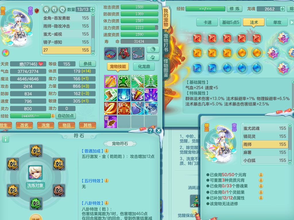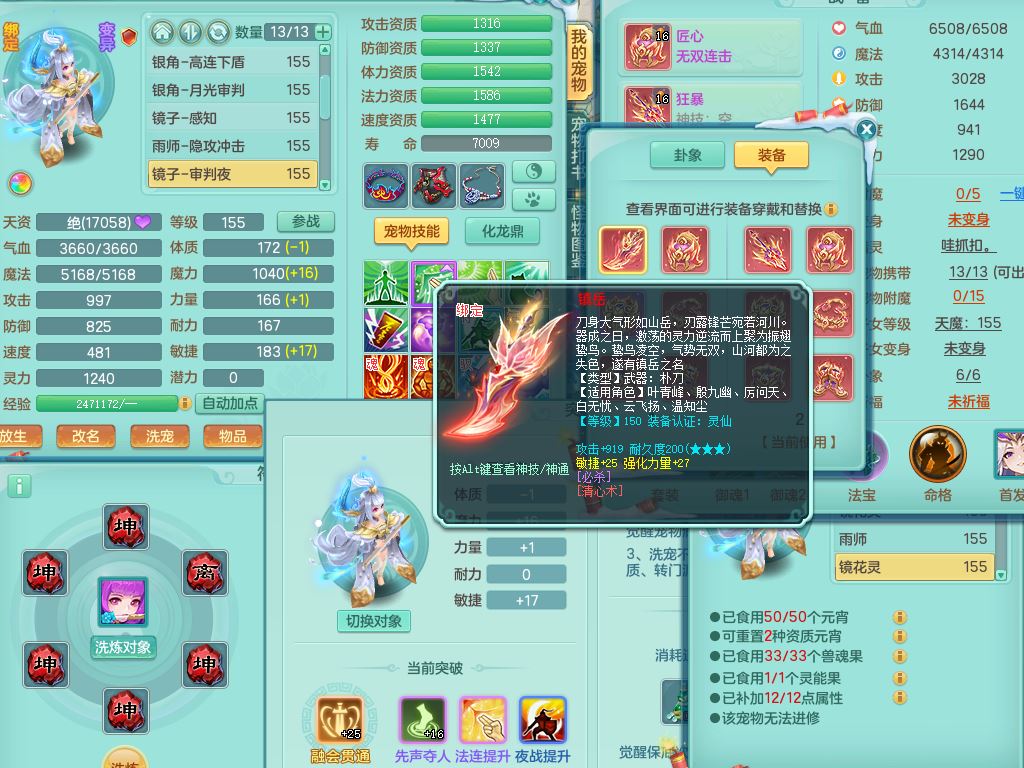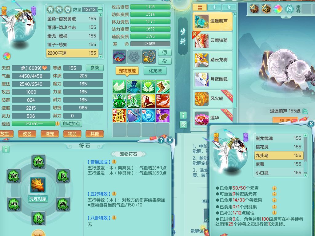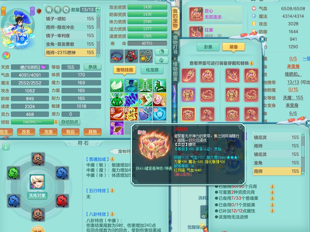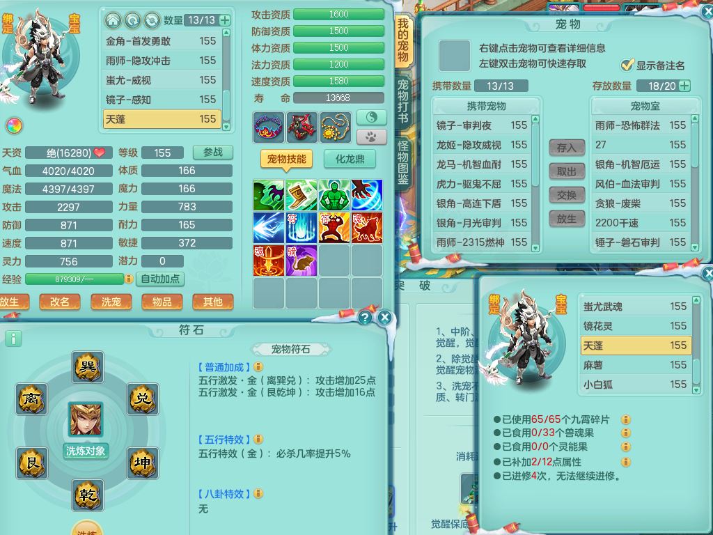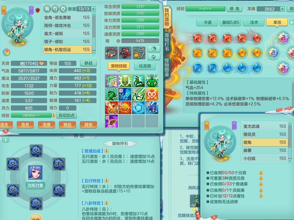jn9506今年勇159男万兽精灵舞,2套星穹,1内丹龙马3特殊(月光/藕断/翻江兽决)1皮(幻灵果)3镜花灵1龙姬,12只满果子4觉醒,全身单加10红,904狂暴武器,匠心破血头,强壮Y衣服,神佑迟滞项链,Y崩山鞋,鼎5.5+70,2套符石,永久外观精灵皮肤,5坐骑(3只双人)带150奶粉龙宫