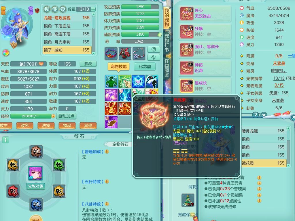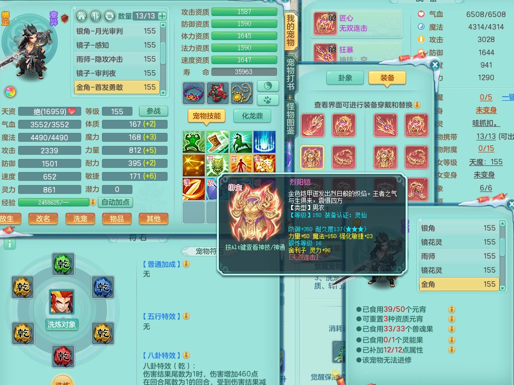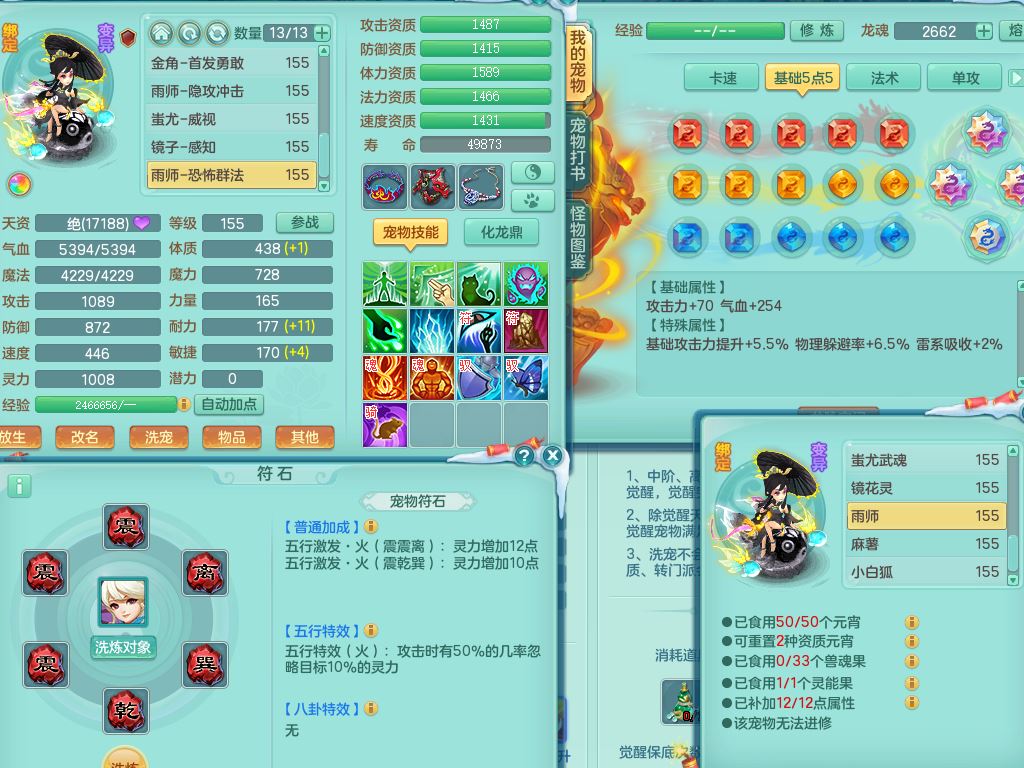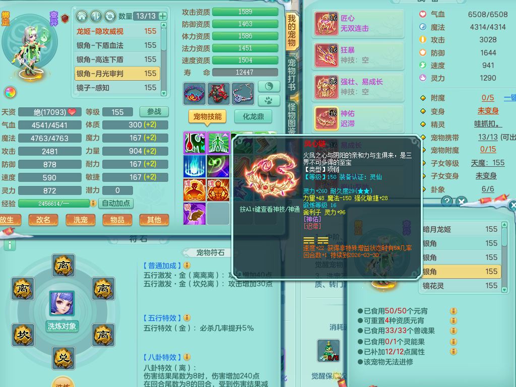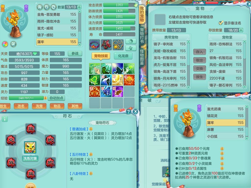 jn9506今年勇159男万兽精灵舞,2套星穹,1内丹龙马3特殊(月光/藕断/翻江兽决)1皮(幻灵果)3镜花灵1龙姬,12只满果子4觉醒,全身单加10红,904狂暴武器,匠心破血头,强壮Y衣服,神佑迟滞项链,Y崩山鞋,鼎5.5+70,2套符石,永久外观精灵皮肤,5坐骑(3只双人)带150奶粉龙宫