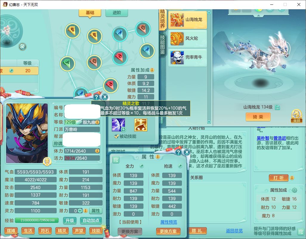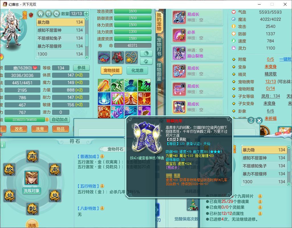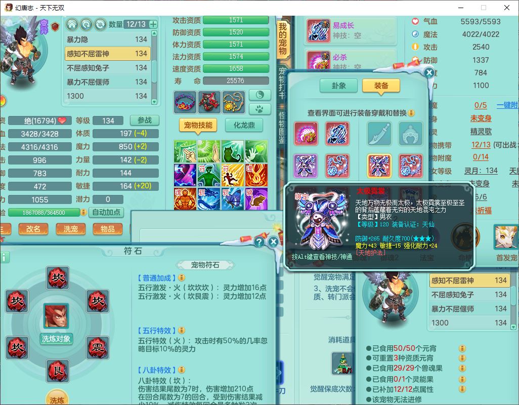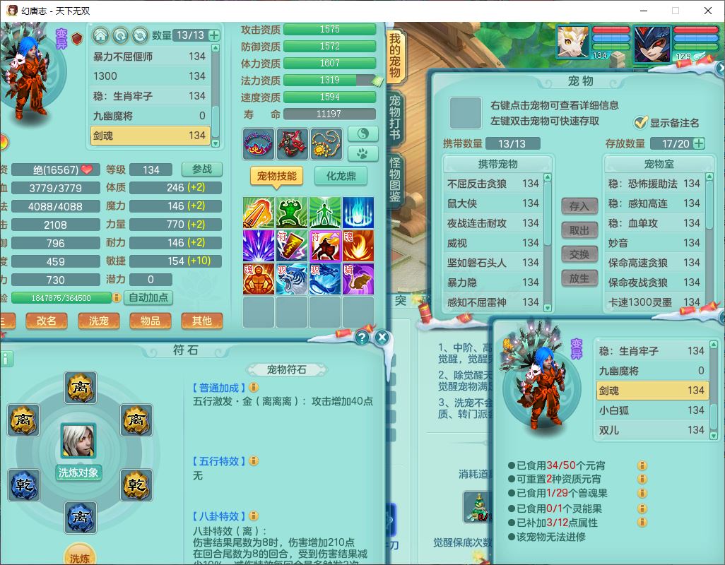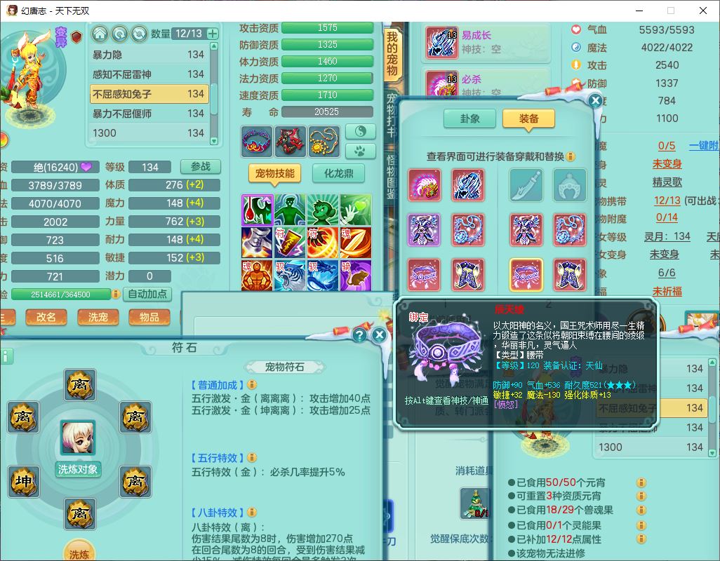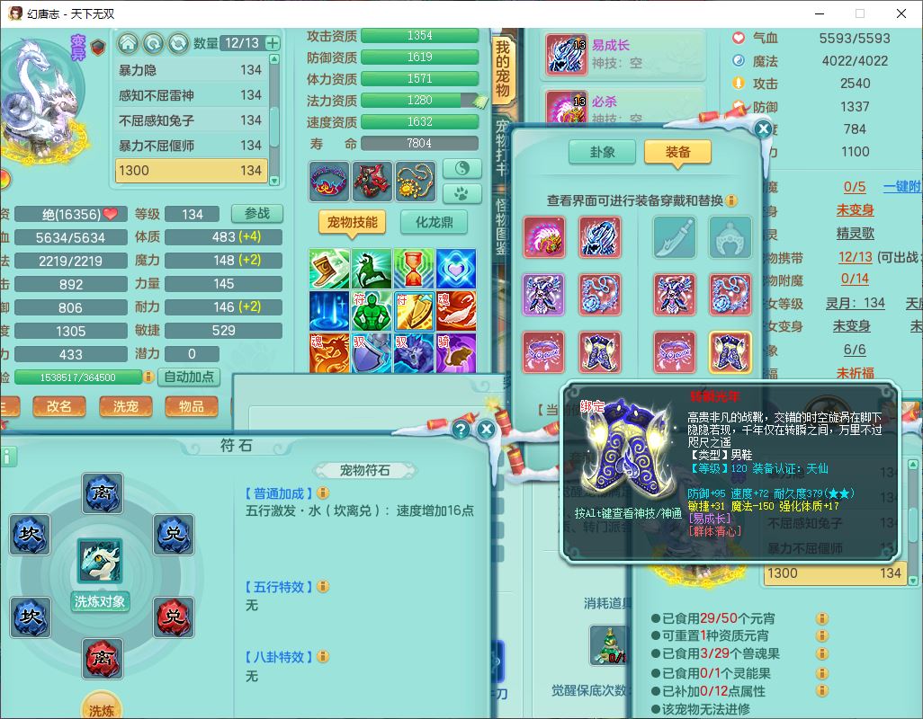 tx9540天下无双129男万兽精灵歌,1内丹龙马1七技能雷光妖鬼,宝宝种类齐全,2觉醒1宠皮2五字4四字(1洗练珠)综合6只满果子,装备齐全,733必杀武器,崩山衣服,Y玉清鞋子,鼎4.0,17个仙兽灵,1飞行坐骑