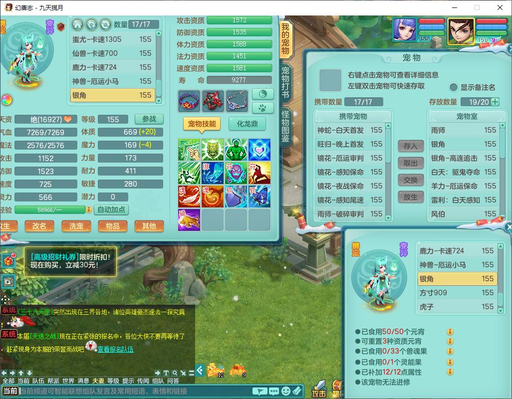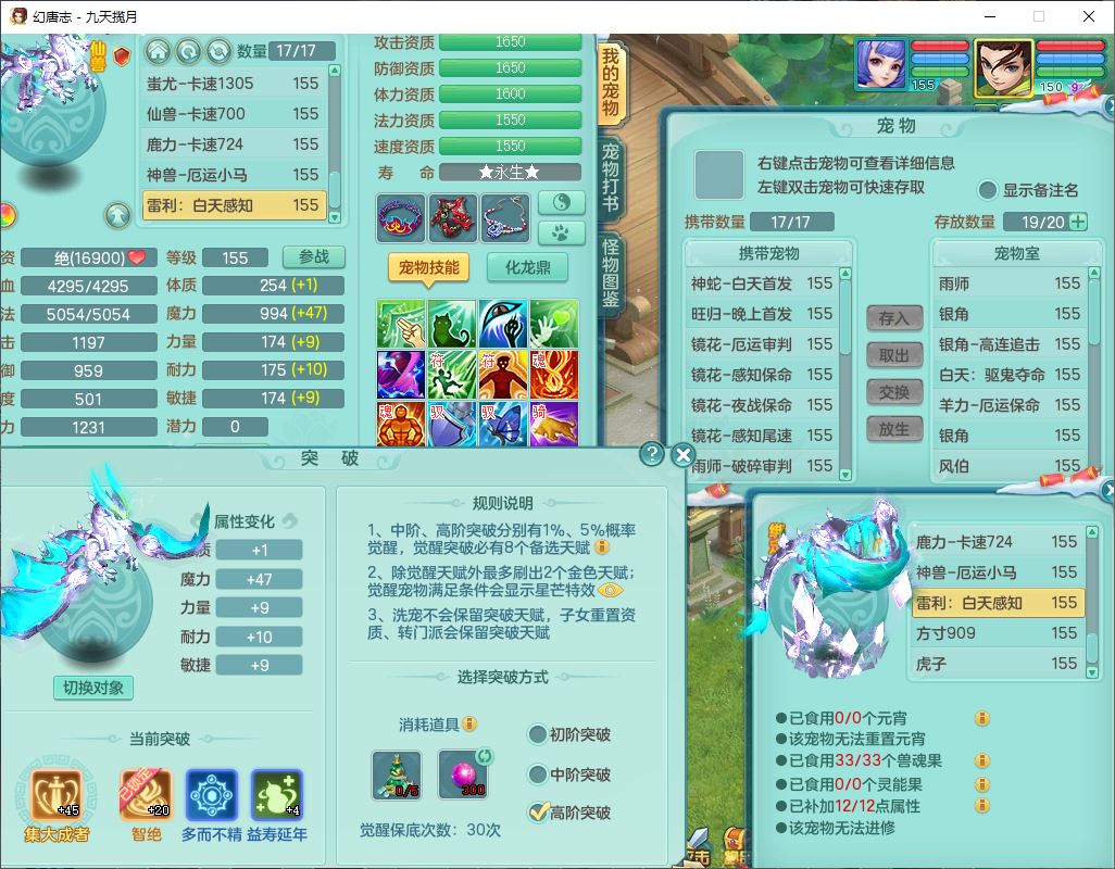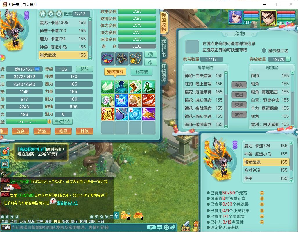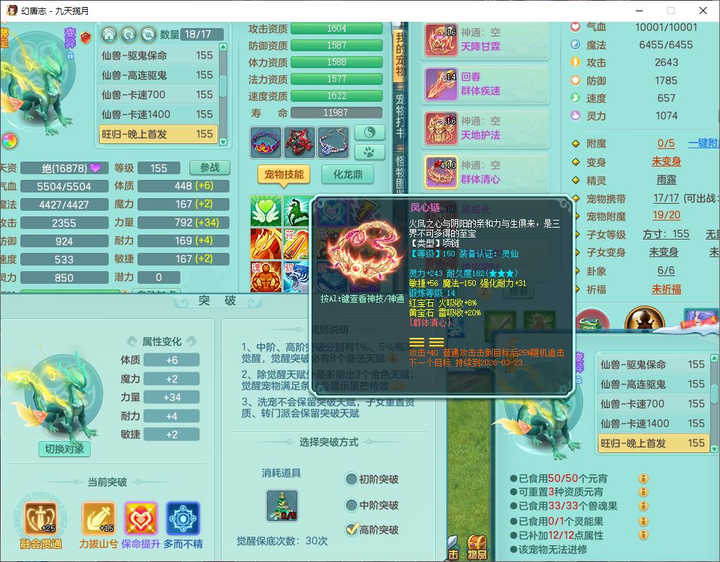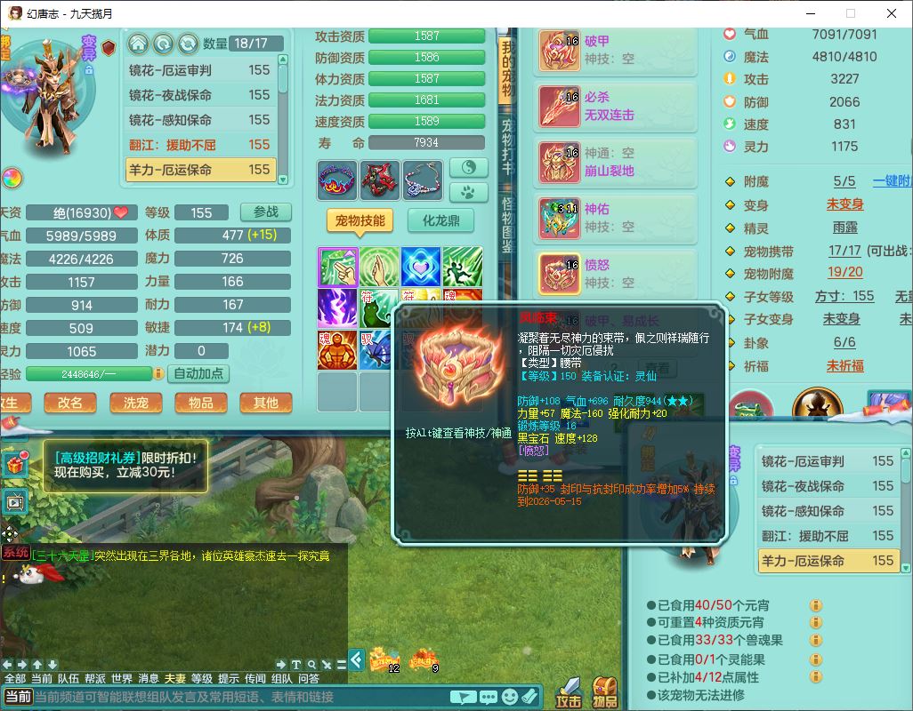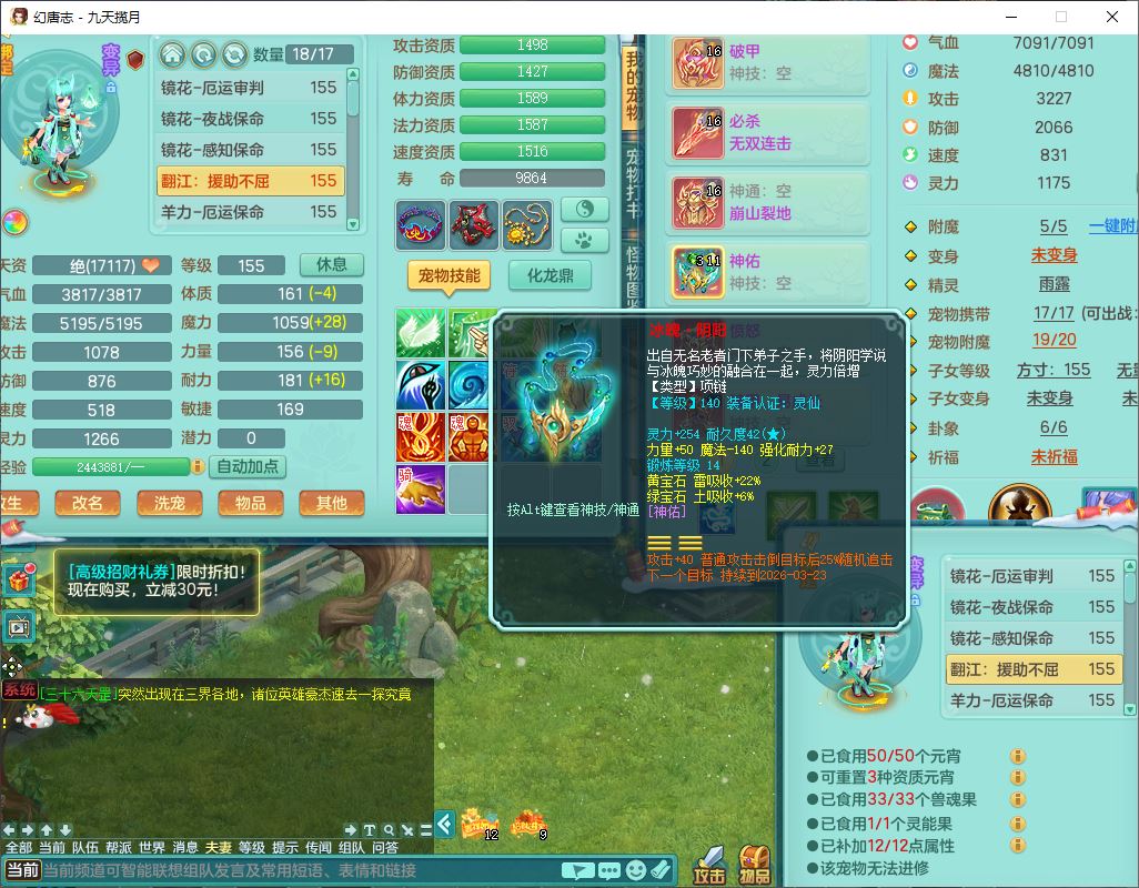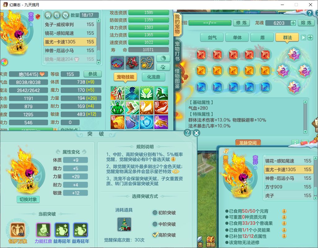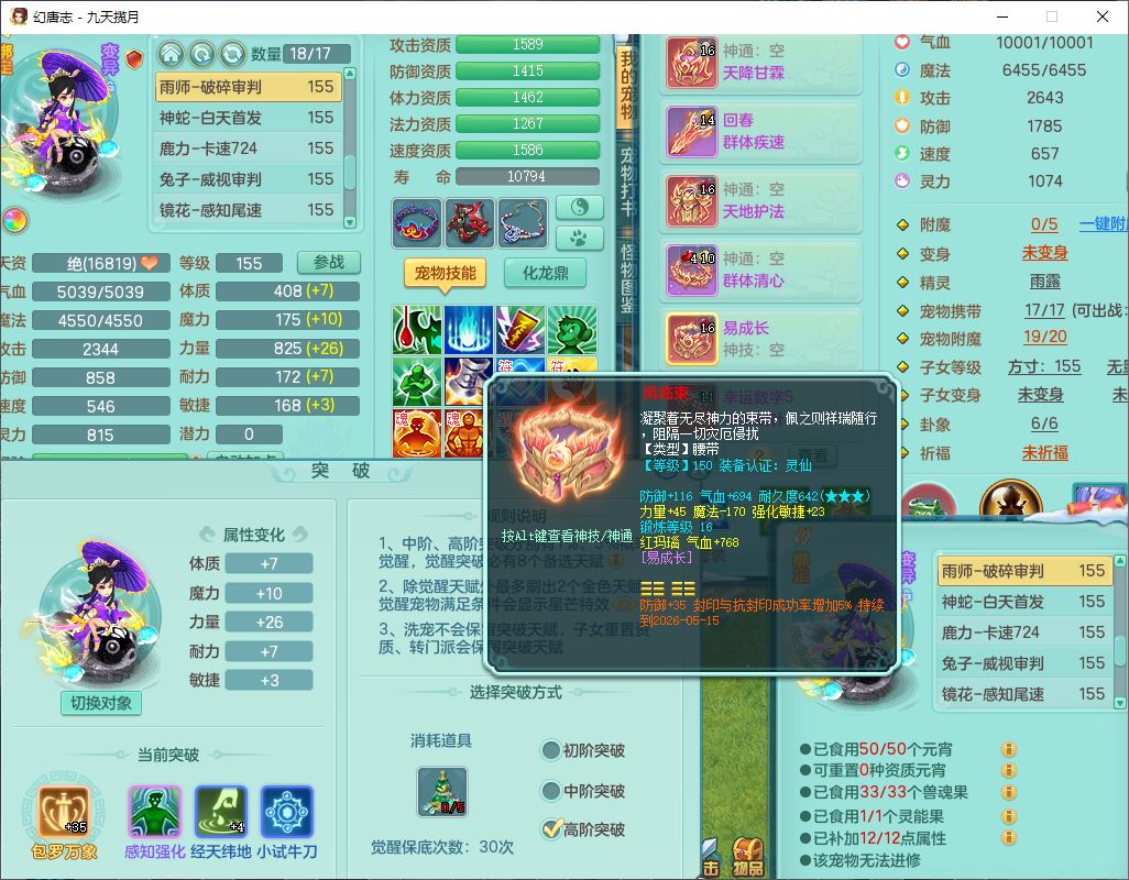 jt9560九天揽月159男天策【准潜龙号,差1只宝宝1条主符石+西瓜冰】精灵歌,5龙2内(1青蛇1龙马)4镜花9特殊(祈雨、翻江、破碎、夺命*2、剑胆、舍身、守护,墨守兽决)1龙姬胚子,7觉醒9以上六字27只满果子,17格子,8红星辰之拥双破甲装备,破甲帽子,必杀破血武器,崩山衣服,破甲Y鞋子,一套8红辅助装,回春群体疾速武器,幸运笑里鞋子,鼎5.0+70+280,法爆10.0,2套符石,20天月卡,111W神武币,18个内丹碎片,1绝版千机石,1双人坐骑
