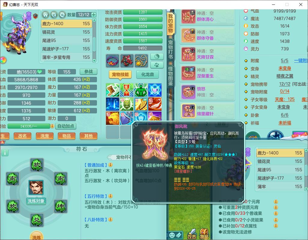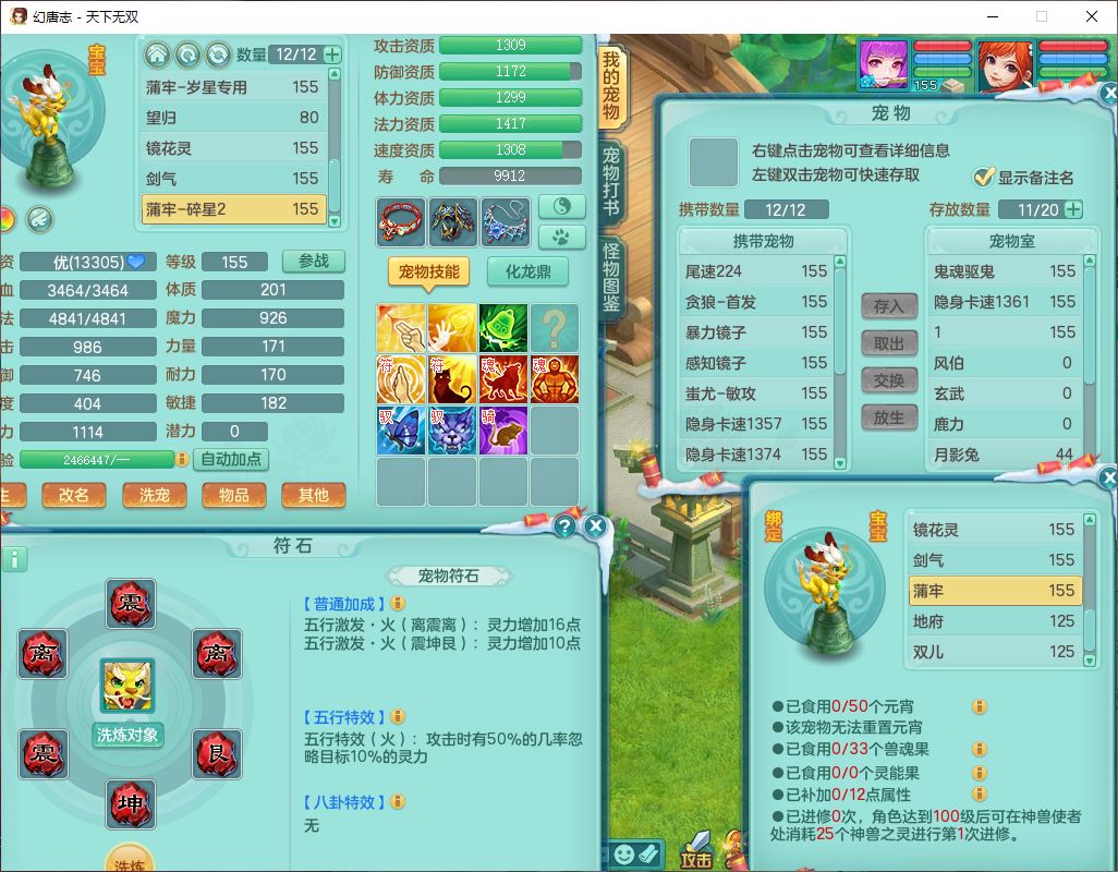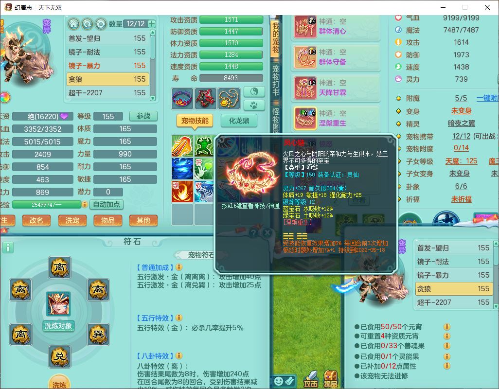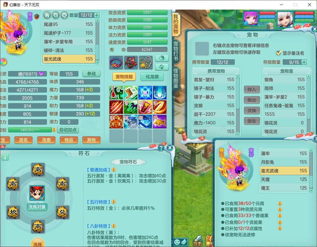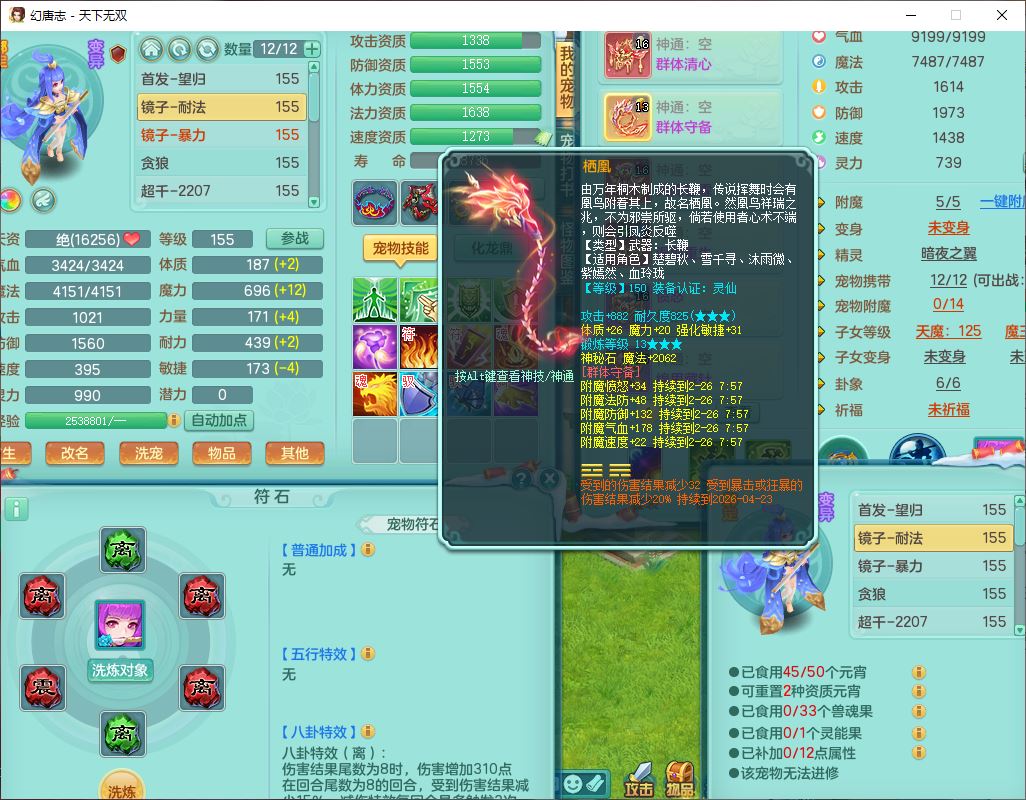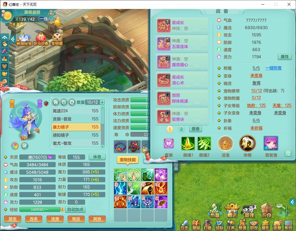 tx9592天下无双双开号159女盘丝精灵舞,1望归2镜花1鹿力1金炉,宝宝种类齐全,3五字6四字,愤怒五特装备齐全,鼎4.5;带159女鬼谷精灵歌,2镜花1蒲牢,8红装备,五雷武器,Y水清项链,愤怒群体疾速,鼎5.5,庭院152环境
