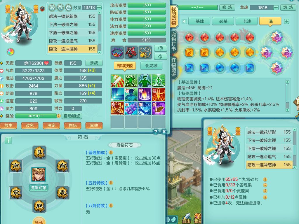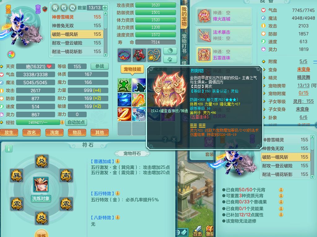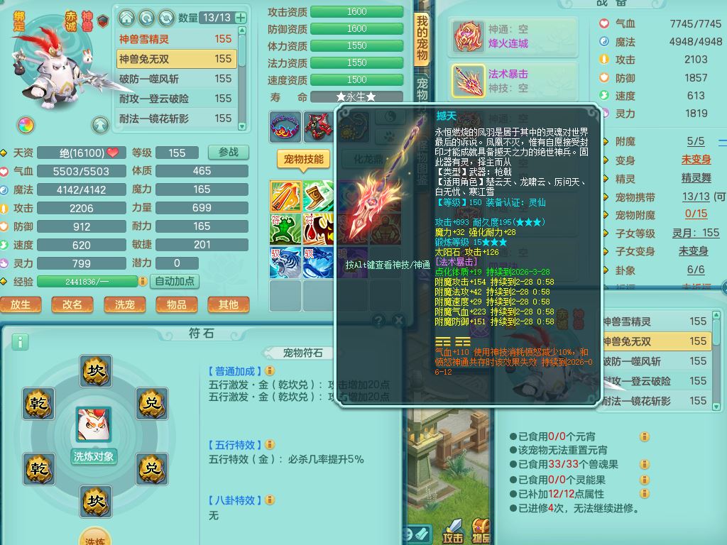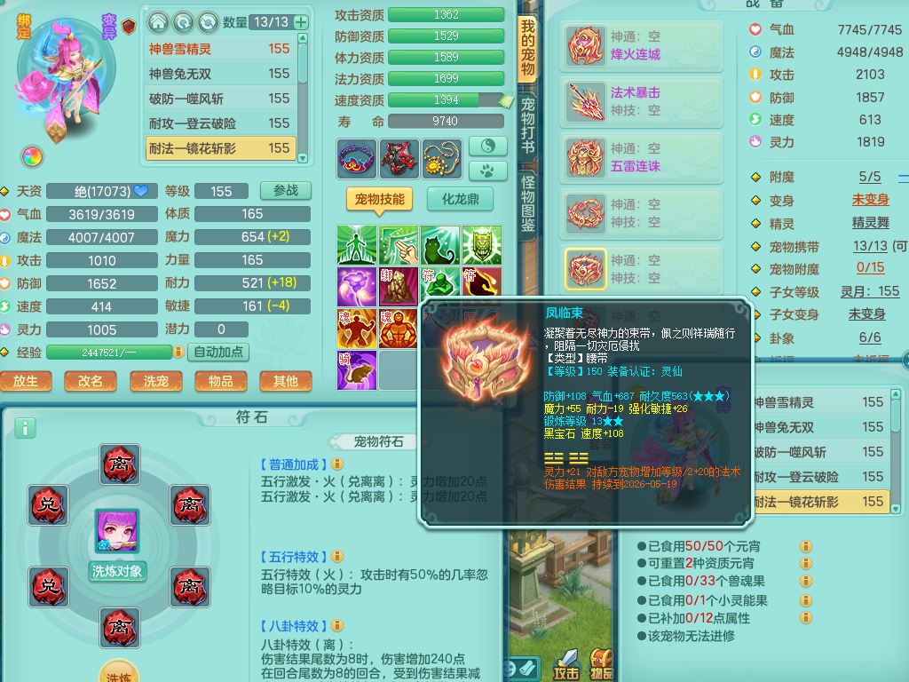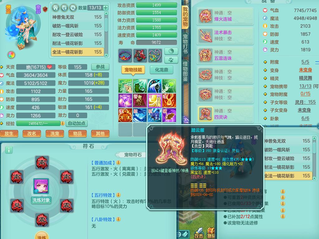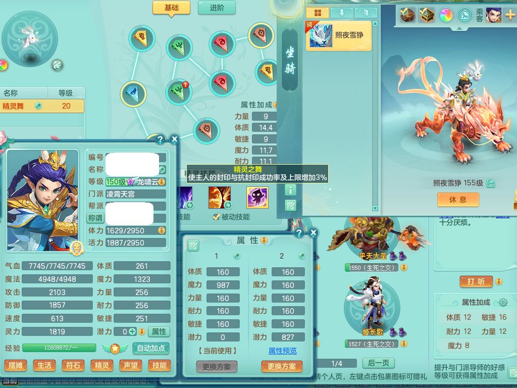 ss9598三生万物158男天宫精灵舞,2内丹神,3镜花灵,法爆武器,五雷衣服,单加四灵鞋,鼎5.5,永久外观精灵皮肤,19内丹碎片,双人坐骑