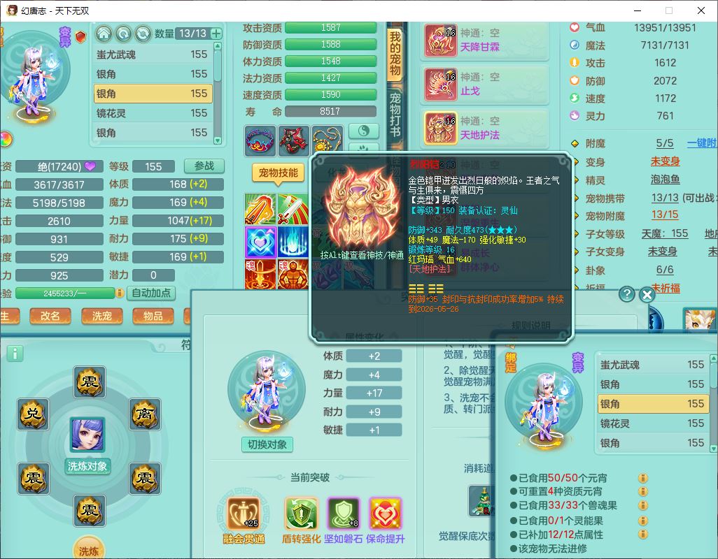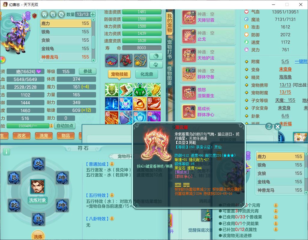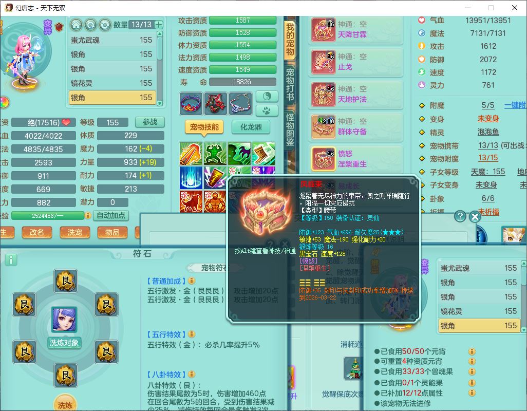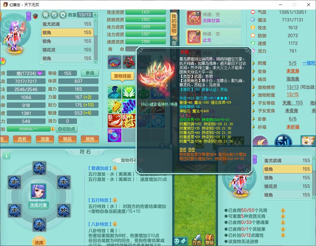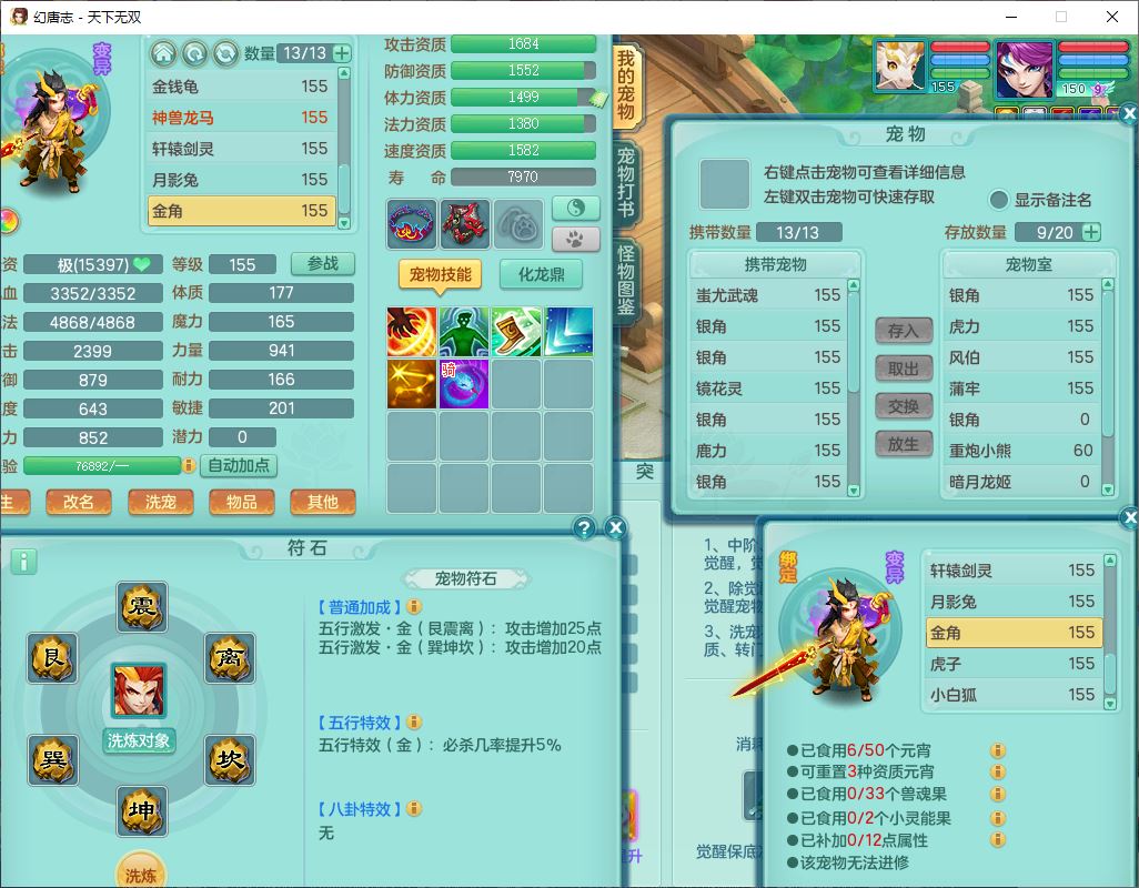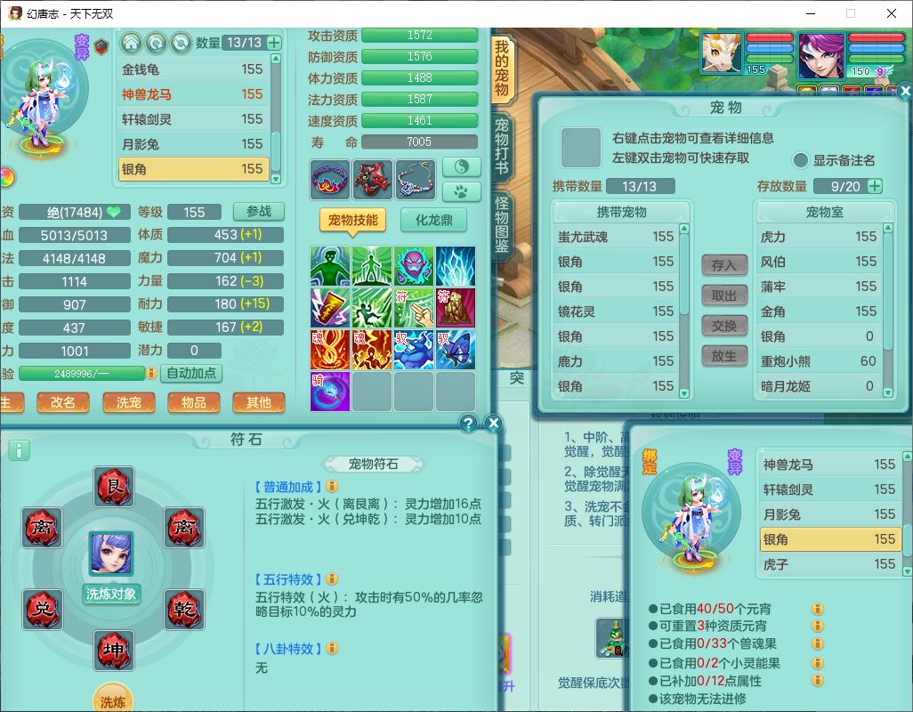 tx9608天下无双159男灵月精灵怒,1龙马(无内)1镜花3特殊(藕断、青霜,以战兽决)16只成品宝宝,2六字1五字5四字,8红装备,愤怒慈航,Y晶清鞋子,有法系装,鼎5.5,25天月卡,7个内丹碎片,60个仙兽灵,2坐骑