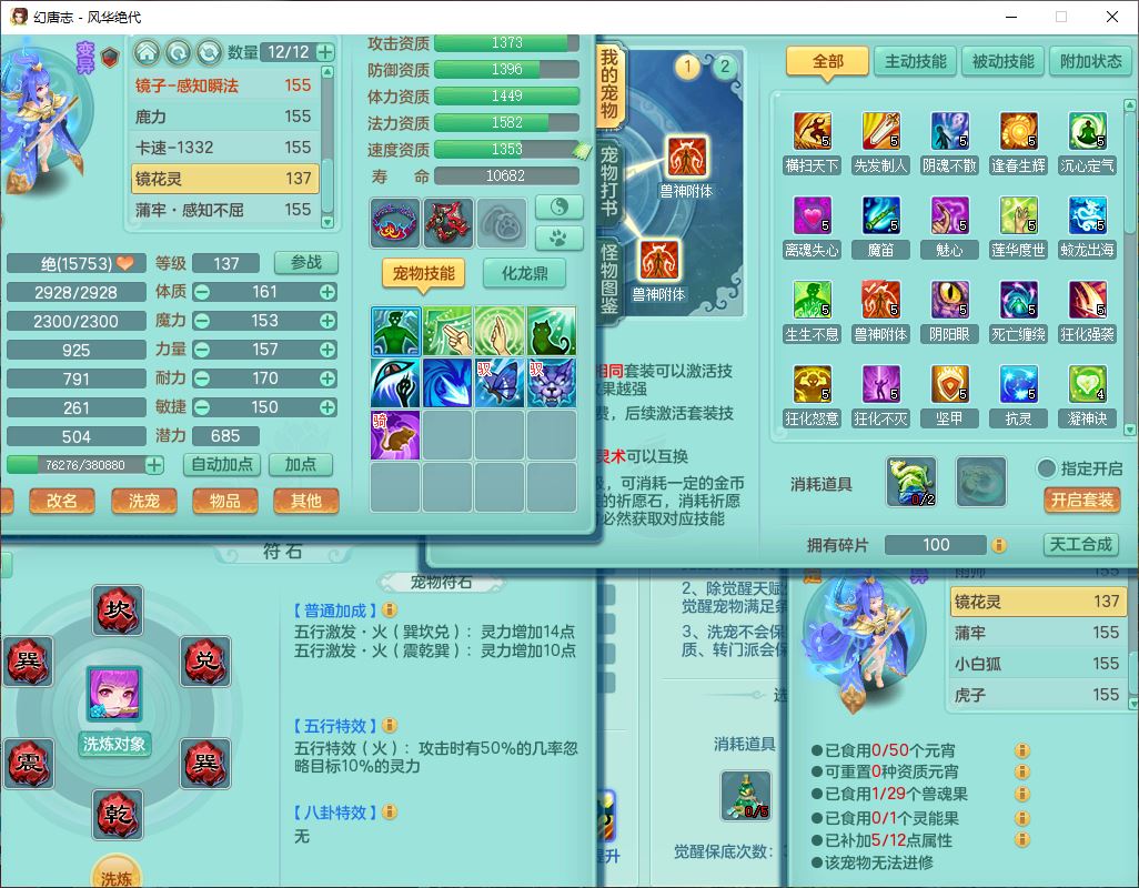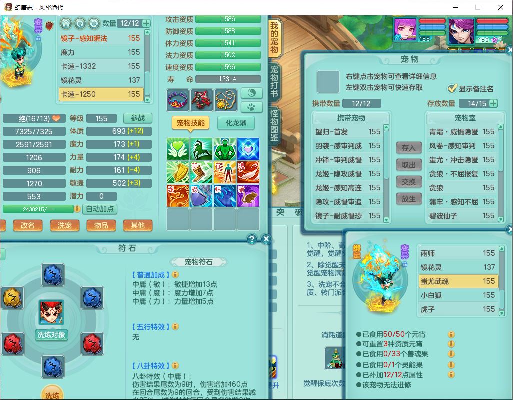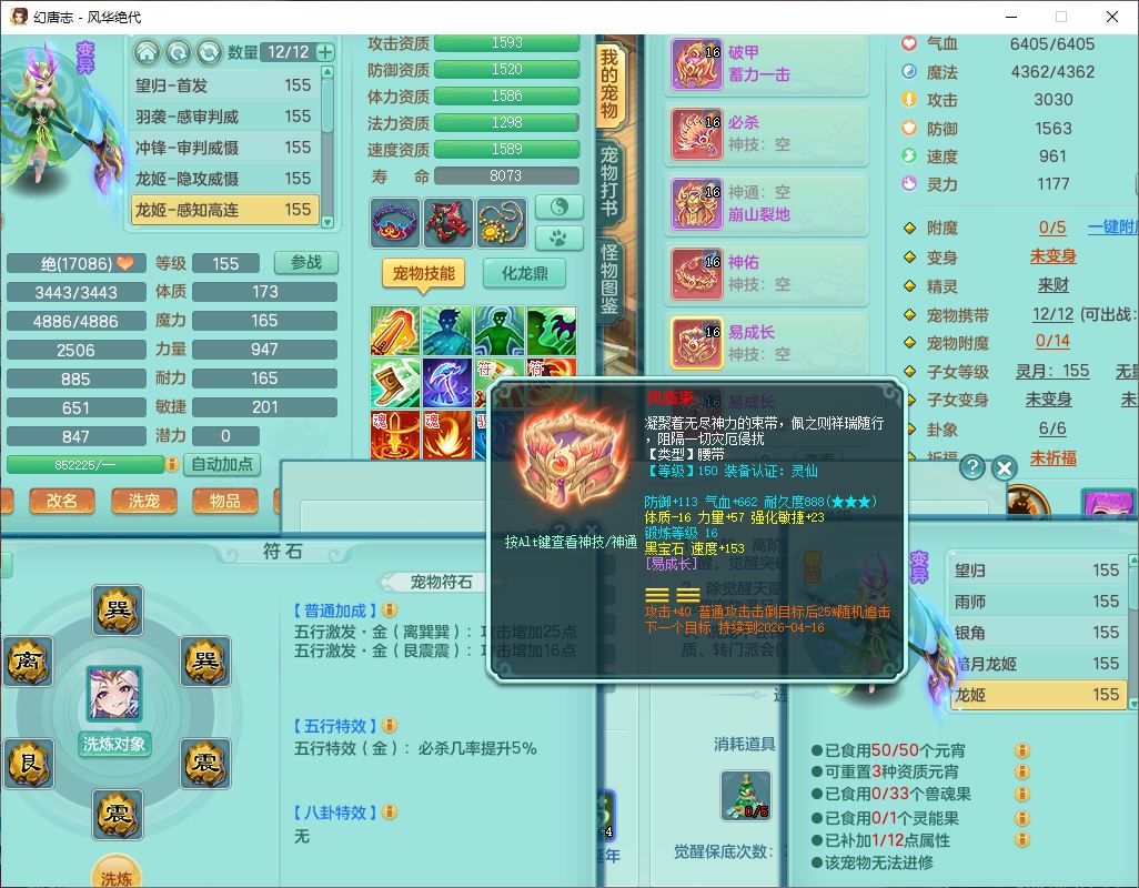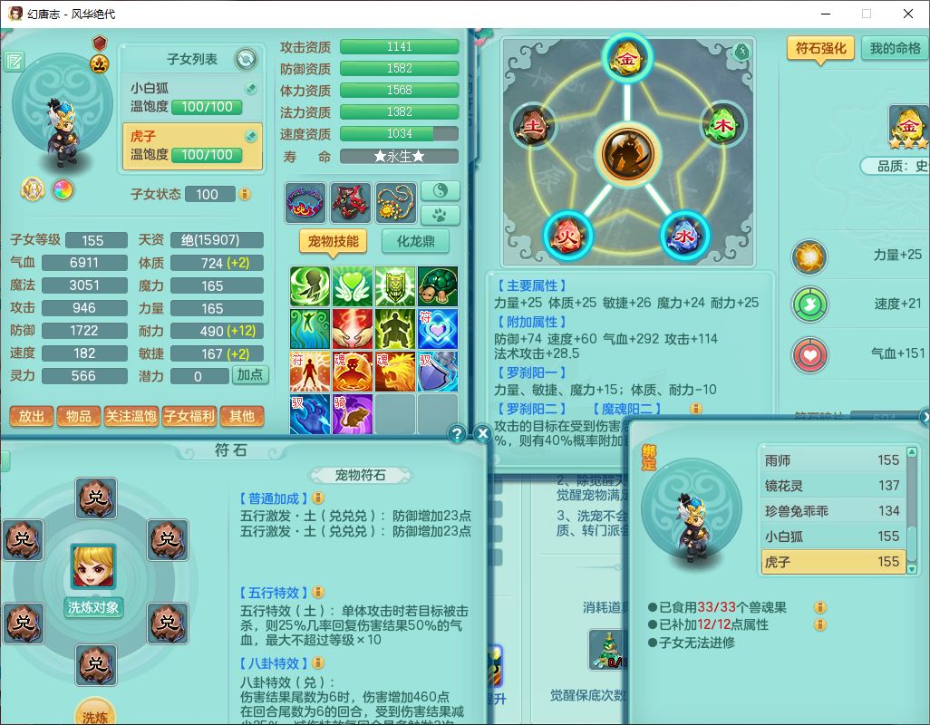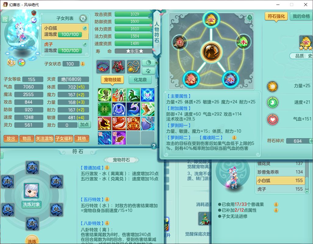 fh9611风华绝代159男万兽精灵舞,1神兽小马(无内)1望归3镜花1龙姬4特殊(羽袭、勇猛、堕天、灵傀),3觉醒6六字4四字综合6只满果子,全单加7红装备,破甲蓄力帽子,必杀武器,崩山衣服,鼎5.5,永久背饰、精灵皮肤,53个仙兽灵,17个内丹碎片,1洗练珠,2双人坐骑(1飞行),带150奶粉无量