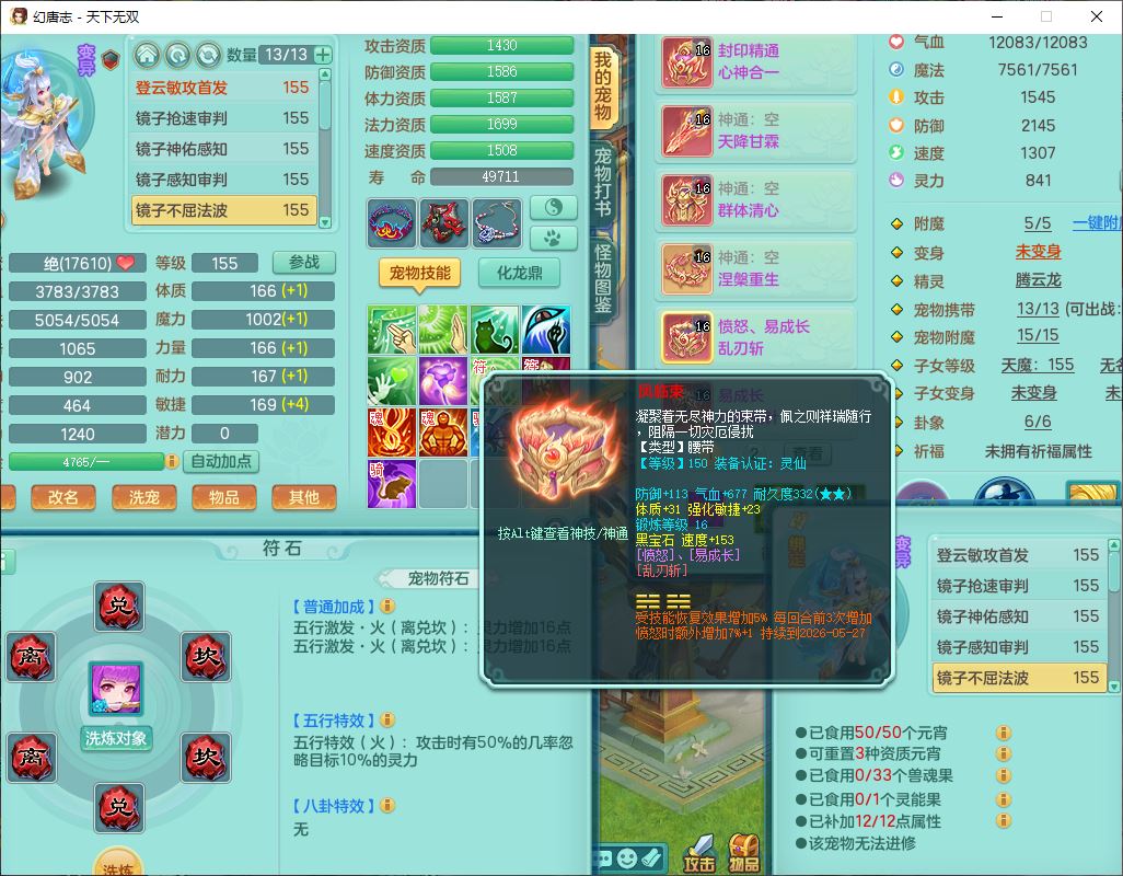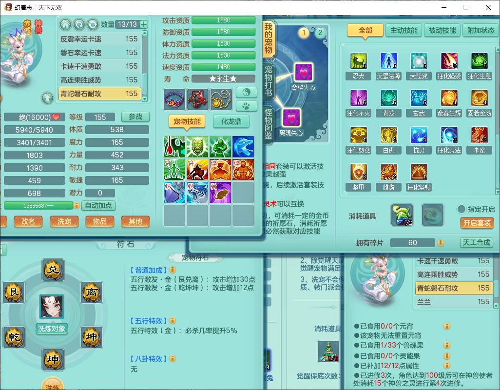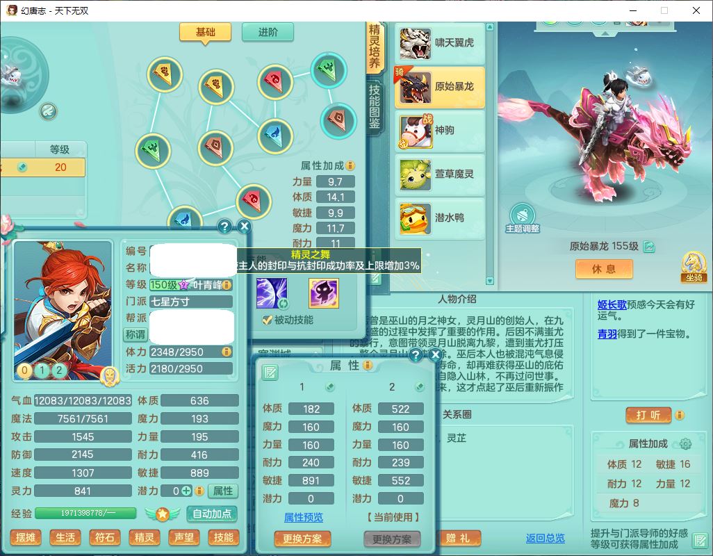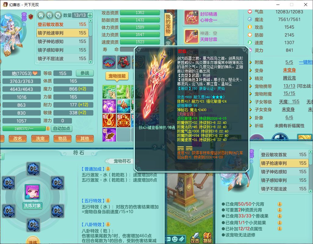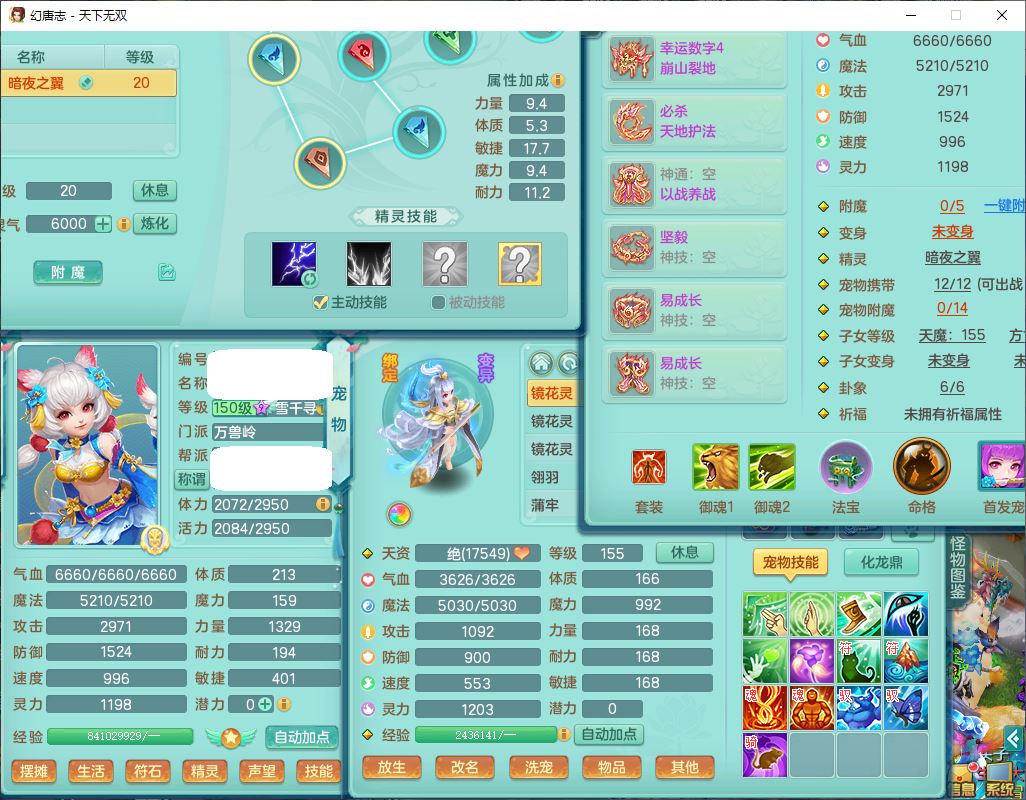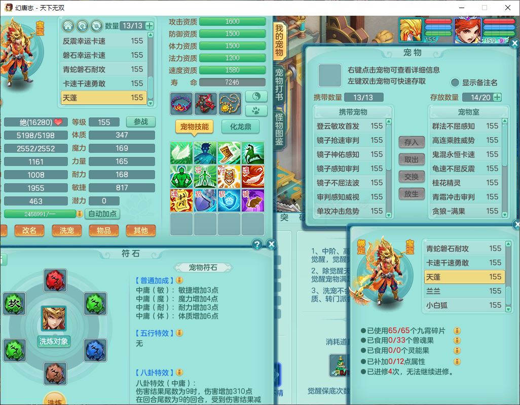 tx9724天下无双159男方寸【马上发财+暴龙洪荒+火焰之力+西瓜冰+潜龙过半】精灵舞,1青蛇(无内)1望归4镜花,7觉醒15六字1五字2四字18只满果子,10红装备,封印精通心神帽子,愤怒Y乱刃腰带,Y笑里鞋子,鼎5.5+70,133天月卡,庭院187房屋161,永久外观、精灵皮肤,11个仙兽灵,42个内丹碎片,1双人飞行坐骑,带159女天宫精灵怒,10红装备,318W神武币;159女万兽3镜花8红装备,287W神武币,1特殊兽决虎虎