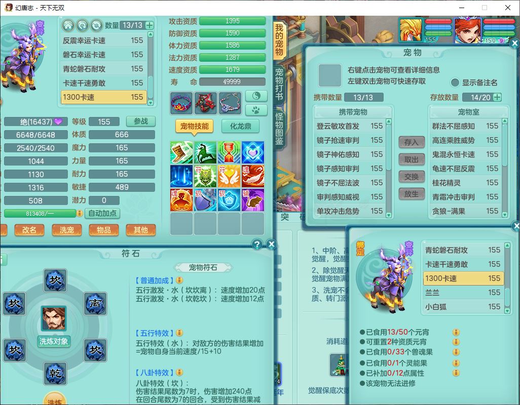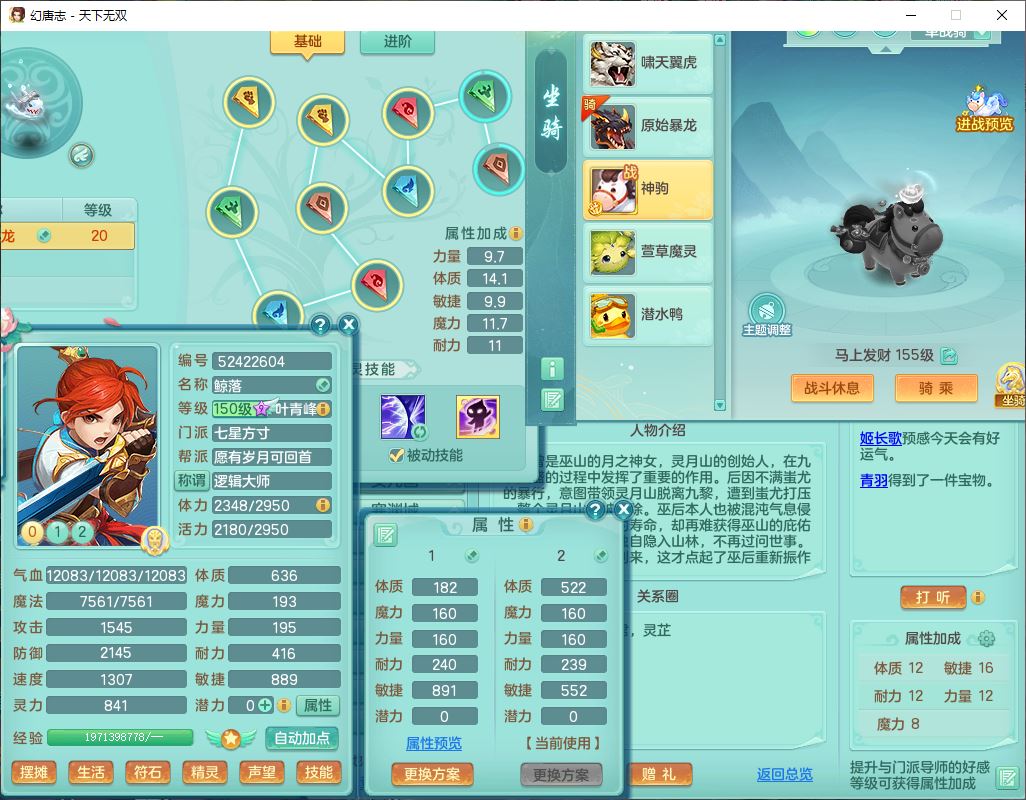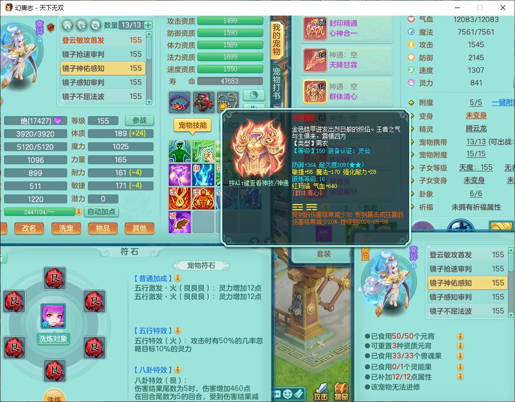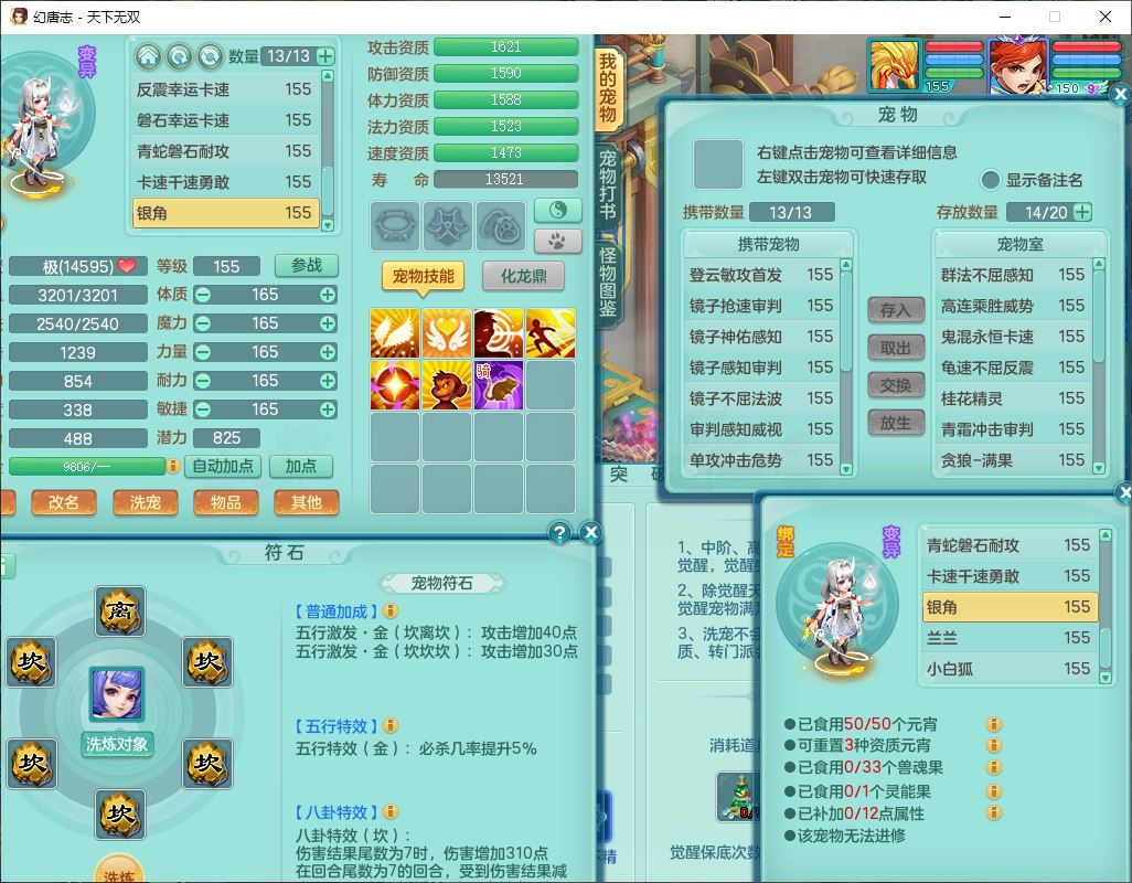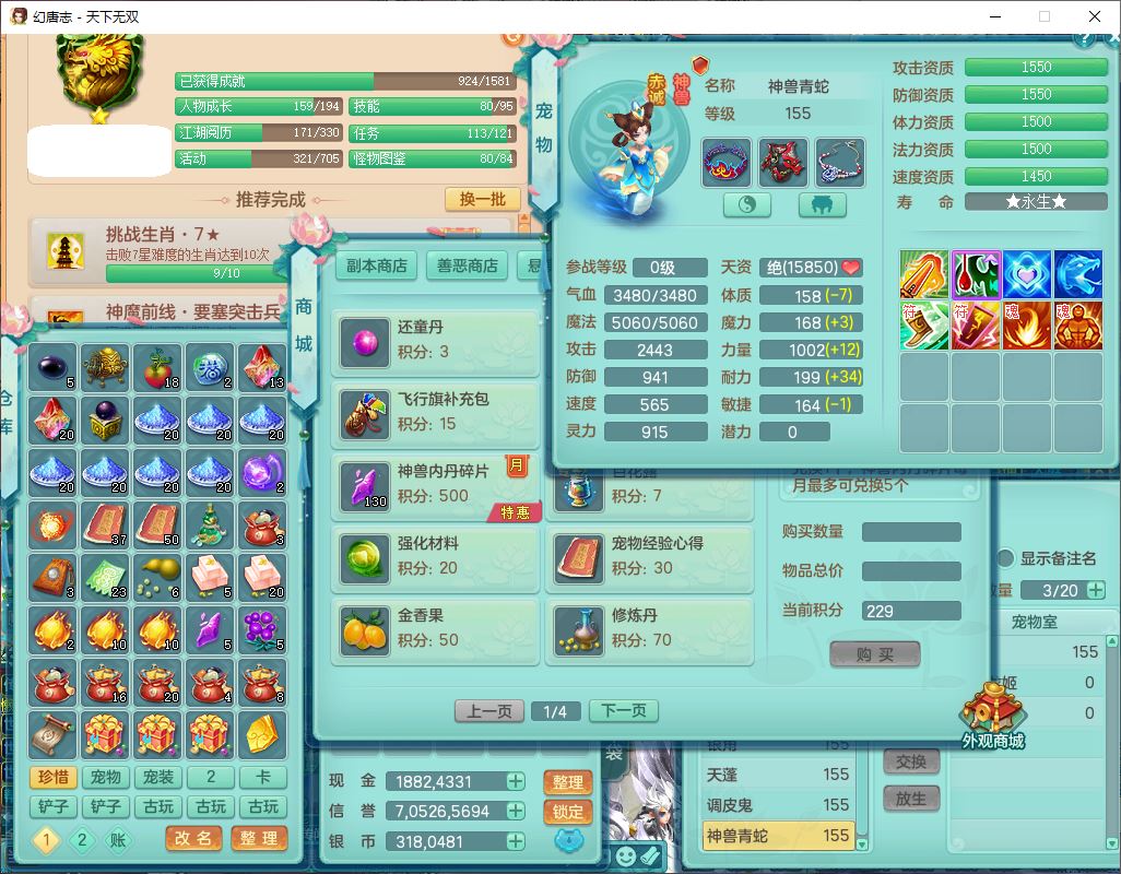 tx9724天下无双159男方寸【马上发财+暴龙洪荒+火焰之力+西瓜冰+潜龙过半】精灵舞,1青蛇(无内)1望归4镜花,7觉醒15六字1五字2四字18只满果子,10红装备,封印精通心神帽子,愤怒Y乱刃腰带,Y笑里鞋子,鼎5.5+70,133天月卡,庭院187房屋161,永久外观、精灵皮肤,11个仙兽灵,42个内丹碎片,1双人飞行坐骑,带159女天宫精灵怒,10红装备,318W神武币;159女万兽3镜花8红装备,287W神武币,1特殊兽决虎虎