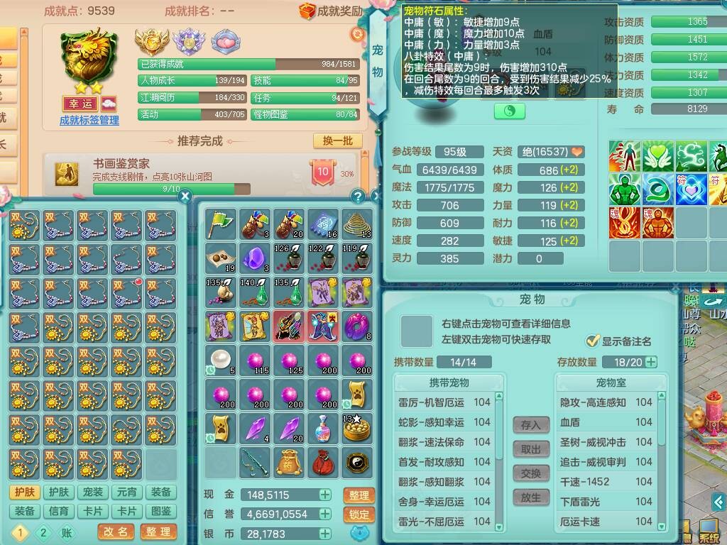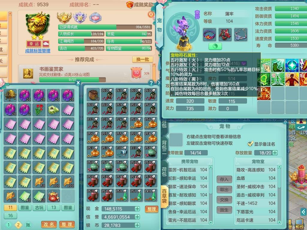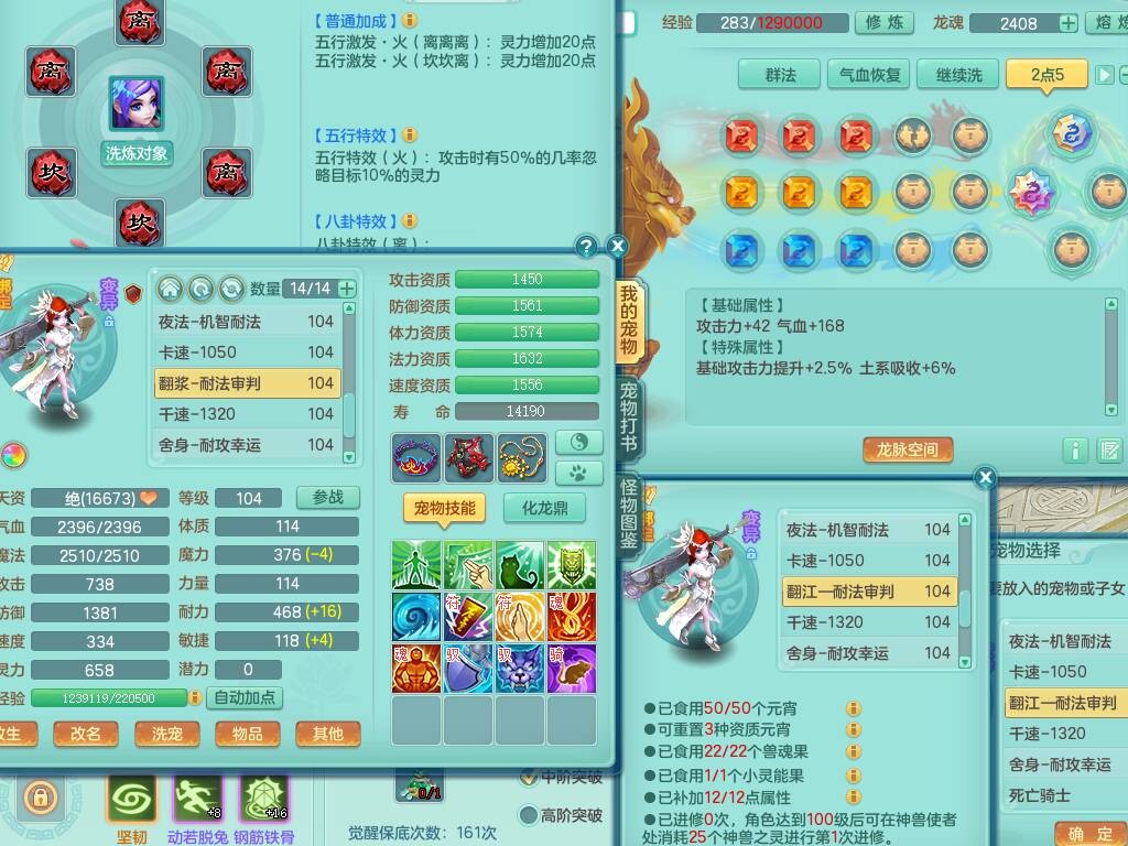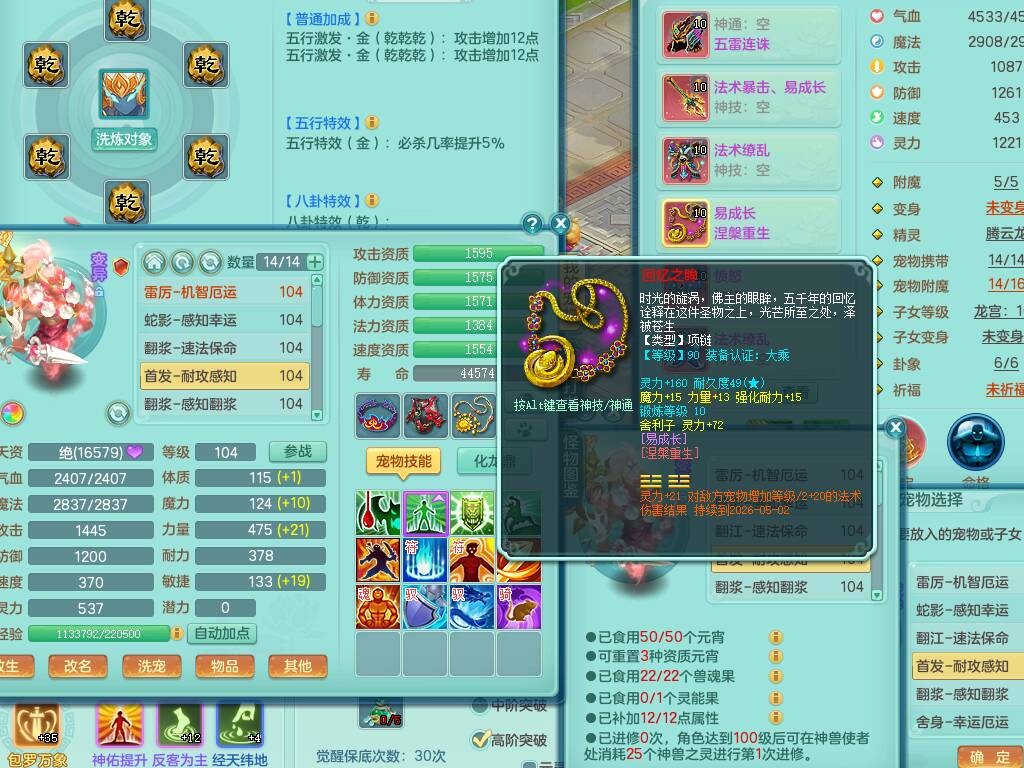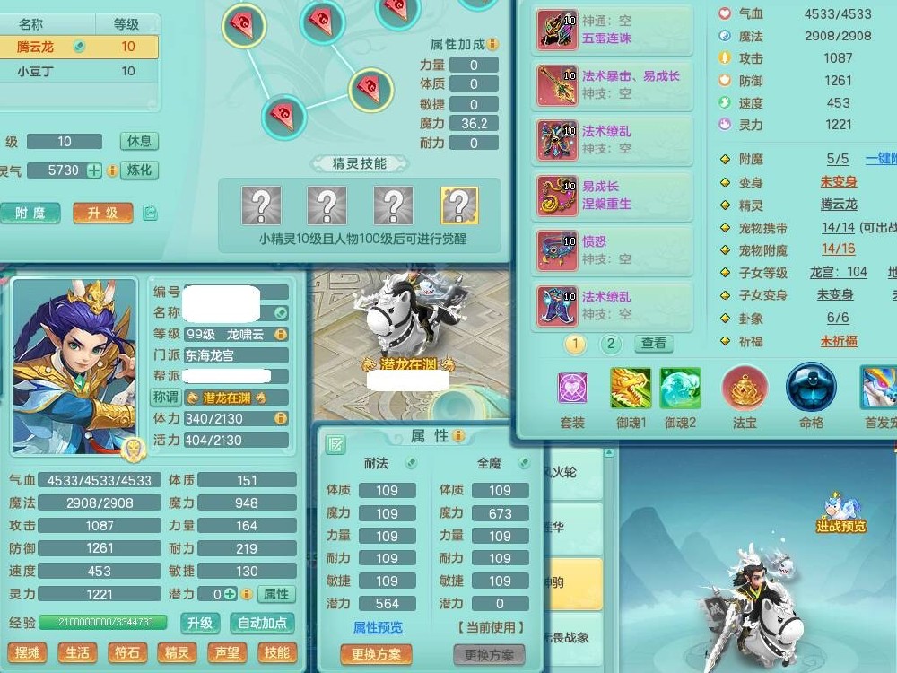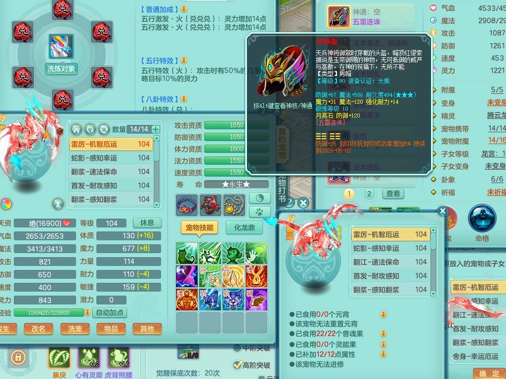 hh9772花好月圆99男龙宫,1龙1内胆神,【9只觉醒,已潜龙】,2宠皮,法爆易成长单加32武器,五雷单加31头,双法缭,法缭单加34衣服,法缭单加30鞋子,160易成长慈航项链,物理553易成长单加34武器,破甲单加32鞋子,破甲罗汉鞋子,迅捷破血单加34鞋子,2.5基础鼎+42攻+168血,9个纯六字,2个五字,20只满果子,仓库还有22个果子,34神兽内胆碎片,宠排在榜,神驹马到成功+火焰之力武器皮肤,带96天月卡