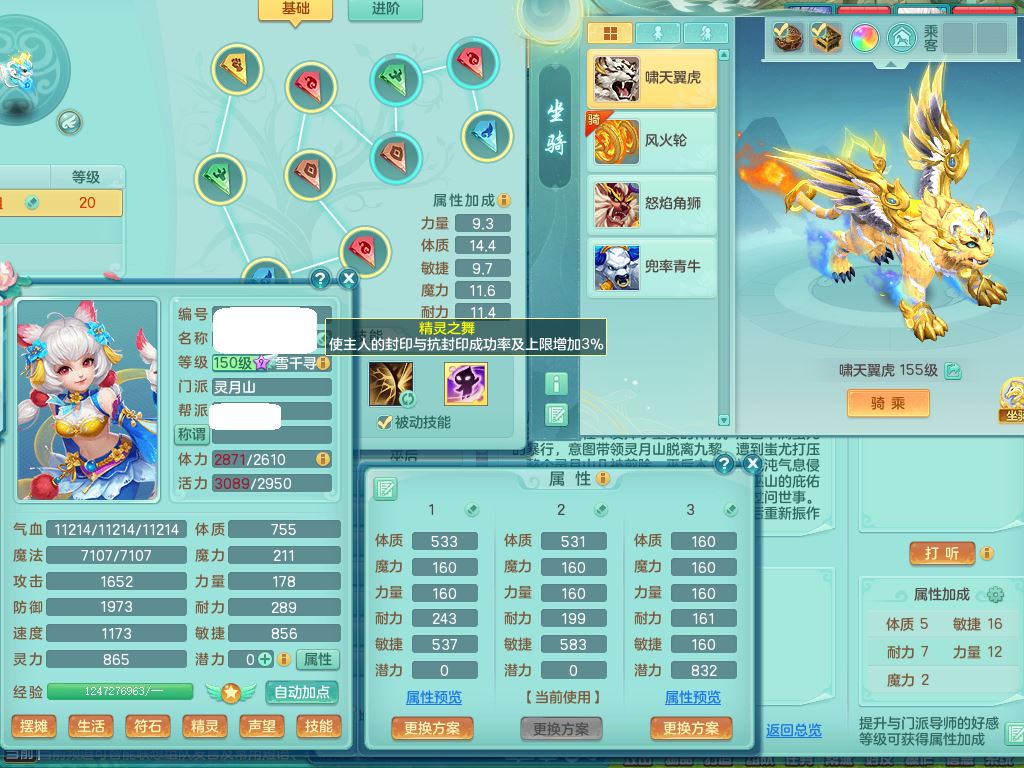 tx9770天下无双159女灵月精灵舞,满级共鸣,1内丹青蛇1特殊(舍身)2觉醒2个4字,2镜花灵(1胚子)1龙姬,愤怒5特,鼎4.5,20天月卡,永久头饰,带150奶粉盘丝
