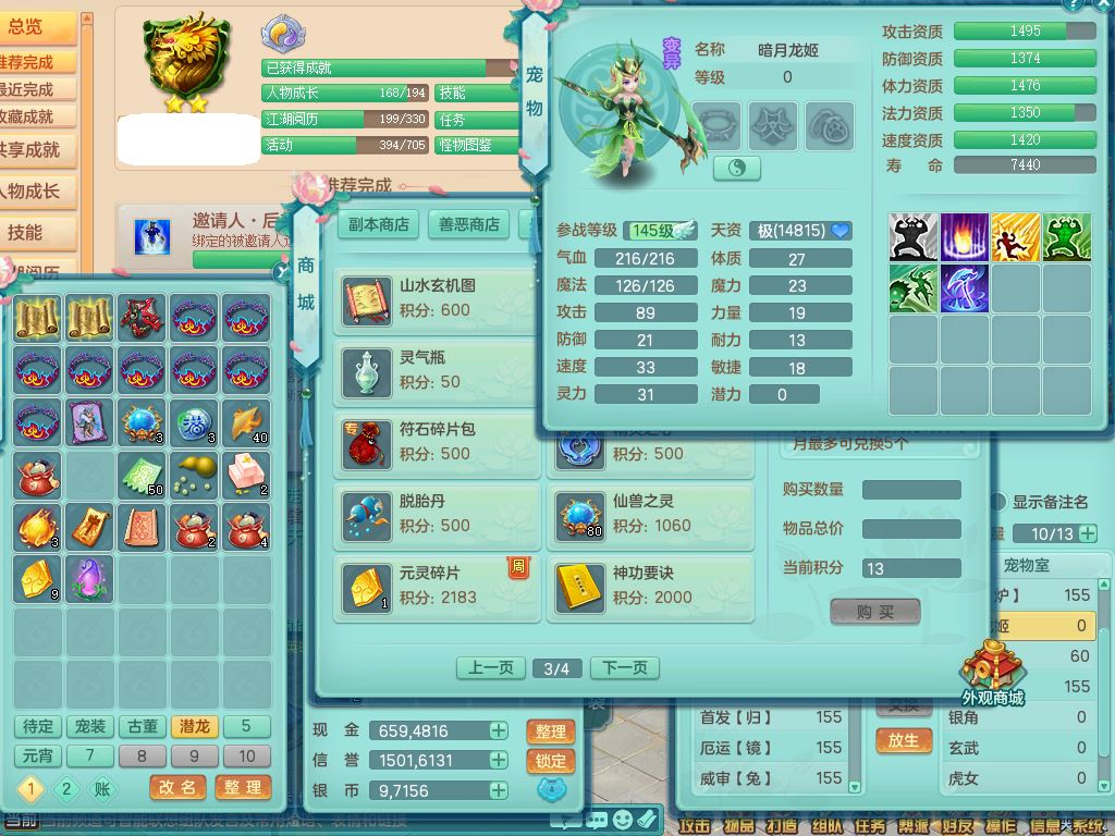 24-9781,2024区159男万兽【暴龙洪荒】1内丹龙马3镜花灵,5只满果子4觉醒4个6字,8红双破甲星辰之拥,狂暴心神武器,破甲崩山鞋,鼎4.5+70,104天月卡,精灵皮肤,2只双人坐骑,带154佛门精灵舞,单加回春武器,单加Y流云鞋,3镜花灵