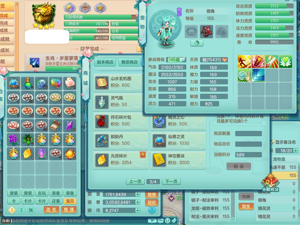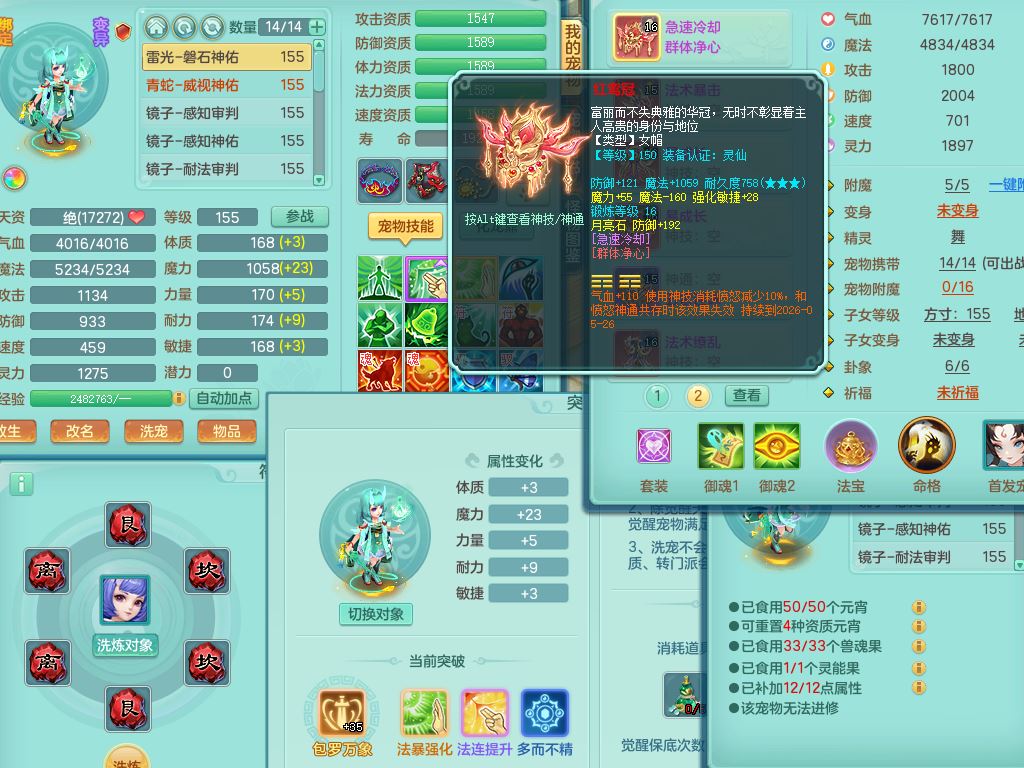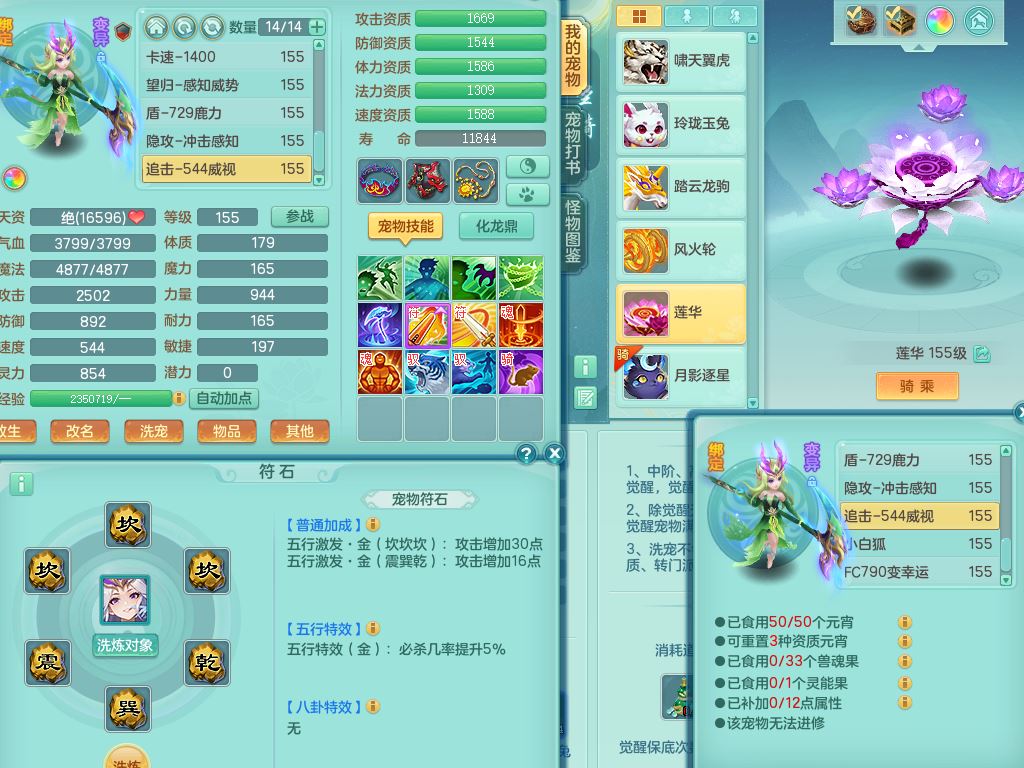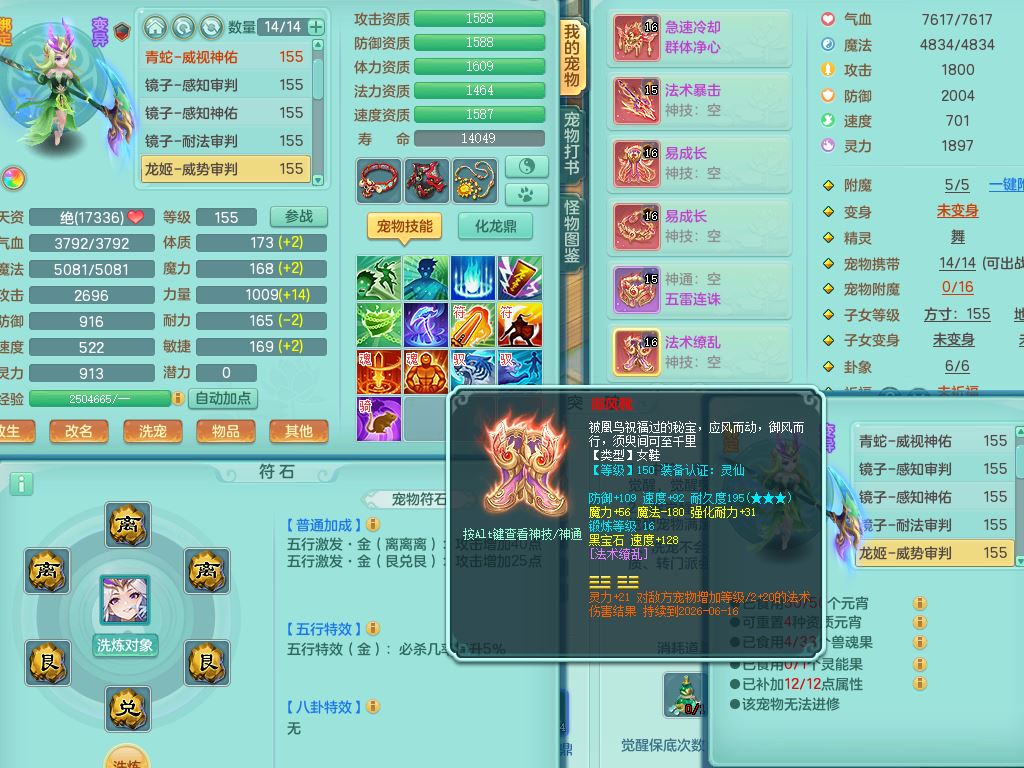 jt9809九天揽月159女天宫精灵歌+舞,4字靓号,6龙(换,无内)4内1破境,3特殊(雷光/兽决破碎/墨守)3镜花灵2龙姬,18只满果子5觉醒4个纯6字,单加急速晶清头,单加要衣服,274Y项链,五雷腰带,单加法缭鞋,鼎5.5+70+280,2套符石,104天月卡,永久外观精灵皮肤,宠排在榜,5坐骑(3只双人)