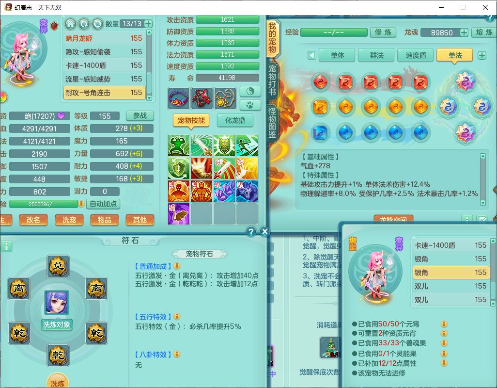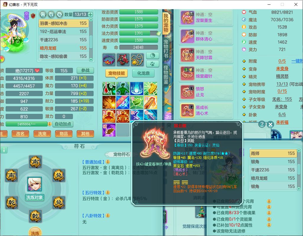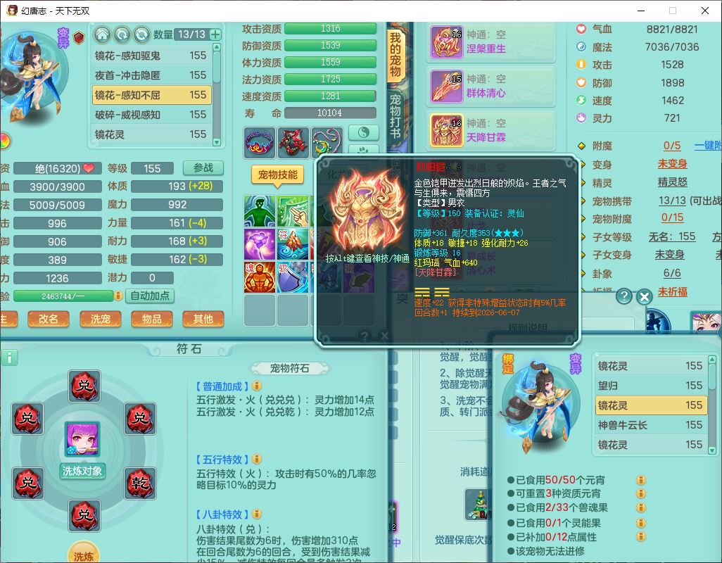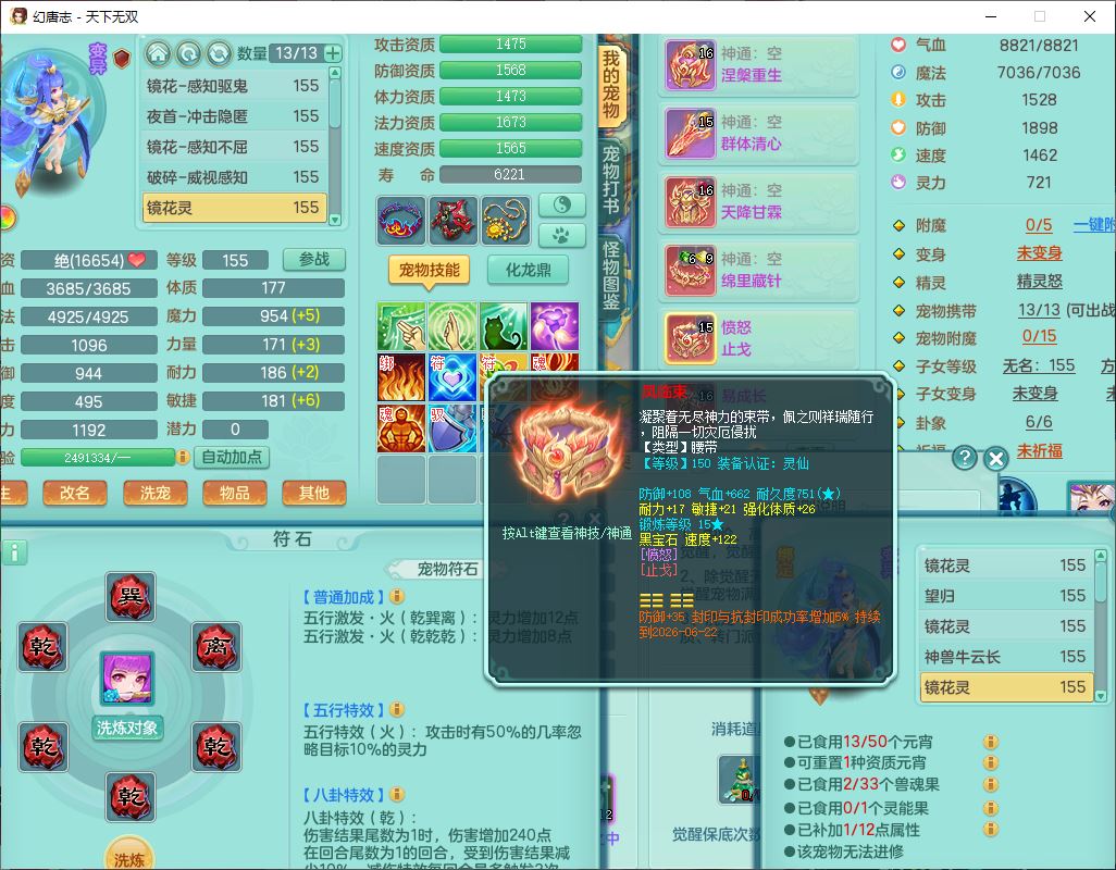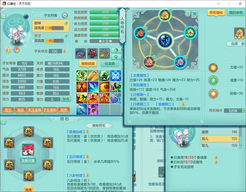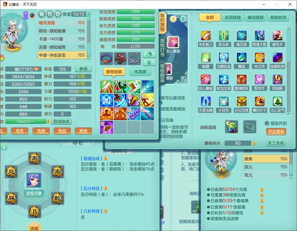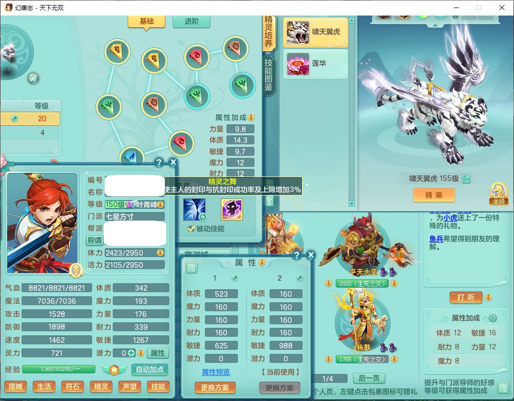 tx9749天下无双夫妻号159男方寸精灵舞,1内1望归3镜花5特殊(羽袭、流星、战争、堕天、虎虎),3觉醒7五字5四字综合7只满果子,8红装备,愤怒止戈腰带,Y水清鞋子,Y卸甲鞋子,鼎4.5,2套符石,庭院157,永久外观、精灵皮肤,720W神武币,12个仙兽灵,1双人飞行坐骑;159女无量精灵歌,1内1望归1龙姬4镜花3特殊(勇猛、焚心、荒古),3觉醒1六字2五字5四字,7红装备,Y玉清项链,有物理装,917单加必杀武器,神佑项链,鼎5.5,251W神武币,9个仙兽灵,1双人坐骑