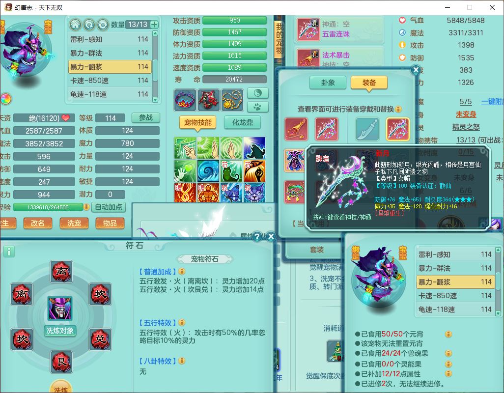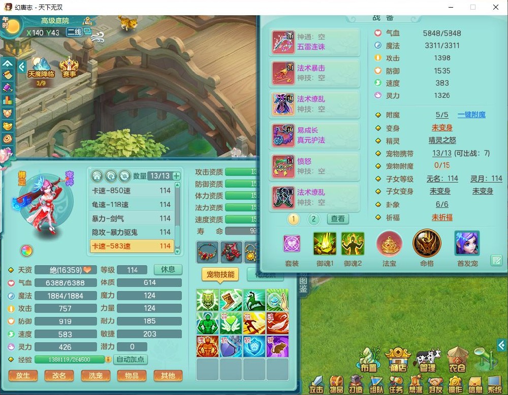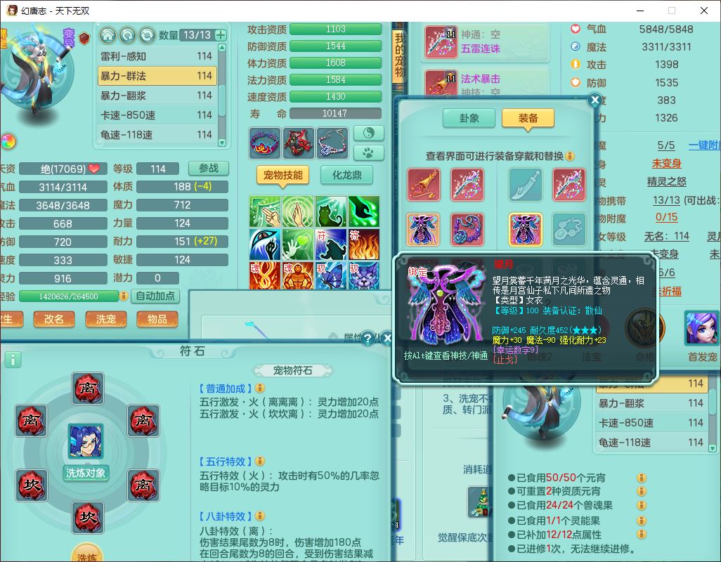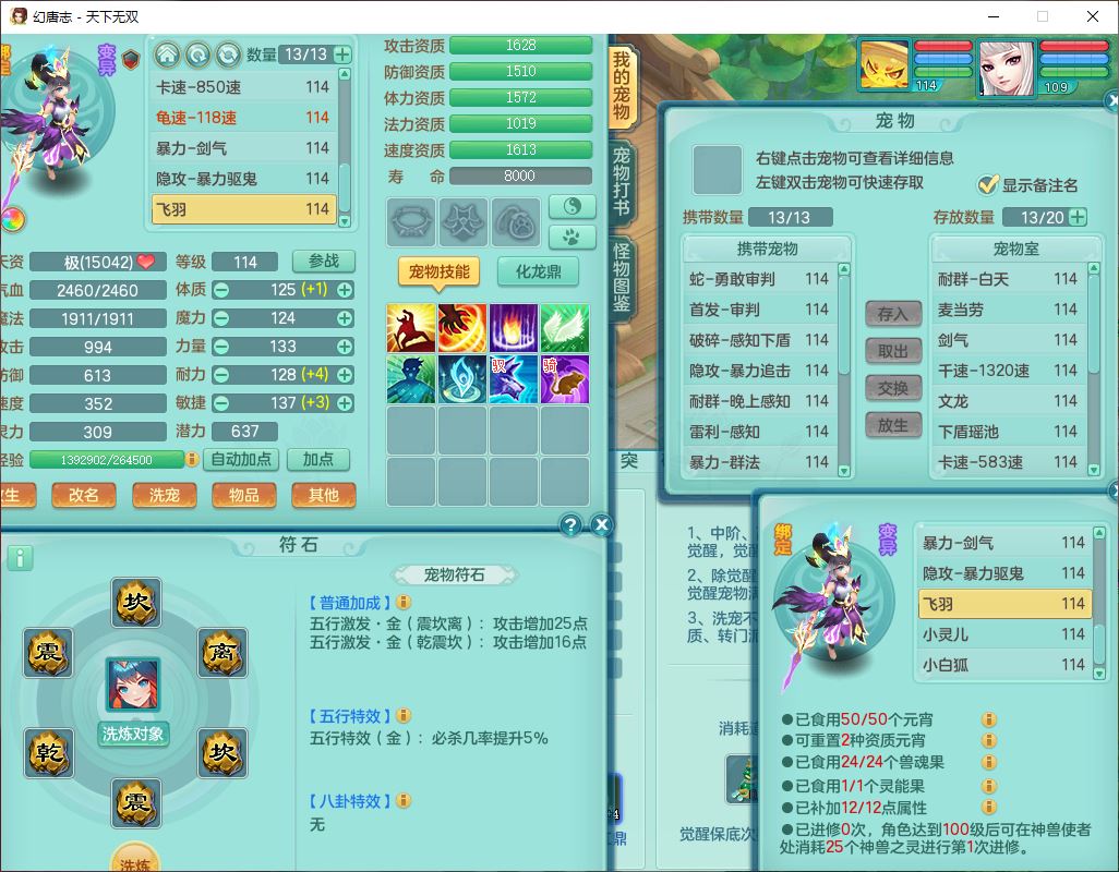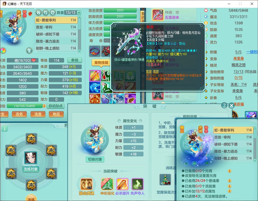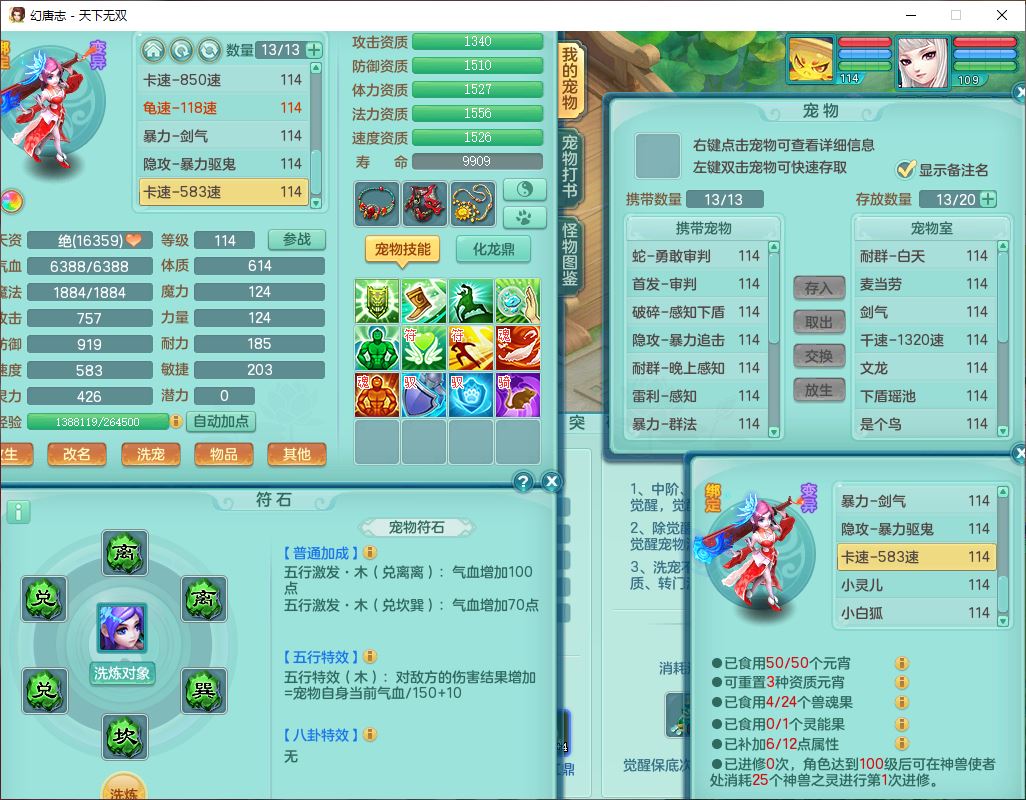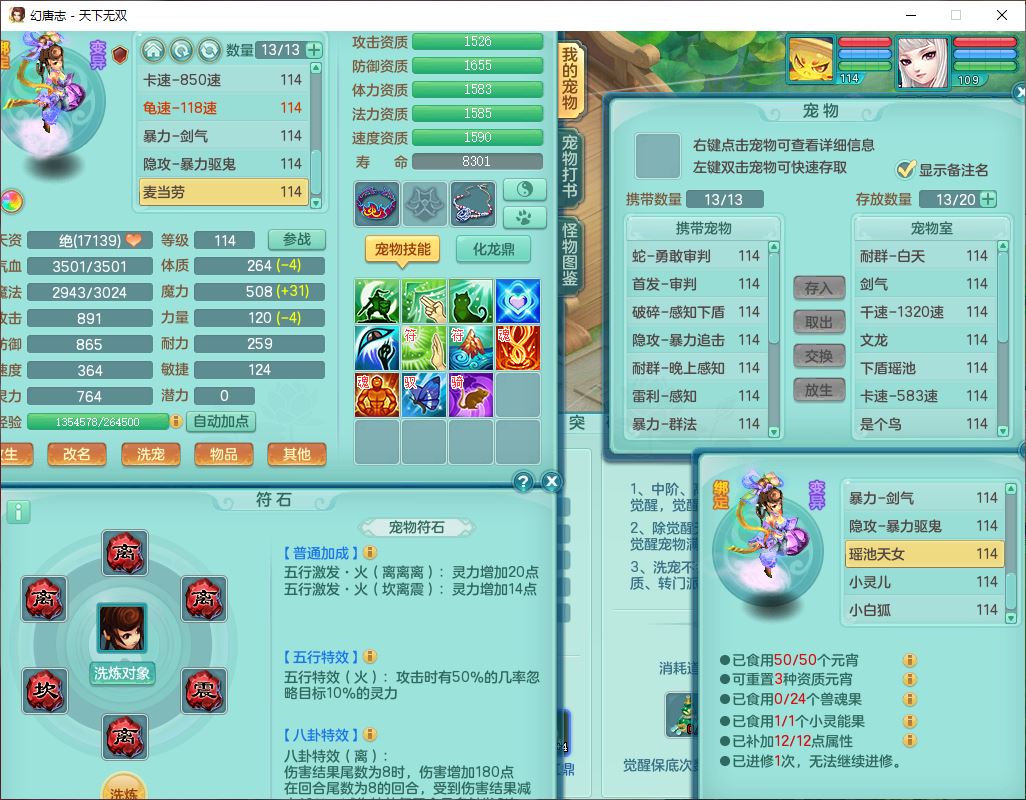 tx9810天下无双109女魔王【潜龙号】精灵歌,2内(1青蛇)1建木2雷利1六技能翻江妖鬼1金炉,7觉醒7六字2五字10四字20只满果子,7红双法缭装备,五雷帽子,法缭衣服、鞋子,Y真元项链,幸运止戈衣服,鼎2.5+42+168,2套符石,房屋155,永久外观、精灵皮肤,67个仙兽灵,1双人飞行坐骑,带两150奶粉