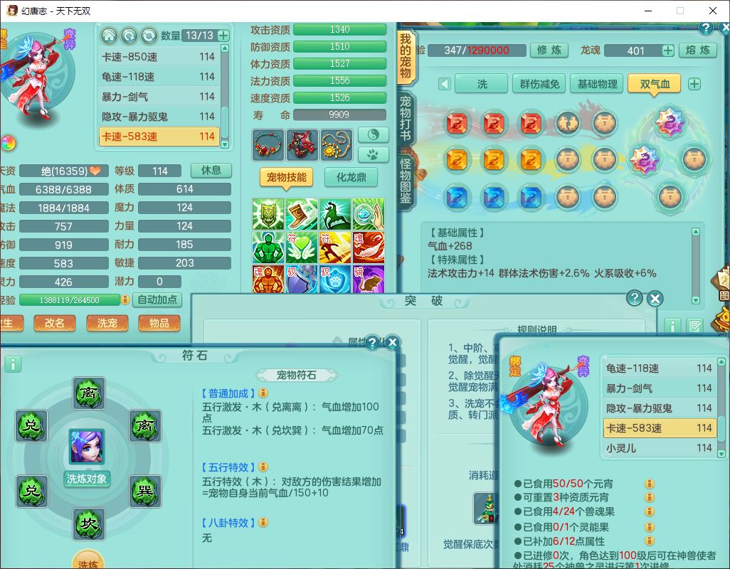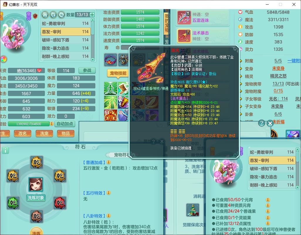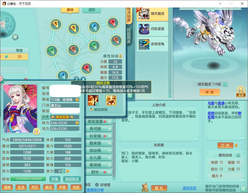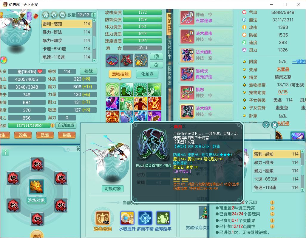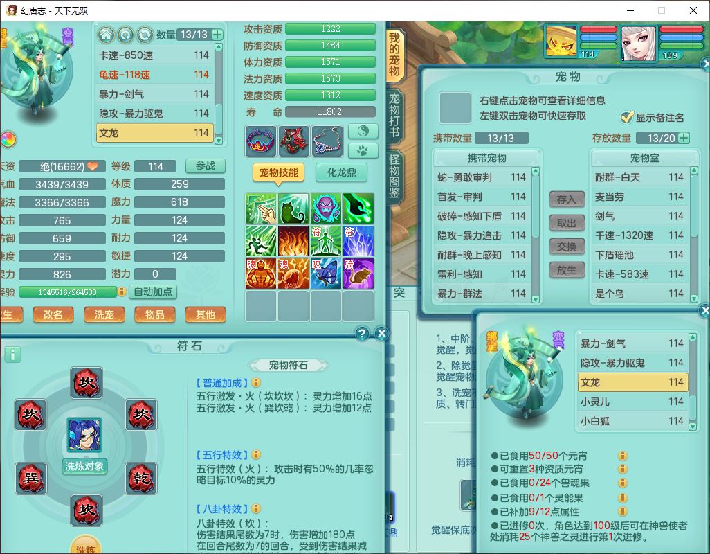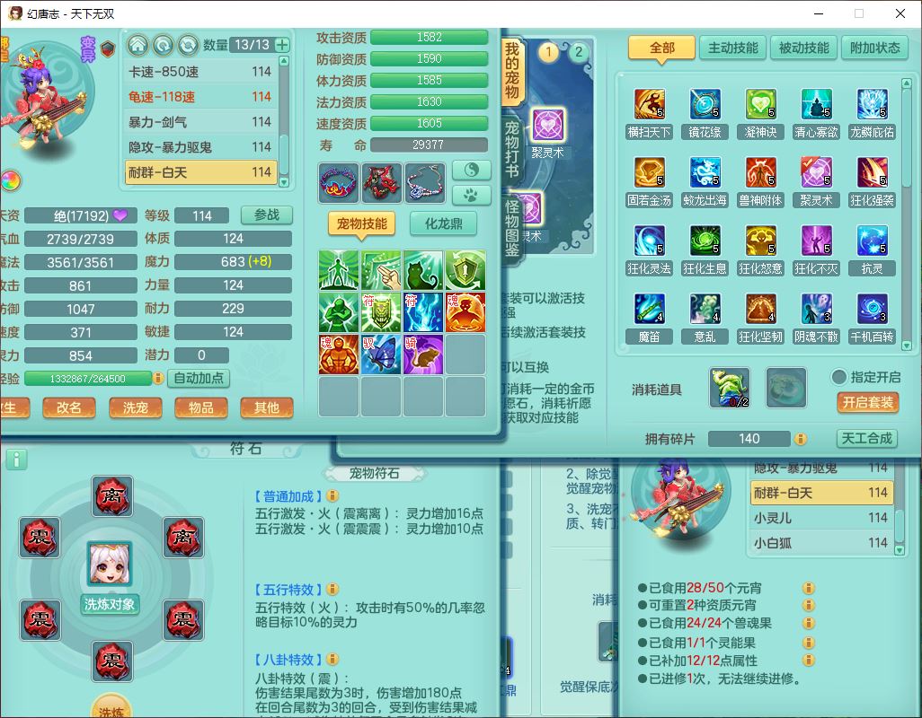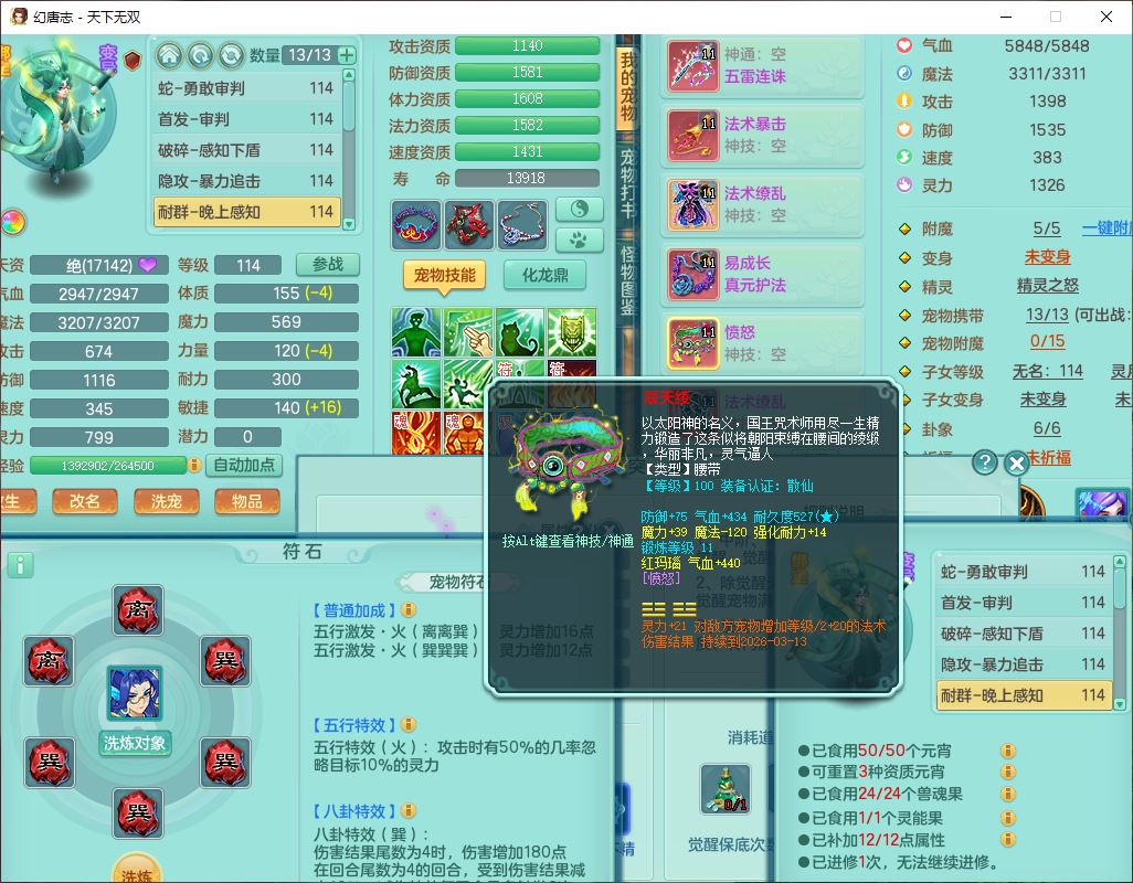 tx9810天下无双109女魔王【潜龙号】精灵歌,2内(1青蛇)1建木2雷利1六技能翻江妖鬼1金炉,7觉醒7六字2五字10四字20只满果子,7红双法缭装备,五雷帽子,法缭衣服、鞋子,Y真元项链,幸运止戈衣服,鼎2.5+42+168,2套符石,房屋155,永久外观、精灵皮肤,67个仙兽灵,1双人飞行坐骑,带两150奶粉
