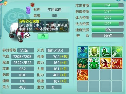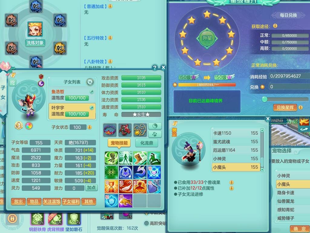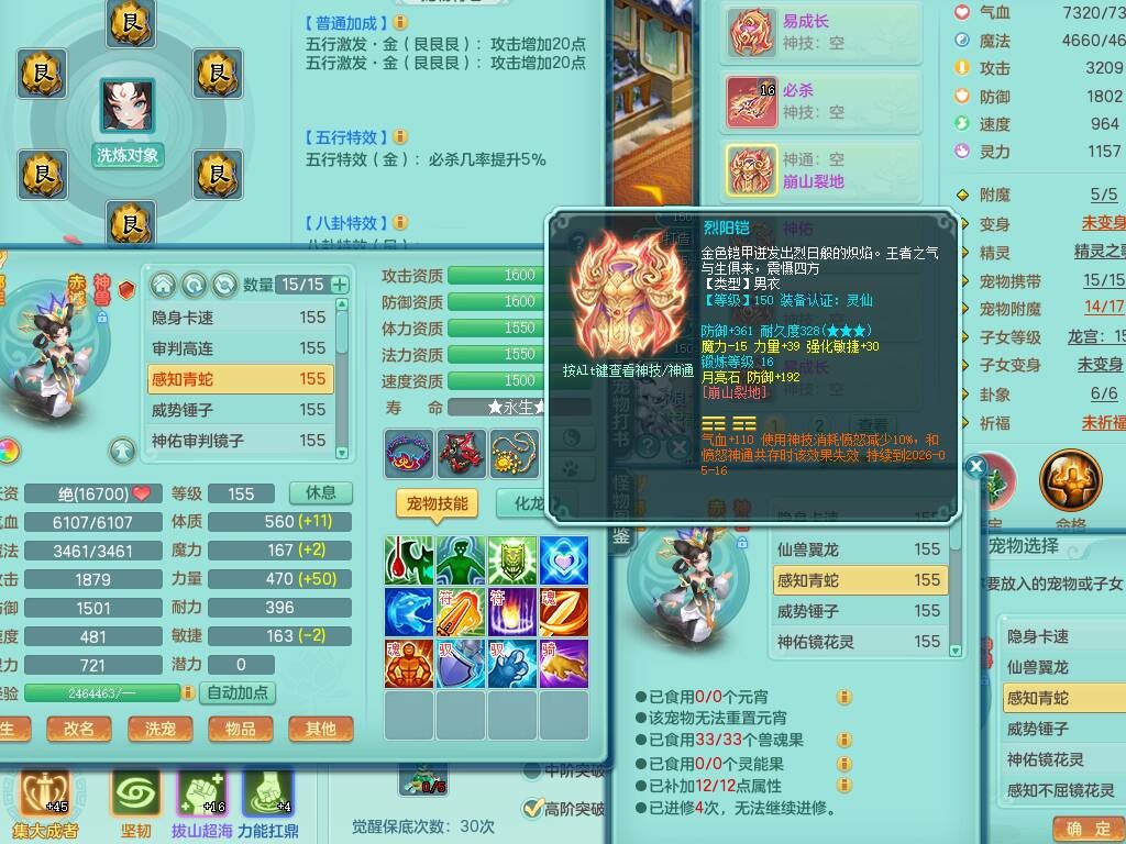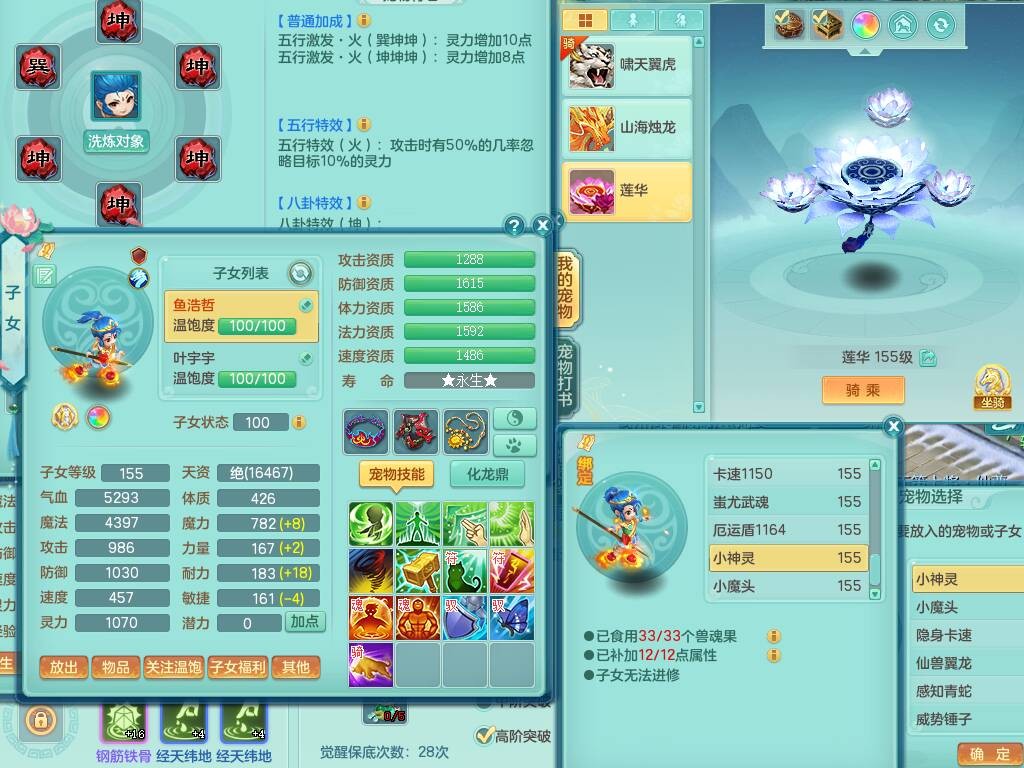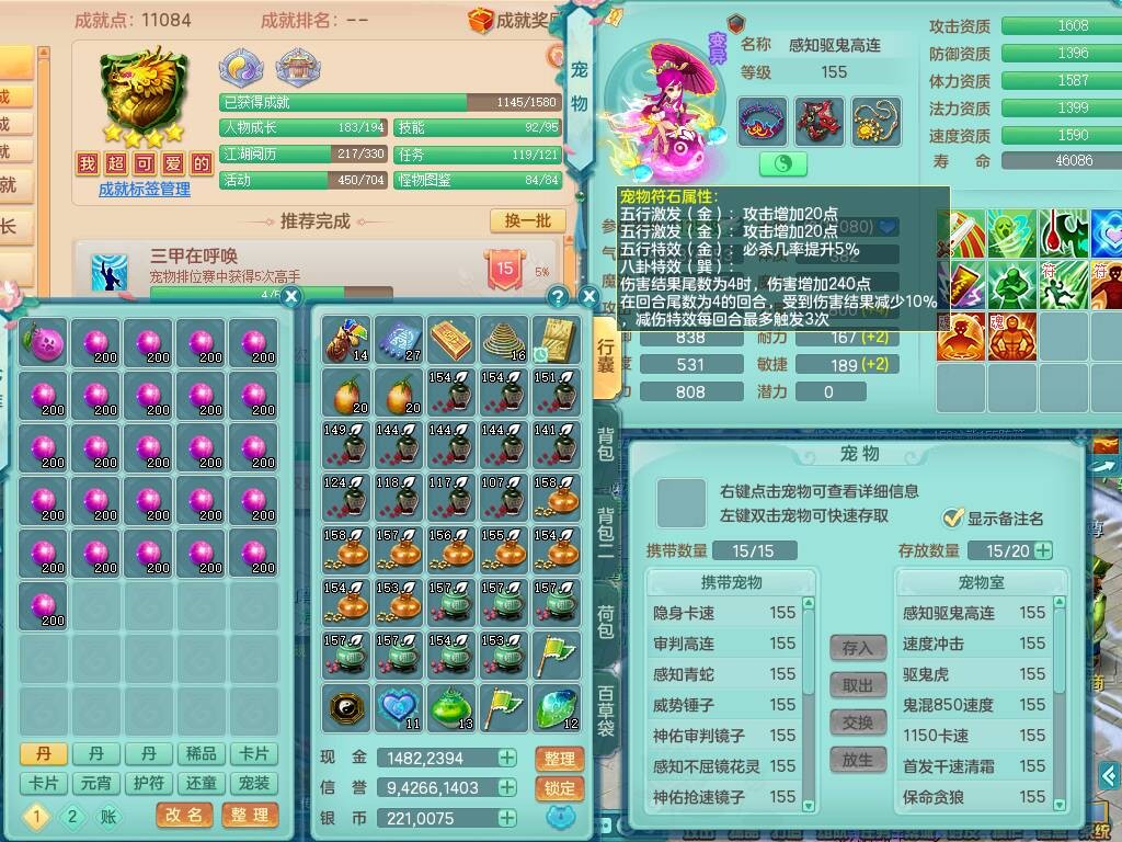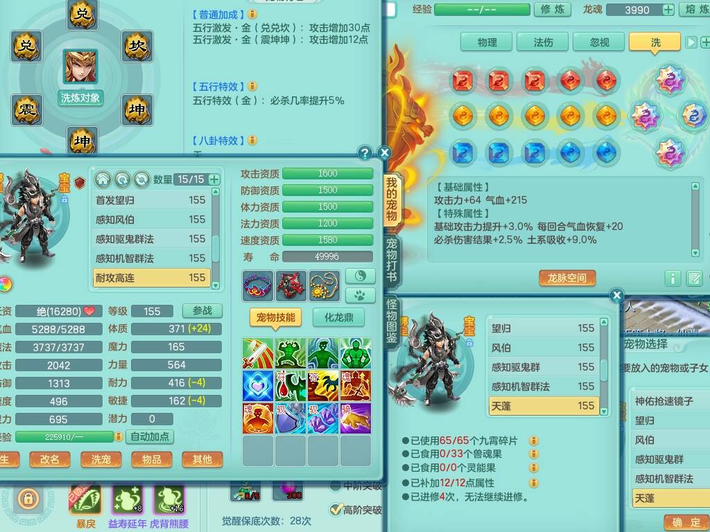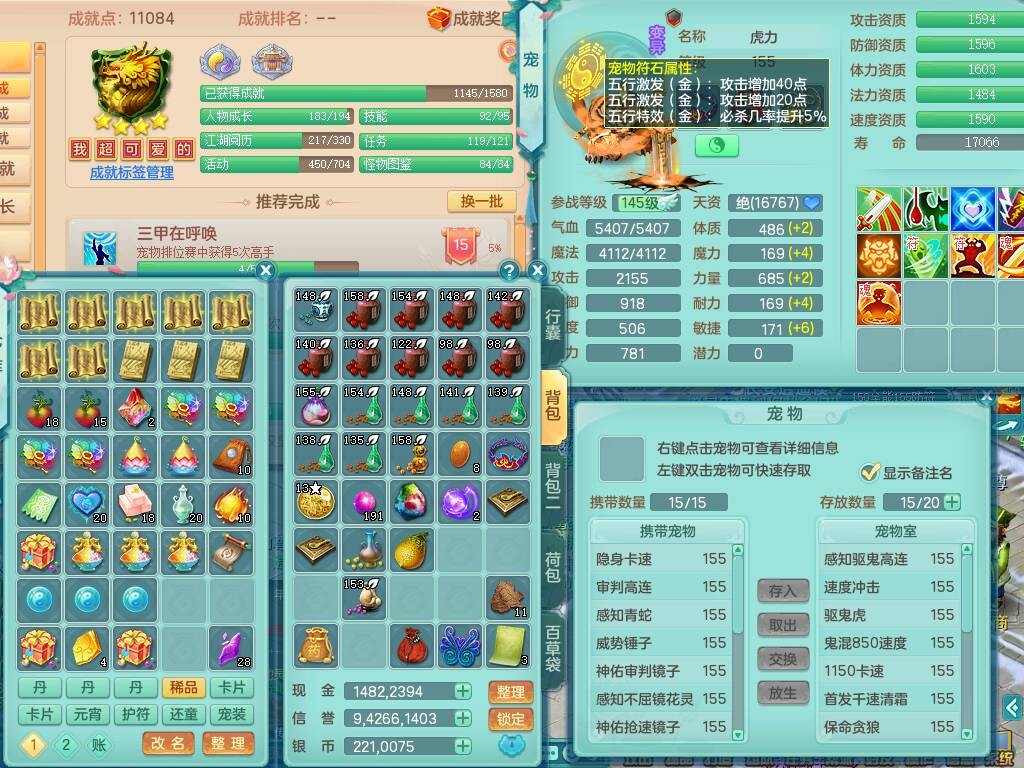 fh9838风华绝代159男万兽精灵舞,2龙(1龙无内),1内胆神,7只觉醒(潜龙条件化龙鼎差5个厚土龙纹,符石差2个附加属性,宠物6只满足),4特殊(雷厉,以战,号角,锤子),2只6技能镜花灵,930单加必杀武器,崩山单加衣服,5.5基础鼎+70攻,差1240积分14个格子,7个纯六字,15只满果子,宠排在榜,带二百多万银币,2只坐骑