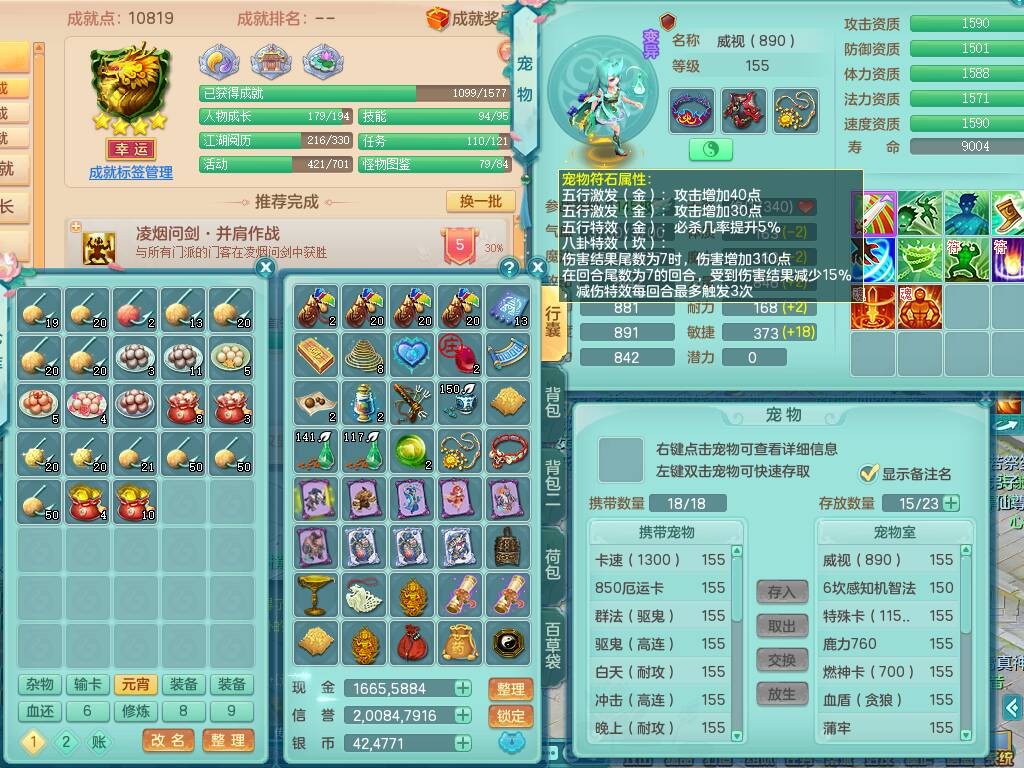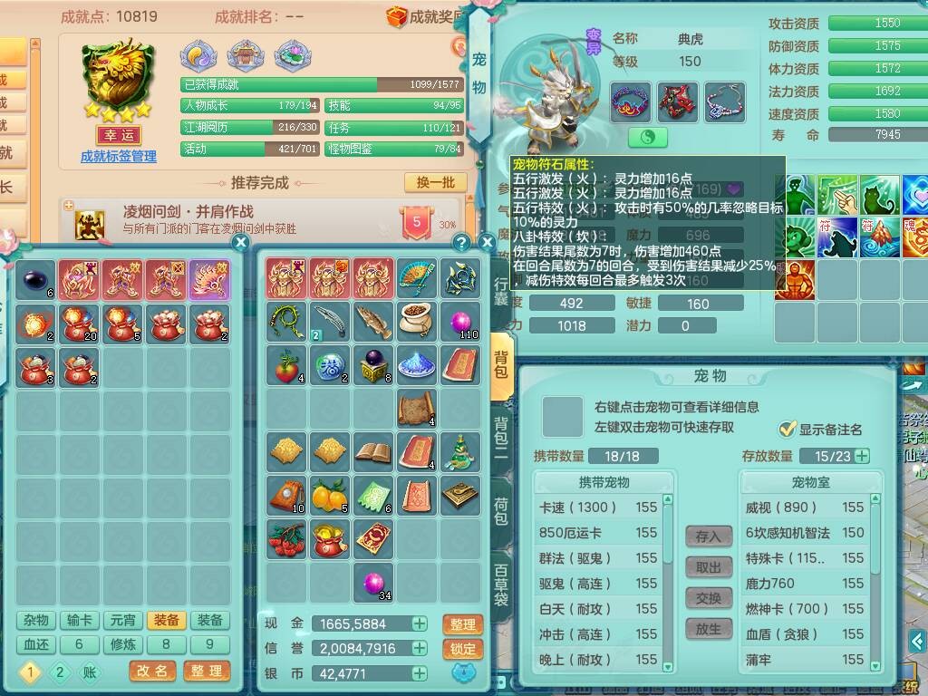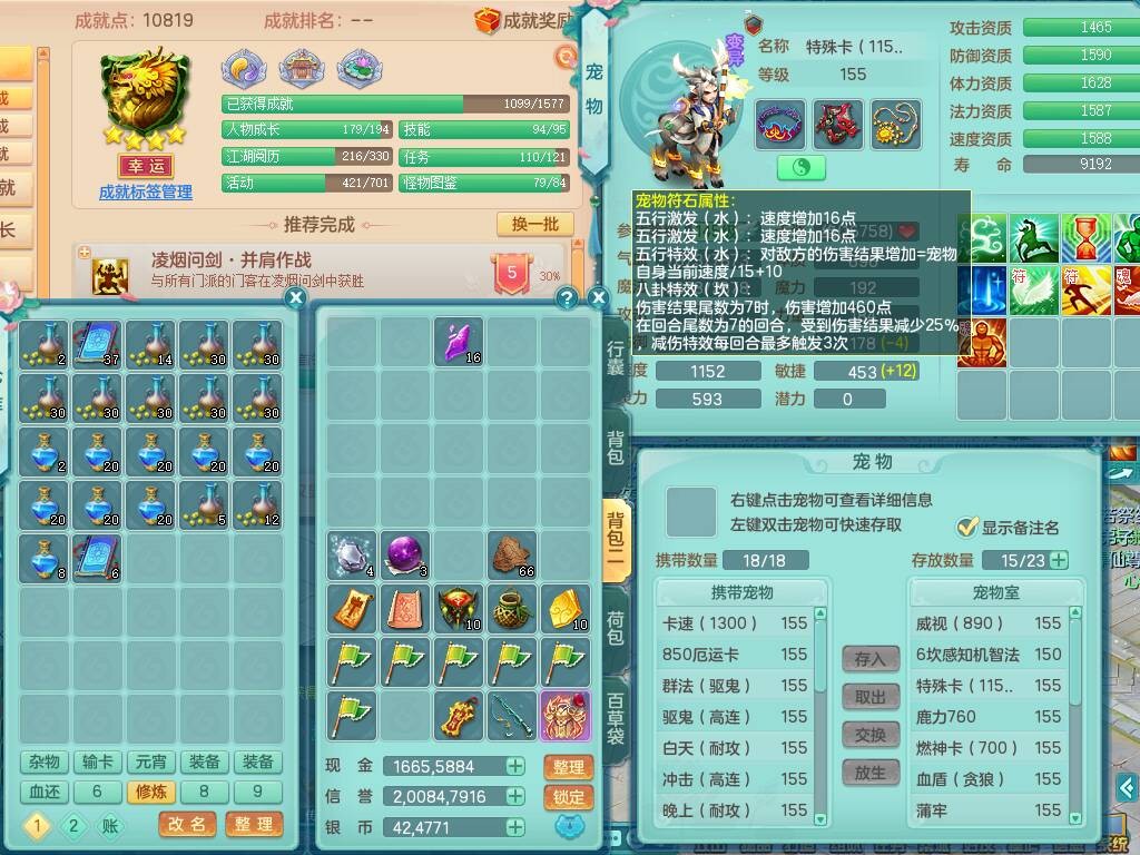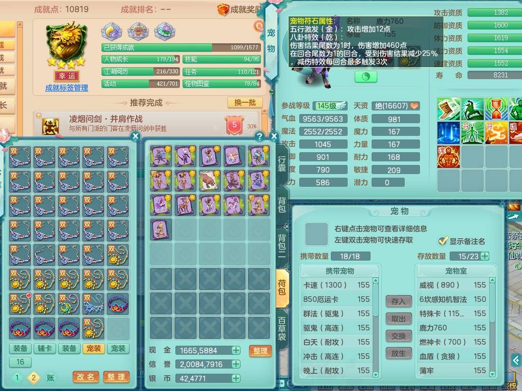 rj9865任剑逍遥159男天策精灵歌,9内胆龙,3内胆神+1神兽内丹,11只觉醒(准潜龙,只差4个主要属性),6宠皮+1幻灵果,8位靓号,3只6技能镜花灵,1只6技能龙姬,崩山单加55头,神佑法术反制单加55链子,易成长单加50腰带,5.5基础鼎+70攻,280血,物理躲避10%,15个格子,28个纯六字,4个5字,25只满果子,家里仓库BB还有6只满果子,宠排在榜,6只坐骑+西瓜冰武器+火焰之力,月卡还有179天。带2个159奶粉