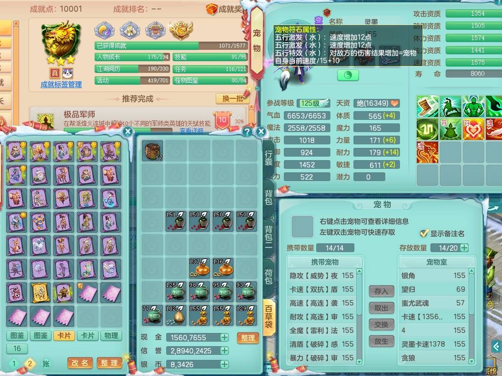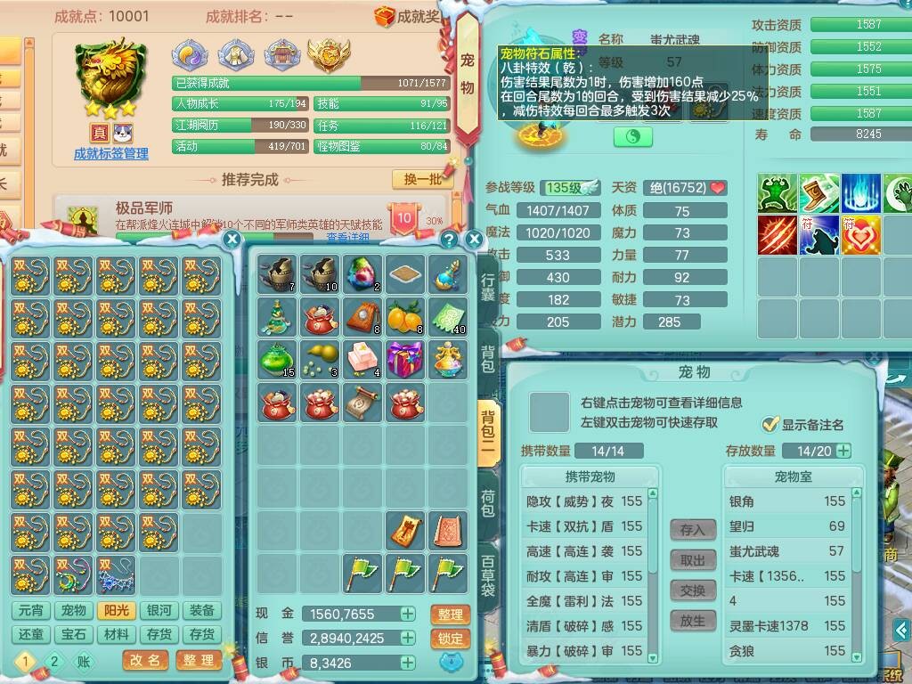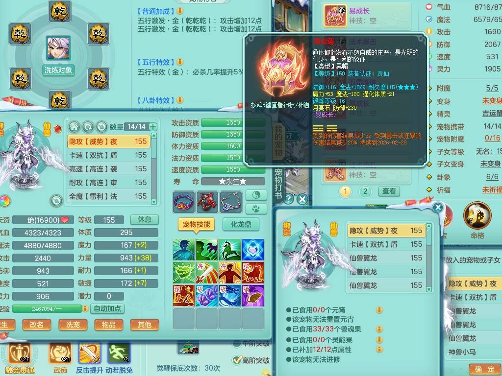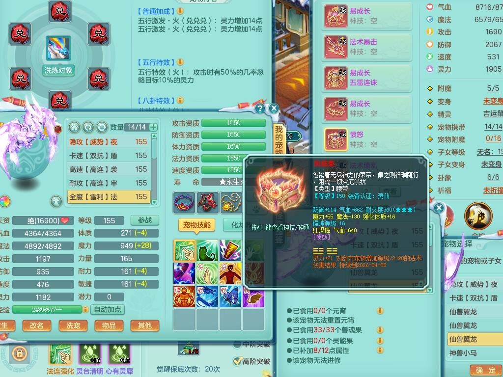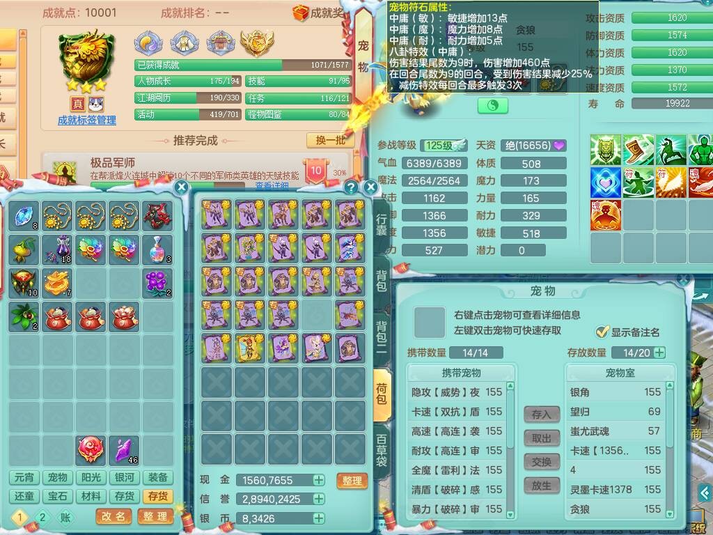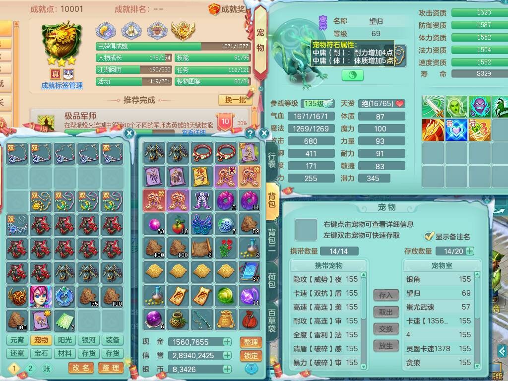 20-9882,2020区159男龙宫精灵怒,5龙2龙皮,4内胆神,1破镜,【8只觉醒,已潜龙】,1宠皮,4位靓号,3只六技能镜花灵,1只6技能龙姬,1特殊(锤子),法爆单加53武器,266易成长单加55项链,易成长五雷衣服,法缭鞋,有回春武器,封锁慈航单加52武器,5.5基础鼎+70攻,280血,9个纯六字,1个五字,15只满果子,宠排在榜,仓库46神兽内丹碎片,5个坐骑,原始暴龙泰坦+洪荒+西瓜冰武器