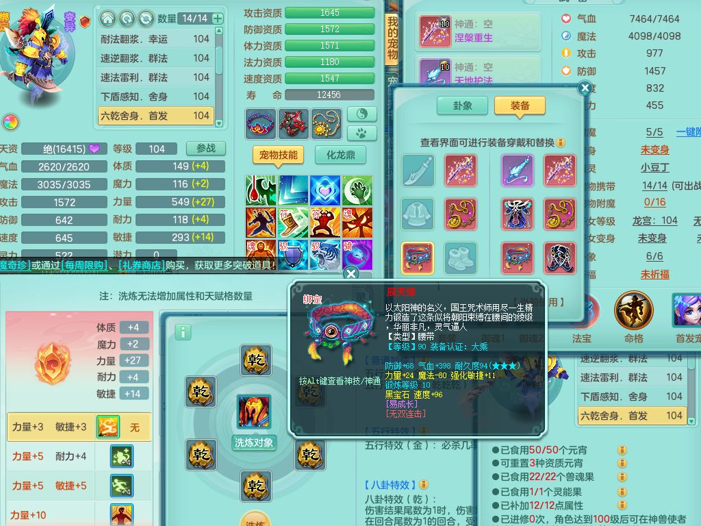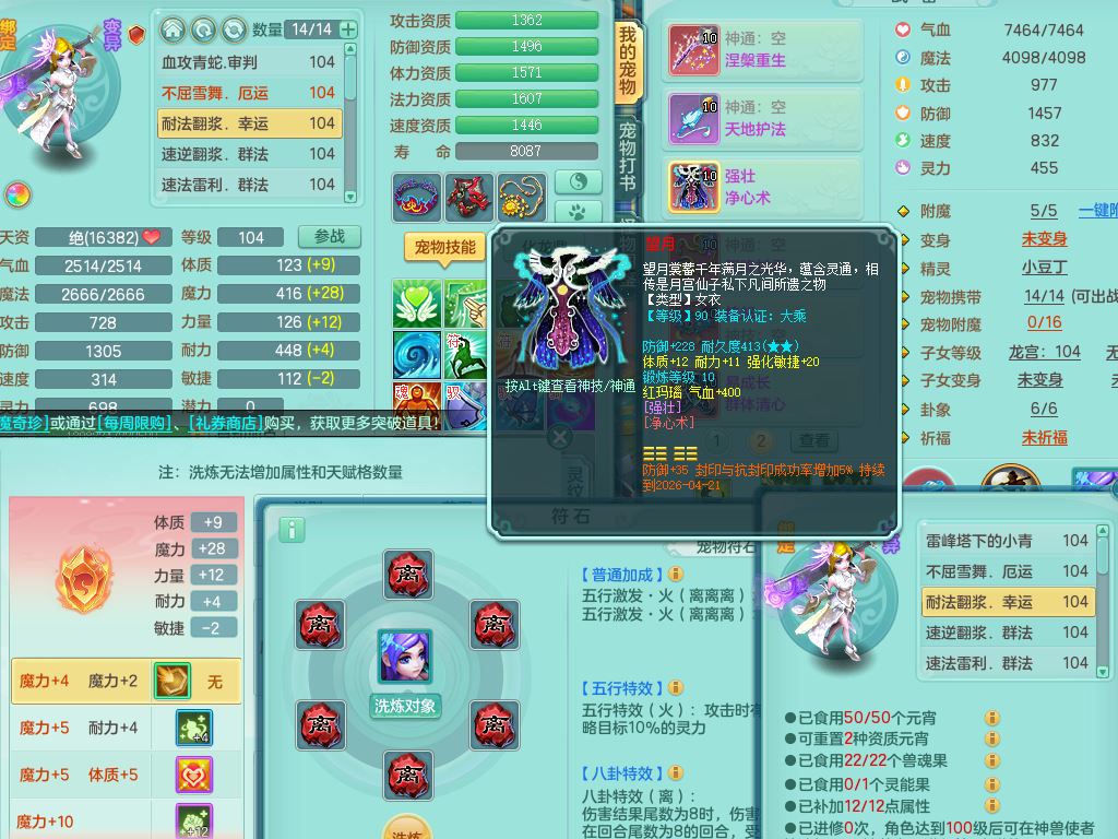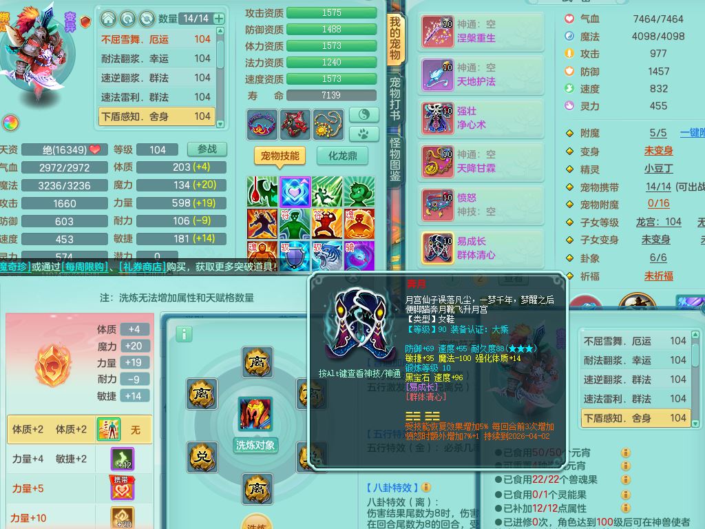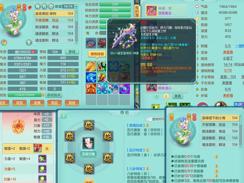 tx10010天下无双99女灵月【潜龙号+西瓜冰】双系精灵,1龙(换)1内1破境1皮,19只满果子13觉醒9个纯6字,8红愤怒5特,强壮双红衣服,单加Y玉清鞋,鼎2.5+42+168,2套符石,157天月卡,庭院187,永久外观精灵皮肤,37内丹碎片,宠排在榜,飞行双人坐骑