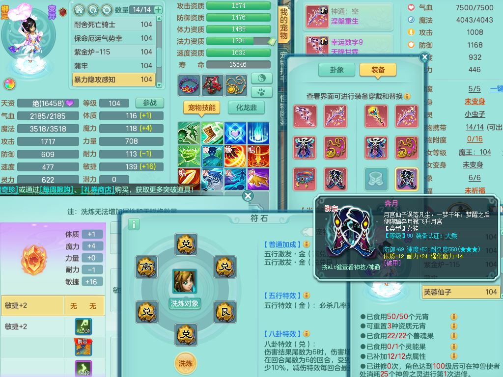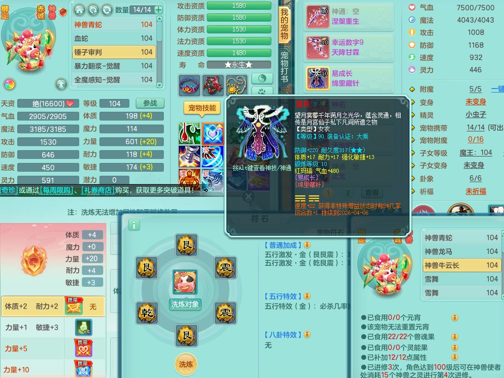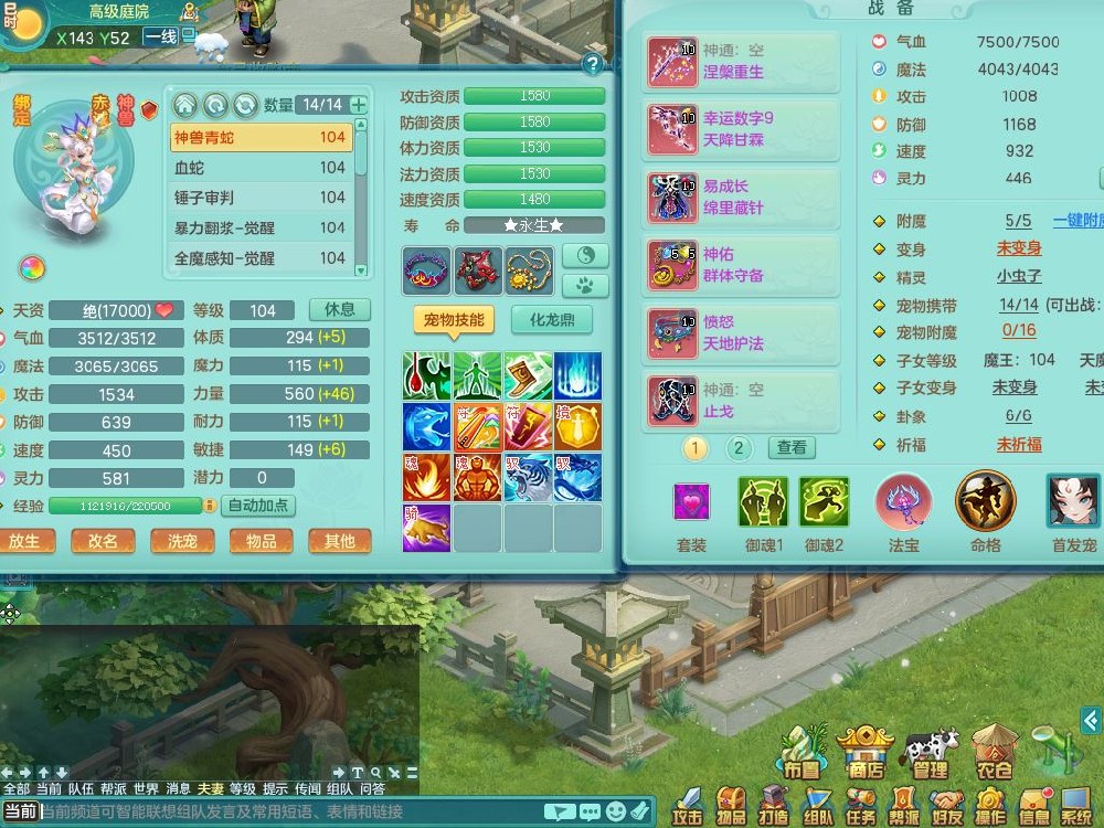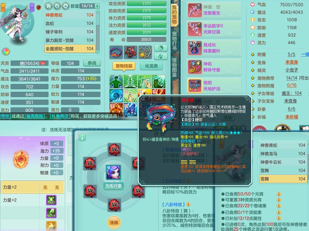 tx10011天下无双99女盘丝双系精灵,3内丹神(1青蛇1龙马)1破境,17只满果子5觉醒5个纯6字,10红愤怒6特,幸运四海武器,Y笑里衣服,神佑群体守备,愤怒罗汉腰带,物理551单加狂暴武器,崩山衣服,Y破血头,破甲鞋,鼎3.0+42+168,2套符石,31天月卡,庭院154房屋191,永久外观精灵皮肤,45内丹碎片,飞行双人坐骑