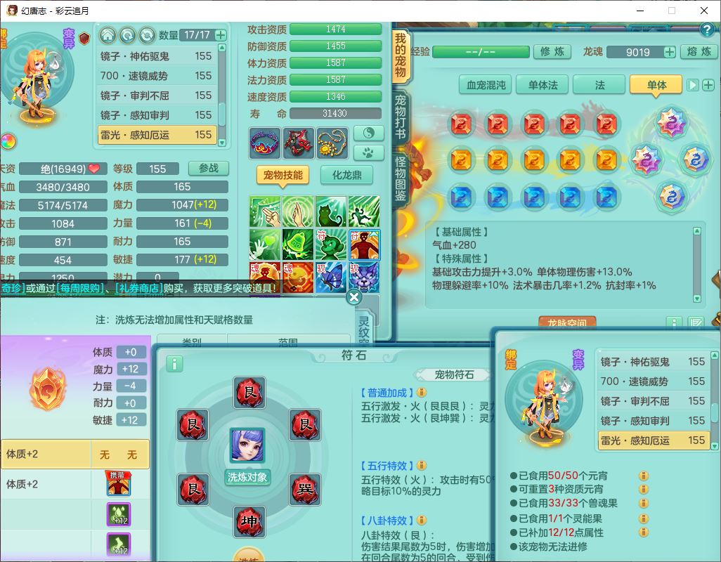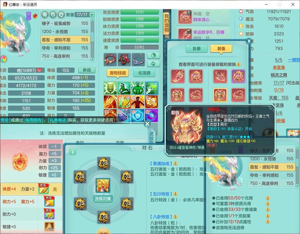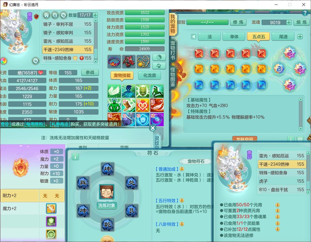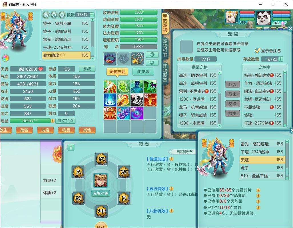 cy10035彩云追月159男灵月【潜龙+马到成功+暴龙逍客】精灵舞,8位靓号,4龙(换、1破境)2内(1龙马)1望归4镜花6特殊(夺命、雷光、舍身,堕天、以战、墨守兽决)1金炉,8觉醒3宠皮11六字1五字5四字21只满果子,9红装备,幸运回春武器,愤怒疾速腰带,Y激励鞋子,有物理装,狂暴四海武器,Y腰带,Y帽子,神佑项链,鼎5.5+70+280,2套符石,119天月卡,永久外观、精灵皮肤,15个内丹碎片,93个兽魂果,8坐骑(2双人飞行),带3个150奶粉