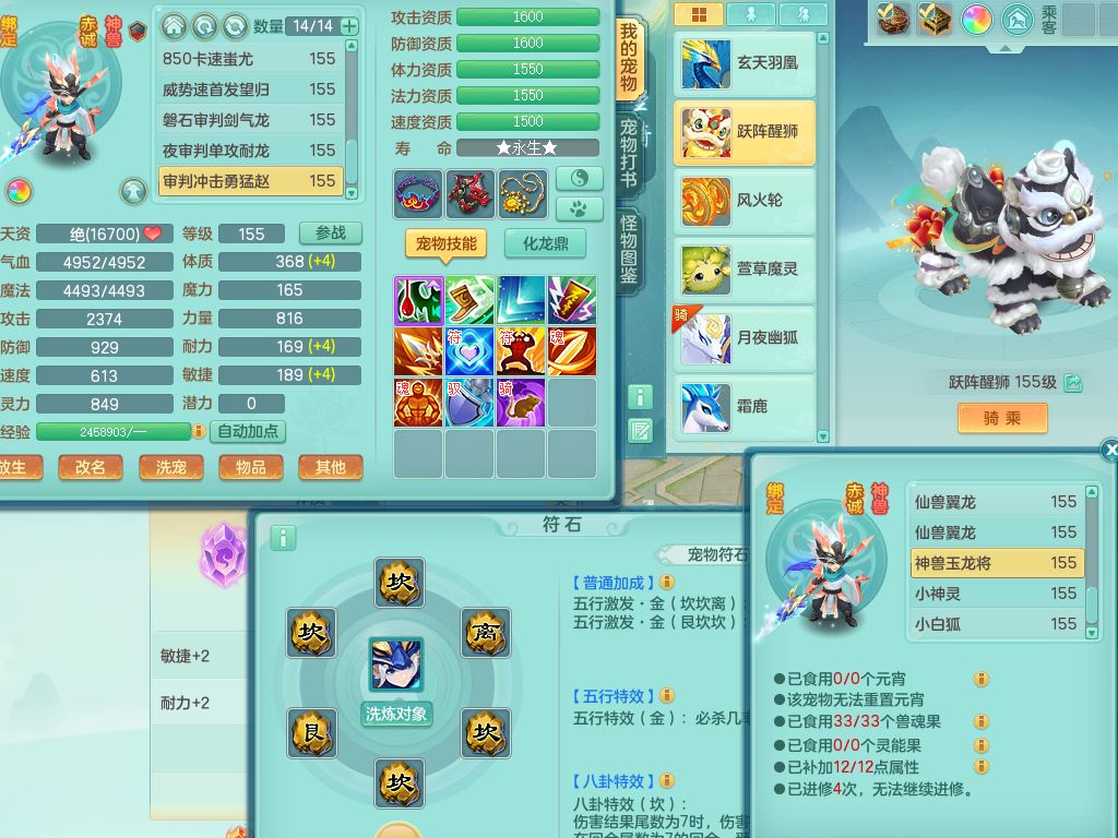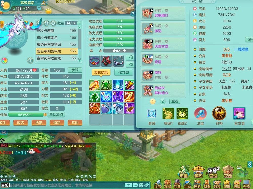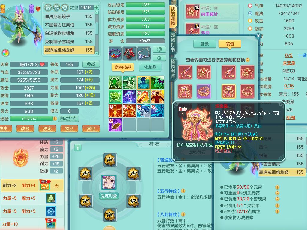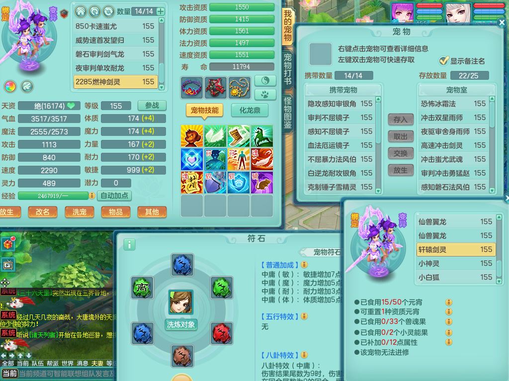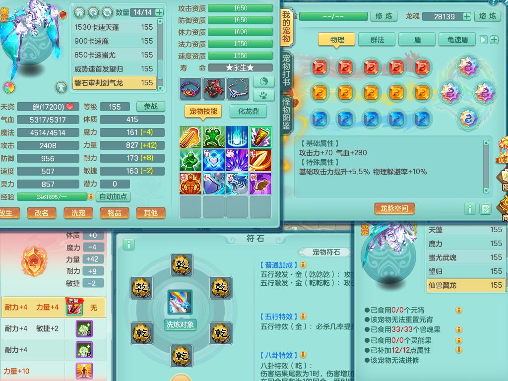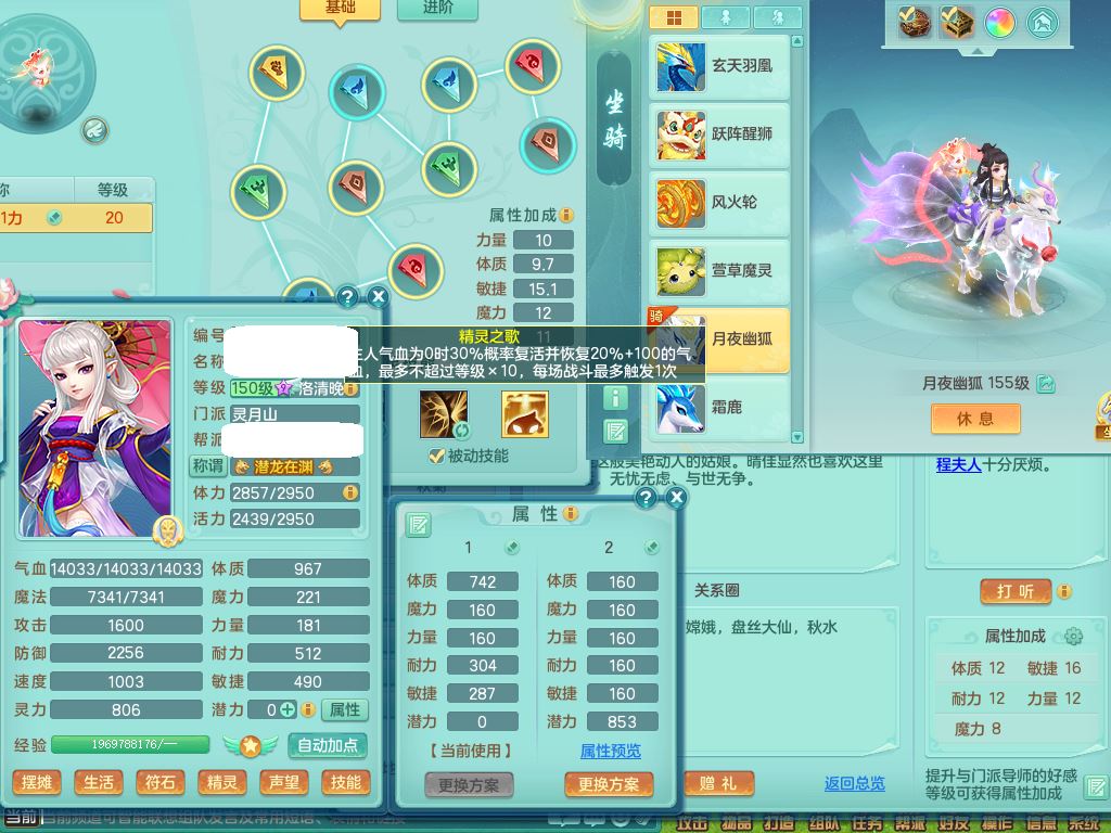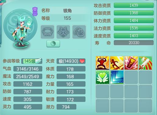 rj10041任剑逍遥159女灵月【潜龙号】精灵歌,4字靓号,2龙(换)2内15皮(4幻灵果)1神兽内丹,9特殊(逆龙/双星/舍身/守护/兽决虎虎/怒破/战争/羽袭/登云)4镜花灵(1胚子)1龙姬,25只满果子15觉醒13个纯6字,愤怒5特,鼎5.5+70+280,庭院162房屋162,永久外观精灵皮肤,5337金币,1057W神武币,宠排在榜,2只双人坐骑,带4个159成品小号,带精灵4技能,装备宝宝都齐全,仓库多存货,都有一千多W神武币