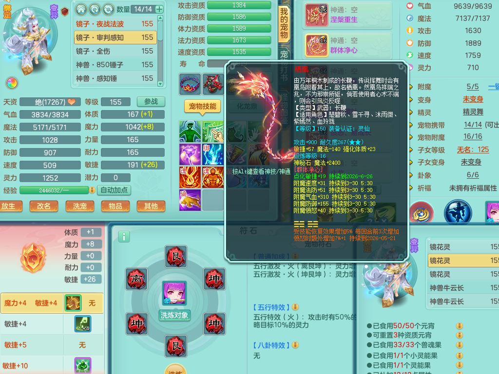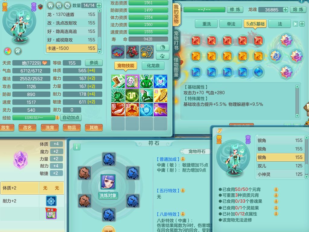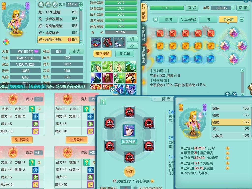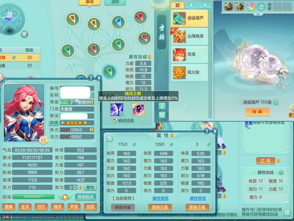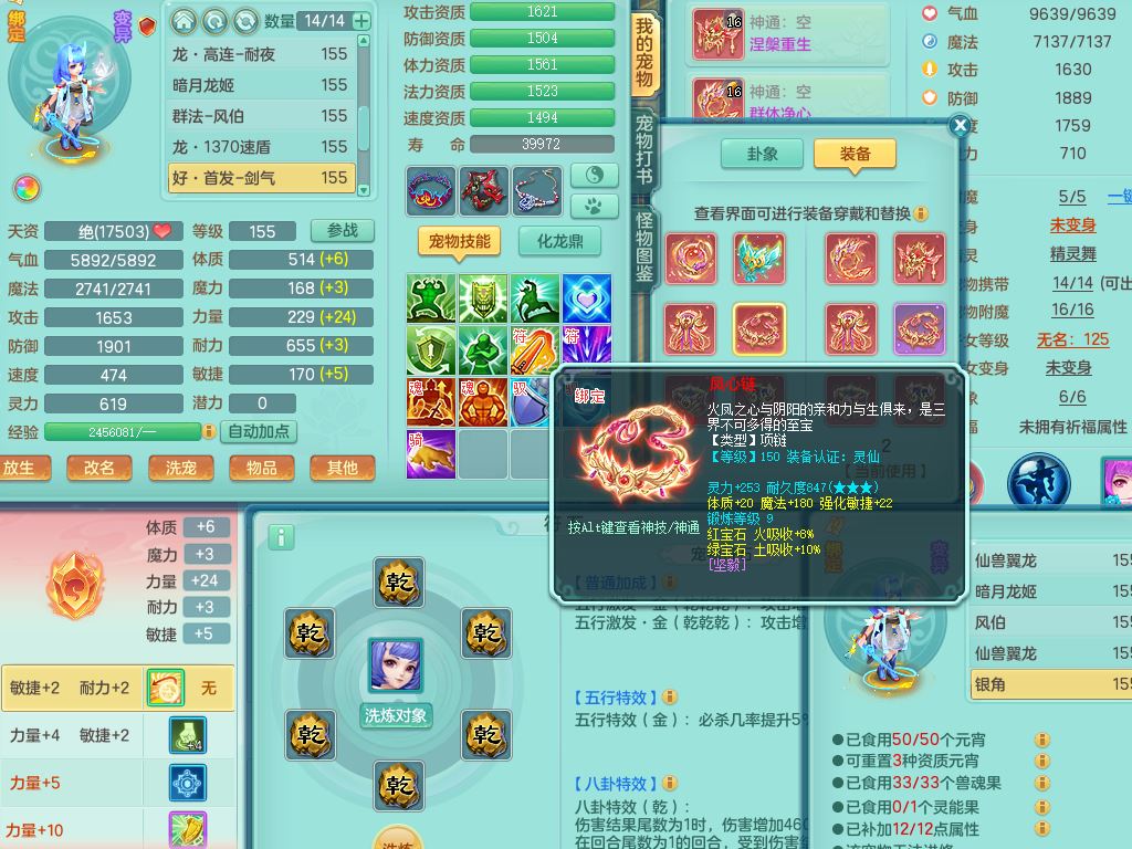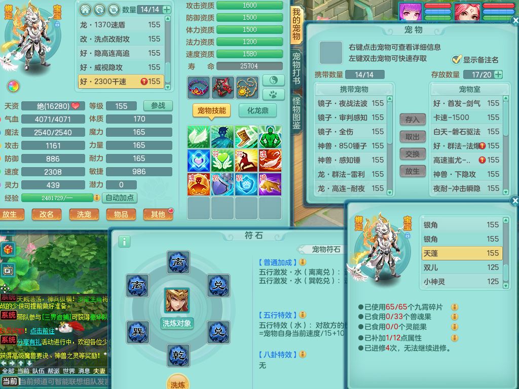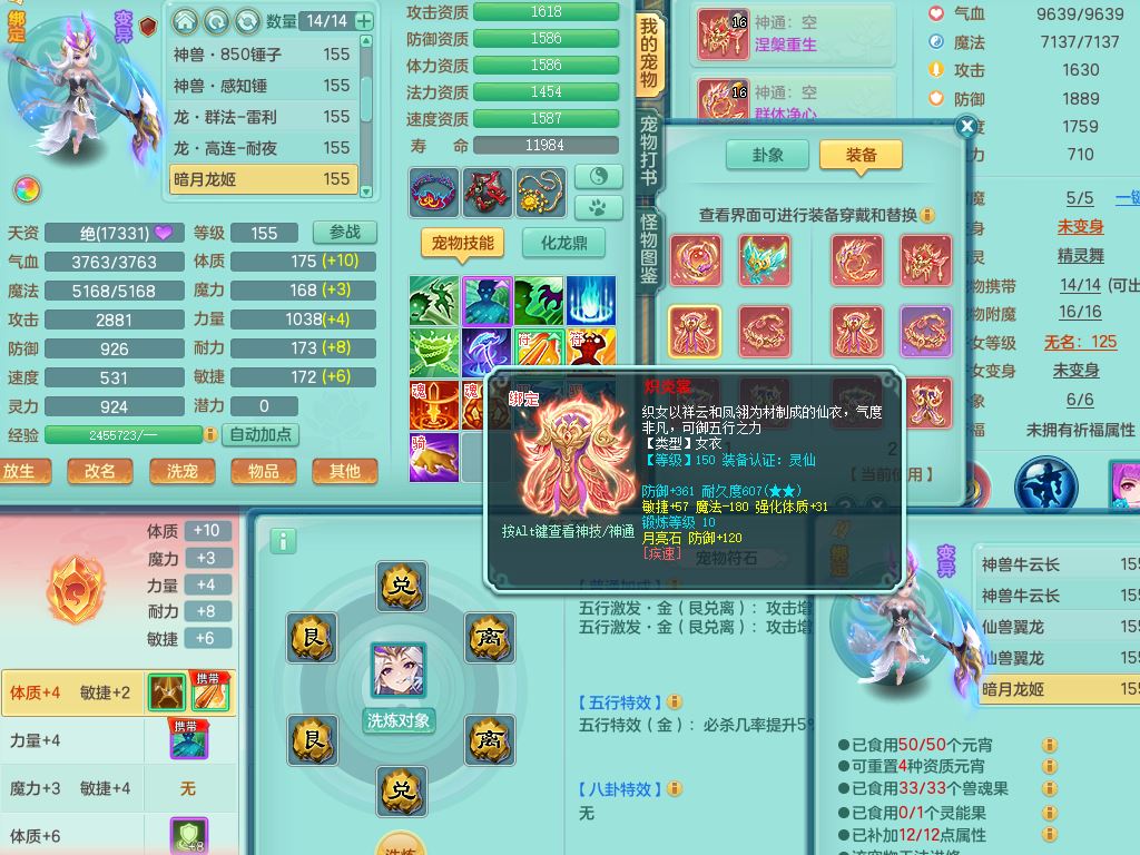 jn10079今年勇159女天魔【潜龙号】精灵舞,2内丹龙1龙(换,无内)3内(1青蛇)特殊(墨守)4镜花灵1龙姬,18只满果子9觉醒7个纯6字,愤怒5特,单加愤怒Y腰带,鼎5.5+70+280,永久外观精灵皮肤,823W神武币,宠排在榜,3坐骑(1只双人)