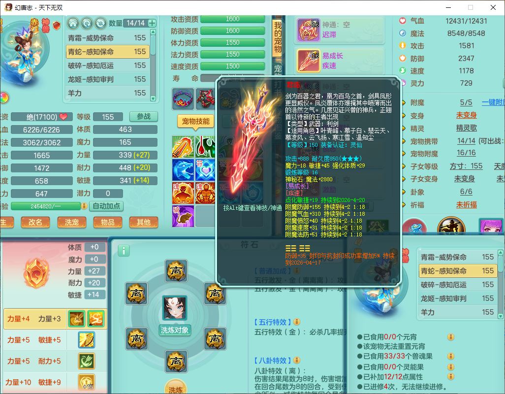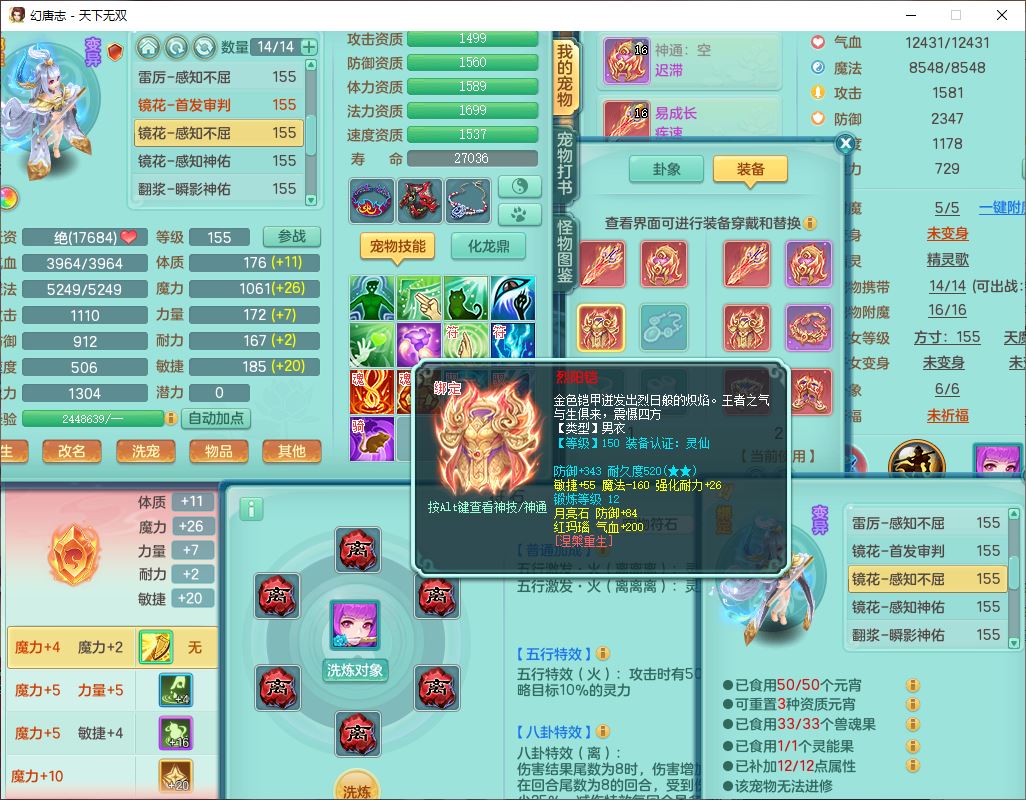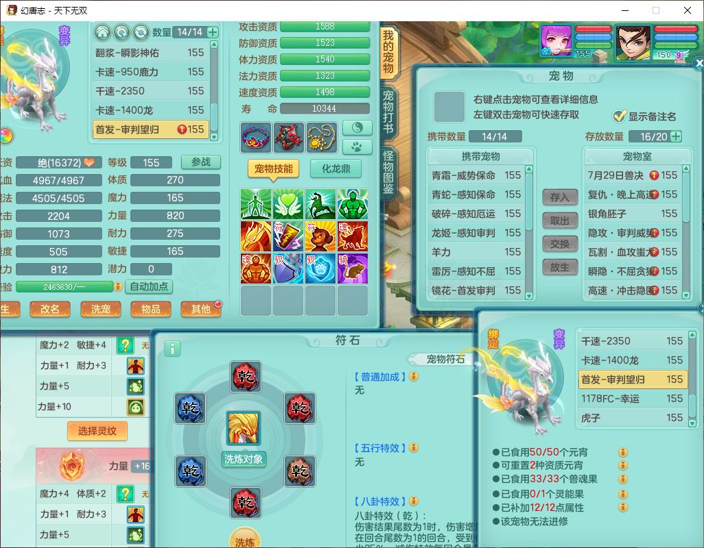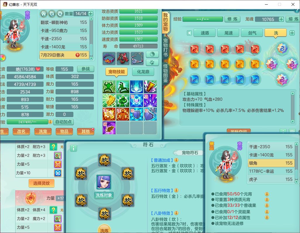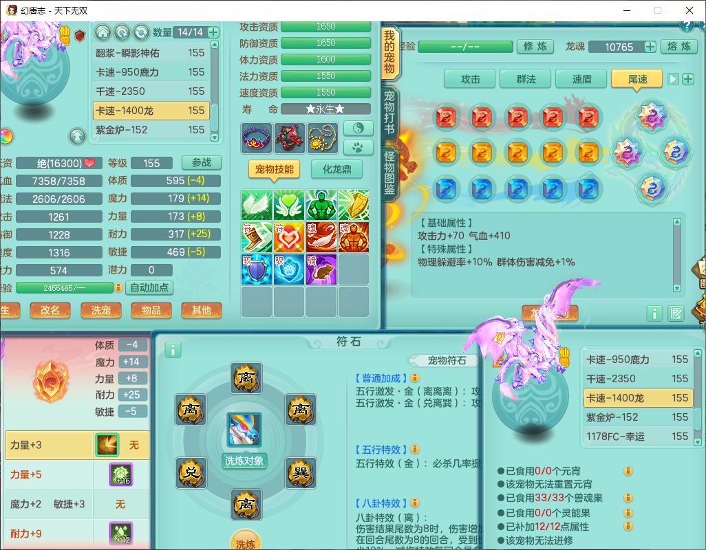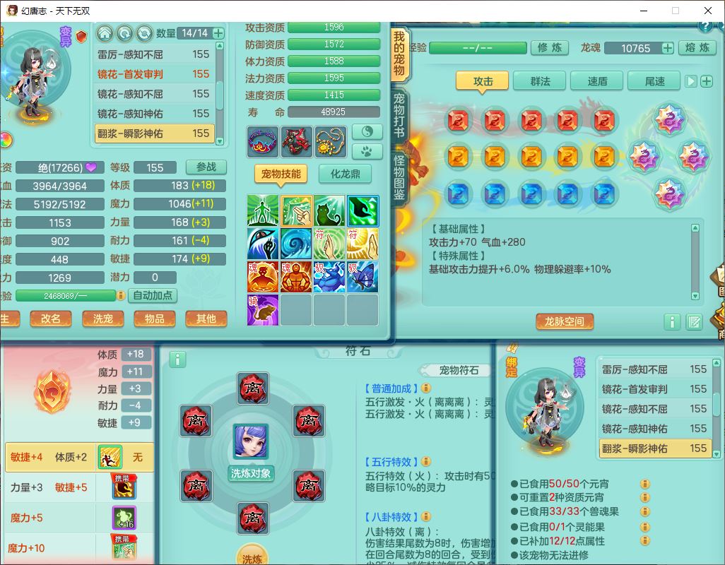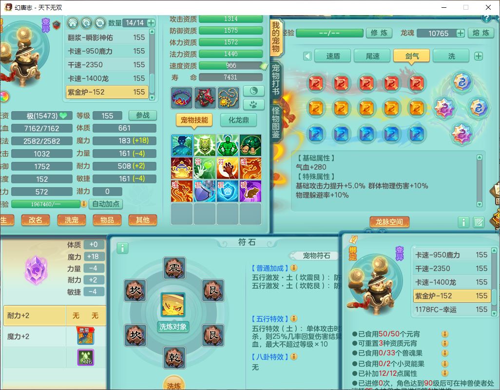 tx10124天下无双159男无量【潜龙+马上发财+暴龙猎手+火焰之力+西瓜冰】精灵歌,1龙无内1内丹青蛇3镜花1望归1龙姬1金炉5特殊(青霜、雷利、翻江,羽袭、破碎兽决),17觉醒1宠皮11六字2五字3四字综合22只满果子,7红装备,Y疾速武器,仓库多装备,回春法术反制武器,封锁武器,封印精通帽子,鼎6.0+70+280,164天月卡,庭院157,永久外观、精灵皮肤,5坐骑(1双人飞行)